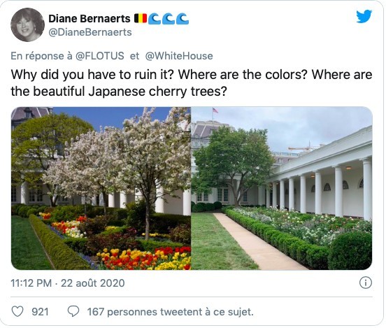В Твиттере сравнивали две версии розария: "Можем ли мы говорить о том, что розарий Джеки Кеннеди был красочным, разнообразным и красивым, а Мелания просто сделала его ... белым?" Многие также были возмущены вырубкой сакуры, которую сажала еще Джеки Кеннеди: "Почему вы все испортили? Где цвета? Где красивые японские вишни?"