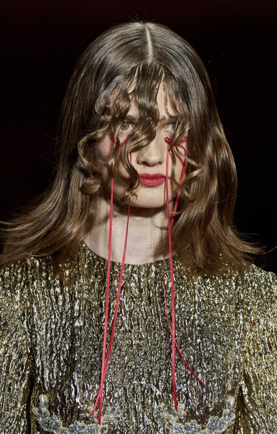 Искрящиеся ткани, красный и золотой цвет, кружево — то, на что был сделан акцент в коллекции. Не обошлось и без ДНК-бренда — отложные воротнички, рукава-фонарики и банты все так же на месте. Изюминкой показа стали красные ленты, ниспадающие с волос, одежды, а иногда и глаз, — они символизировали кровь, которой традиционно мазали лица детей, чтобы отогнать злых духов и неудачи.