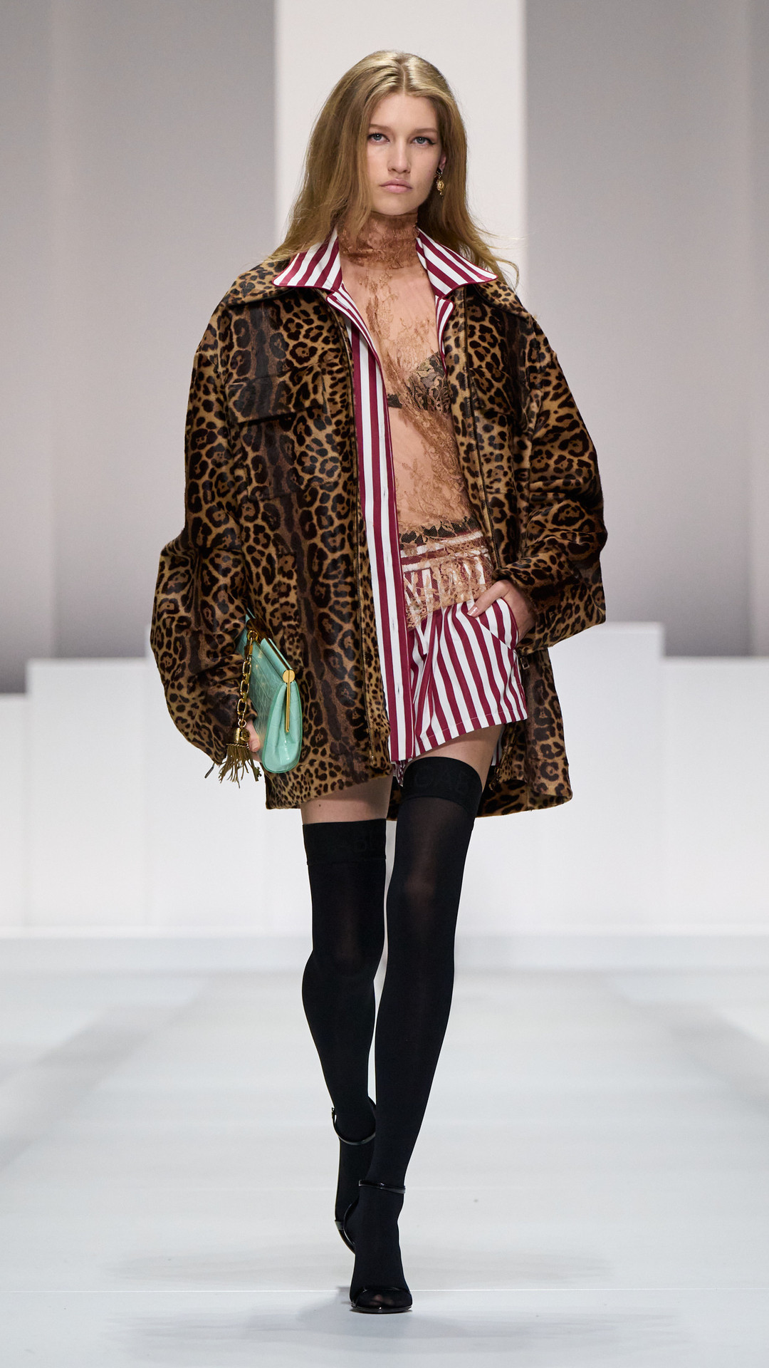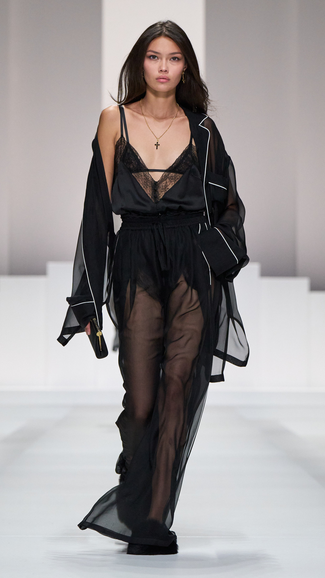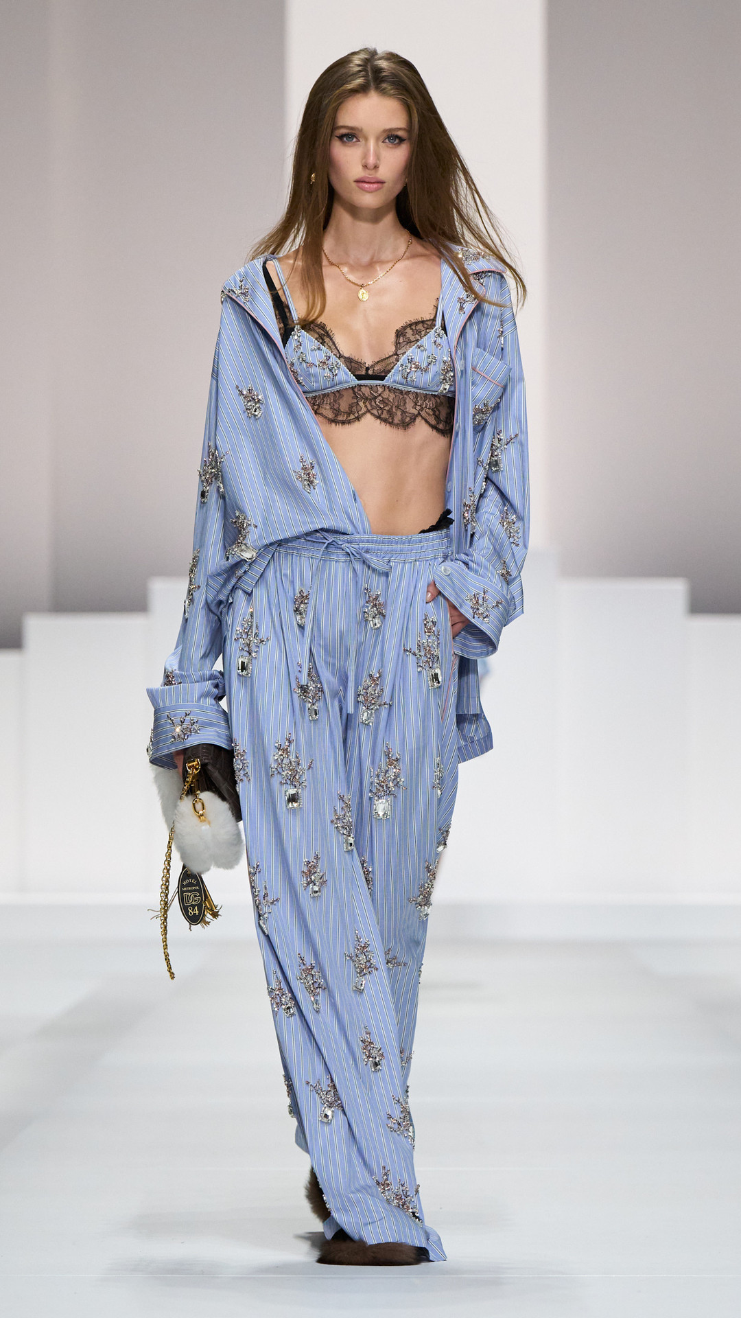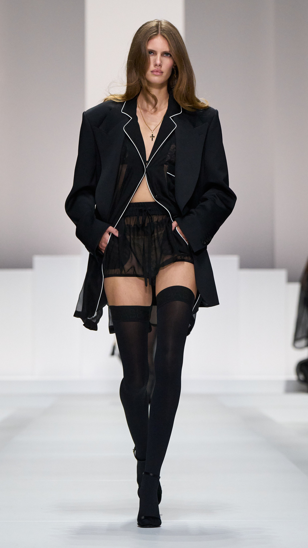 Основой показа стала пижама — предмет, предельно простой и домашний, но в интерпретации Доменико Дольче и Стефано Габбана превращенный в символ роскоши. Полосатый хлопок оживал за счет вышивки и кристаллов, сочетался с кружевным бельем и строгими жакетами, а порой уступал место прозрачному шифону или черным колготкам — отсылкой к показам конца 1980-х, когда по подиуму шествовали Линда Евангелиста и Кристи Терлингтон. Дополнением этим образам служили пушистые тапочки, которые легко сменялись сатиновыми шпильками.