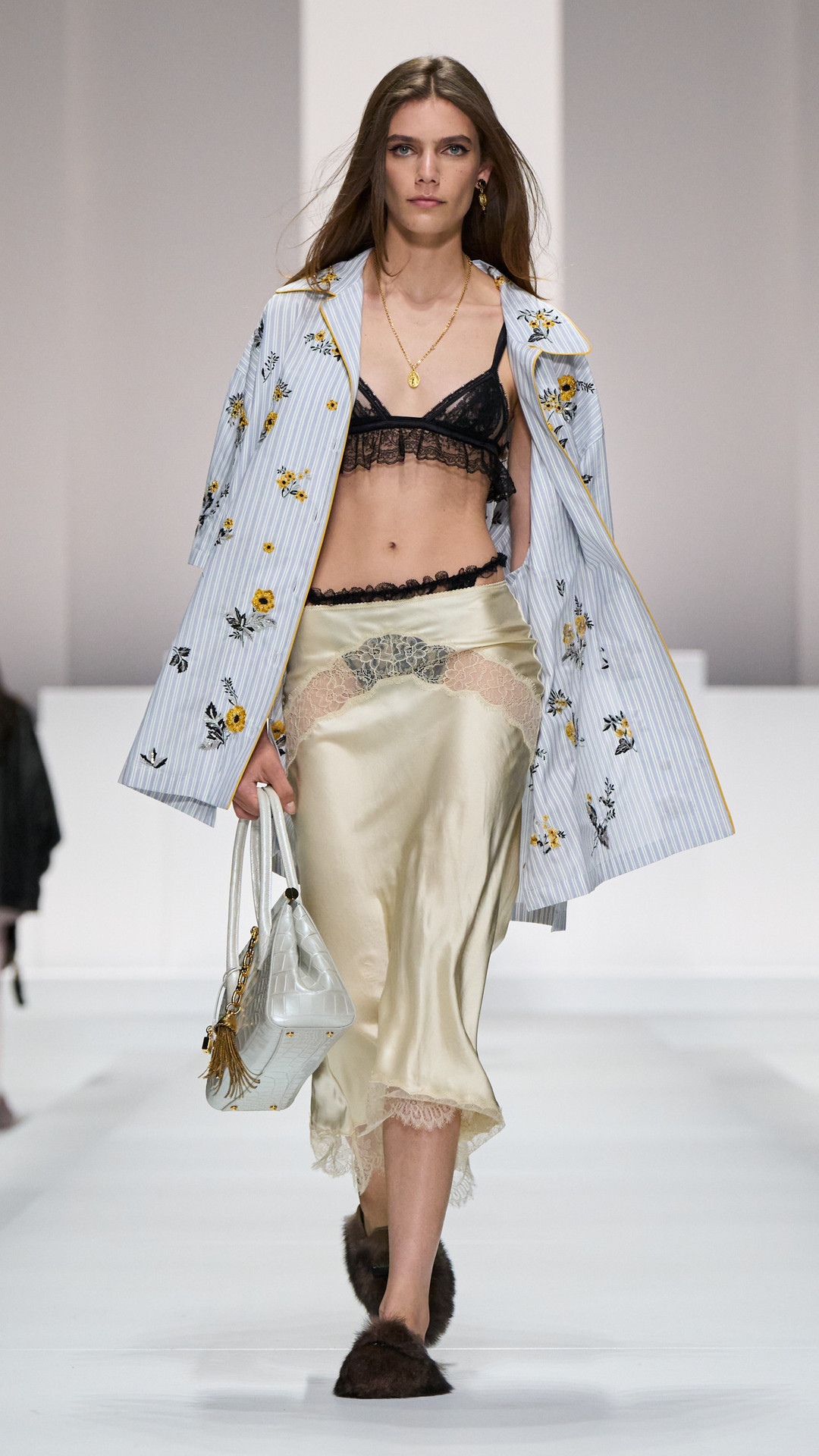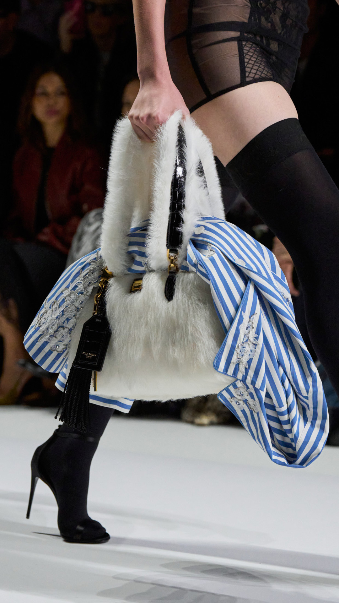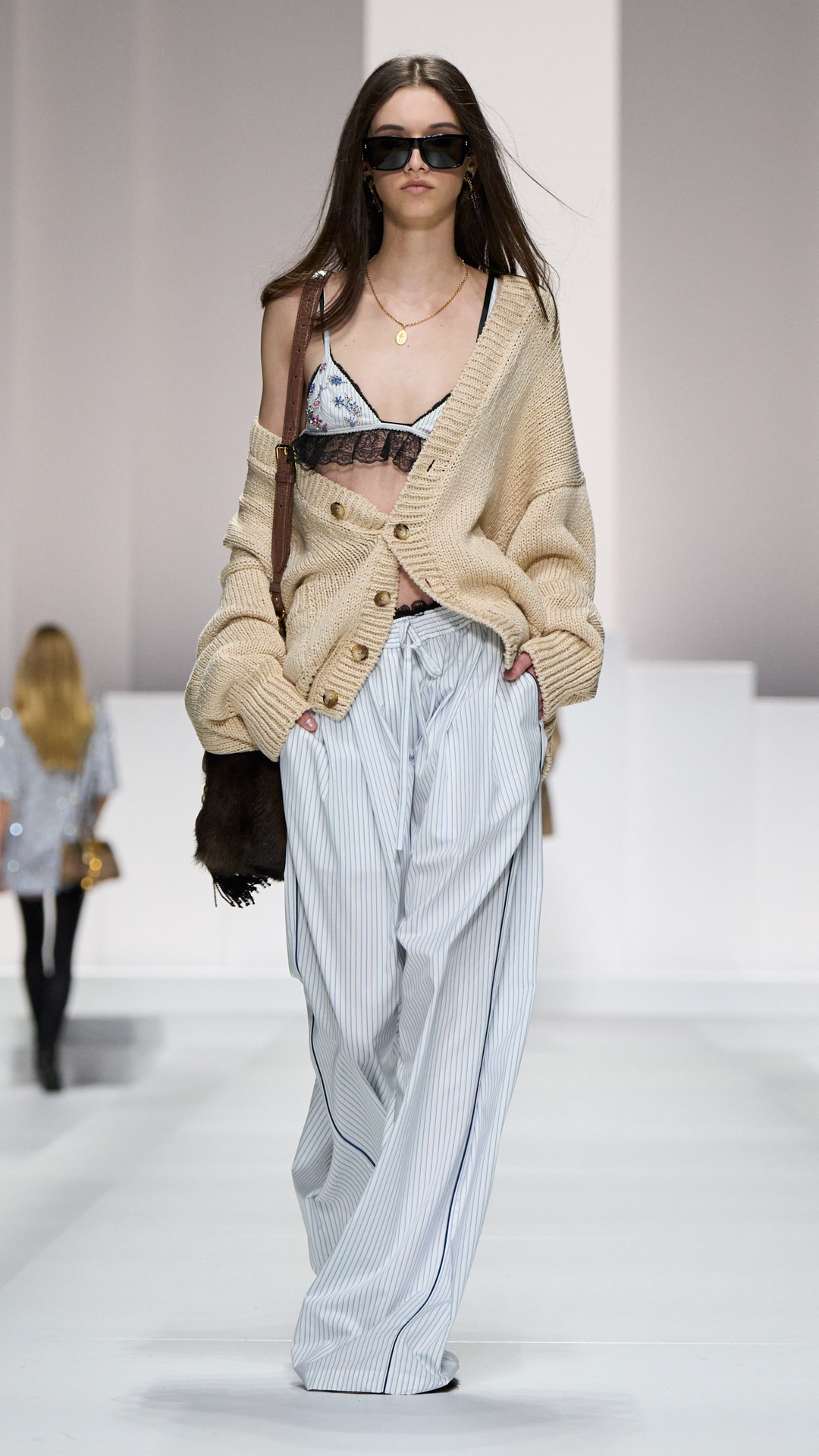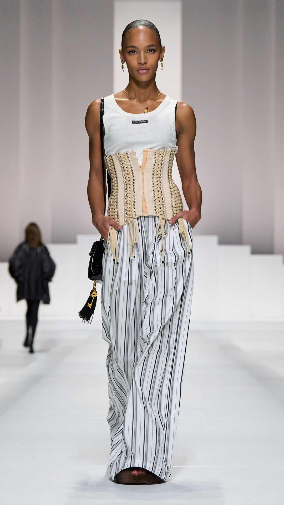 Основой показа стала пижама — предмет, предельно простой и домашний, но в интерпретации Доменико Дольче и Стефано Габбана превращенный в символ роскоши. Полосатый хлопок оживал за счет вышивки и кристаллов, сочетался с кружевным бельем и строгими жакетами, а порой уступал место прозрачному шифону или черным колготкам — отсылкой к показам конца 1980-х, когда по подиуму шествовали Линда Евангелиста и Кристи Терлингтон. Дополнением этим образам служили пушистые тапочки, которые легко сменялись сатиновыми шпильками.