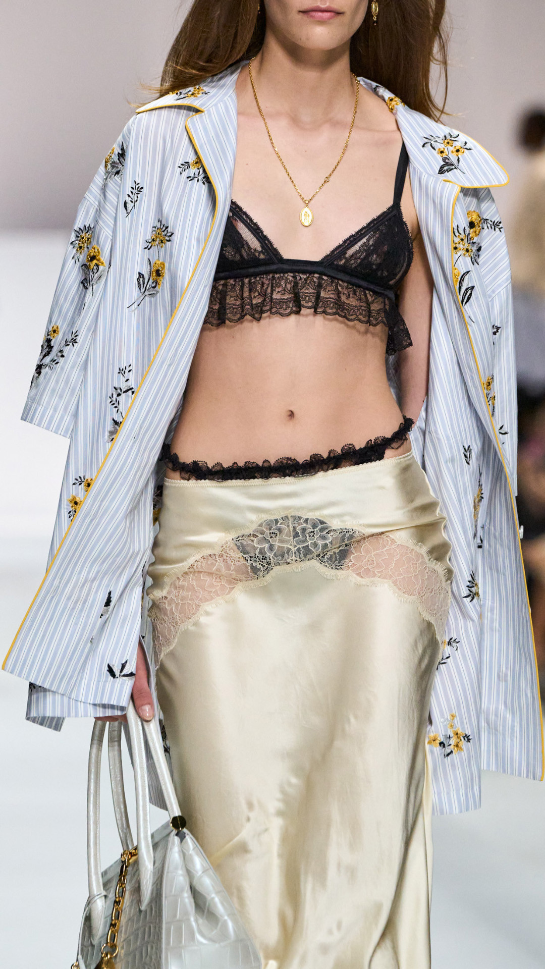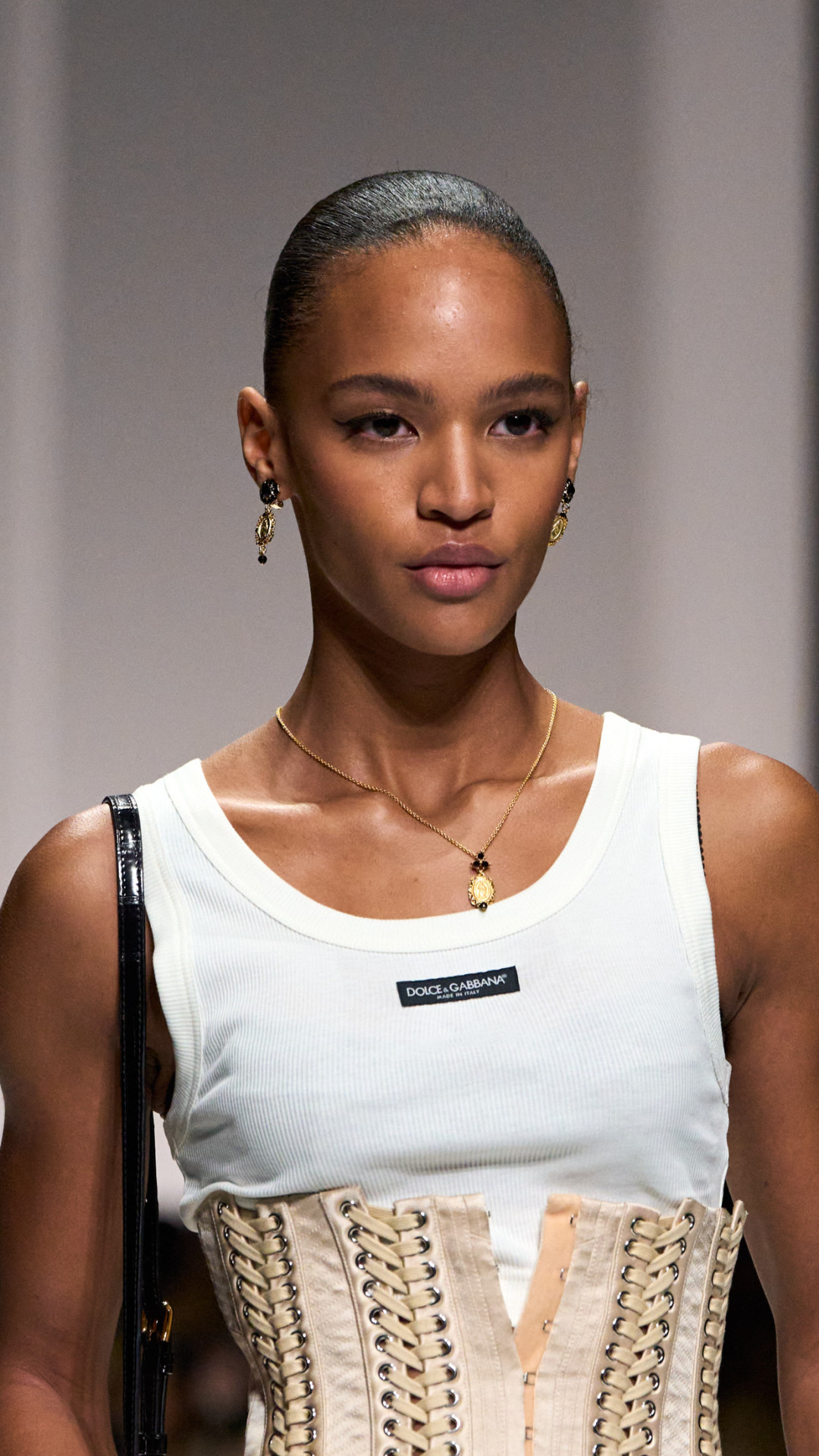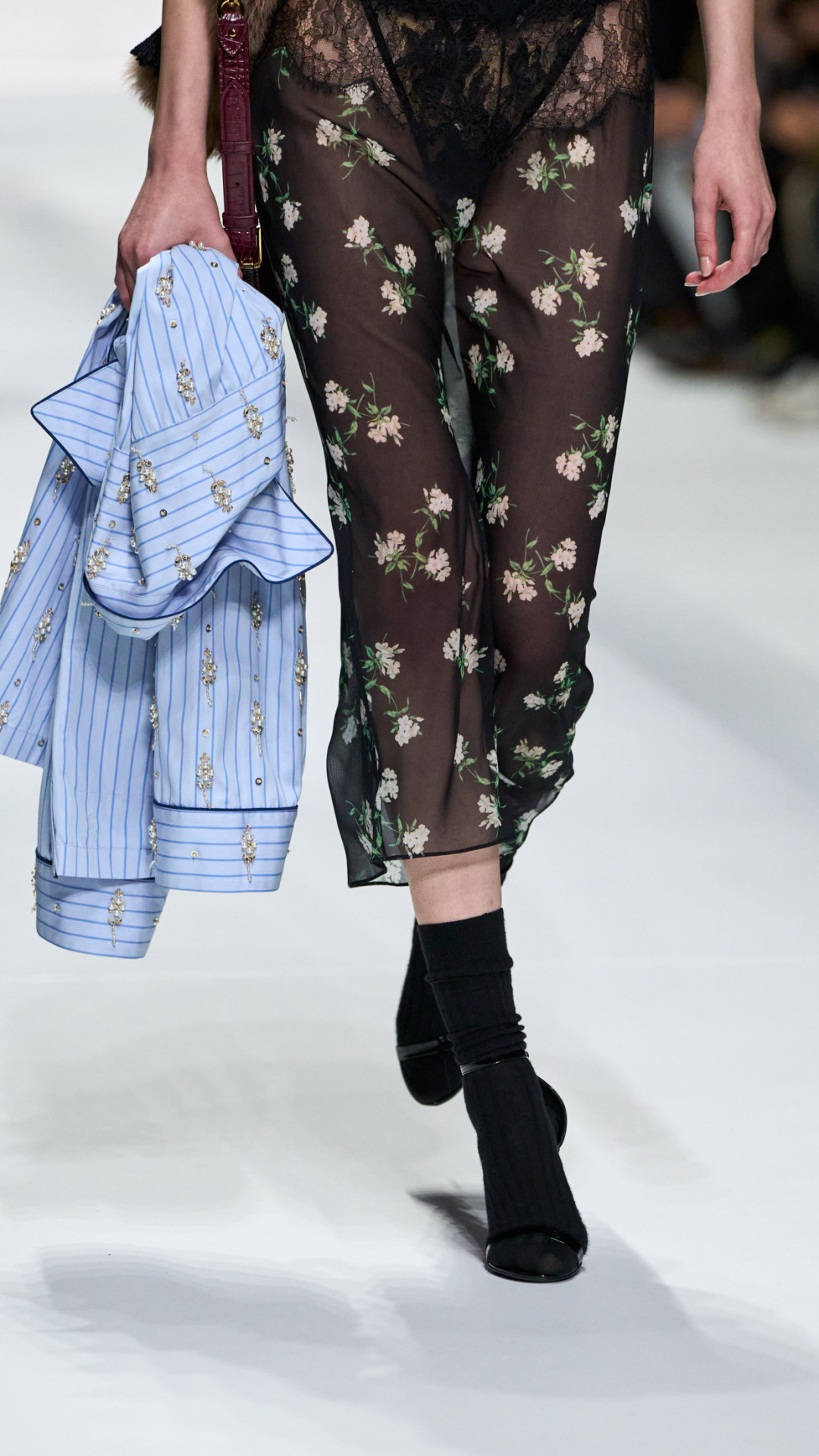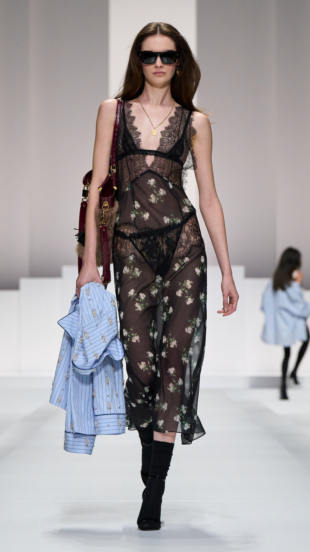 Основой показа стала пижама — предмет, предельно простой и домашний, но в интерпретации Доменико Дольче и Стефано Габбана превращенный в символ роскоши. Полосатый хлопок оживал за счет вышивки и кристаллов, сочетался с кружевным бельем и строгими жакетами, а порой уступал место прозрачному шифону или черным колготкам — отсылкой к показам конца 1980-х, когда по подиуму шествовали Линда Евангелиста и Кристи Терлингтон. Дополнением этим образам служили пушистые тапочки, которые легко сменялись сатиновыми шпильками.