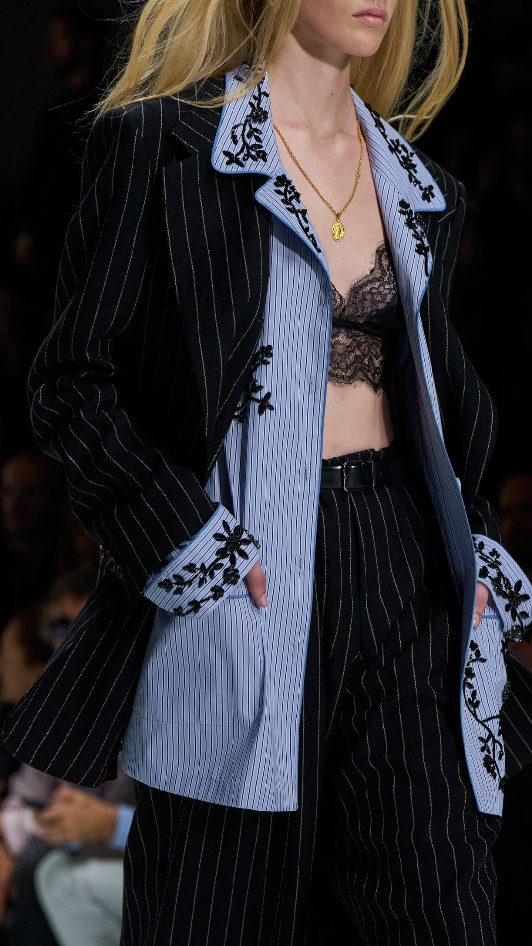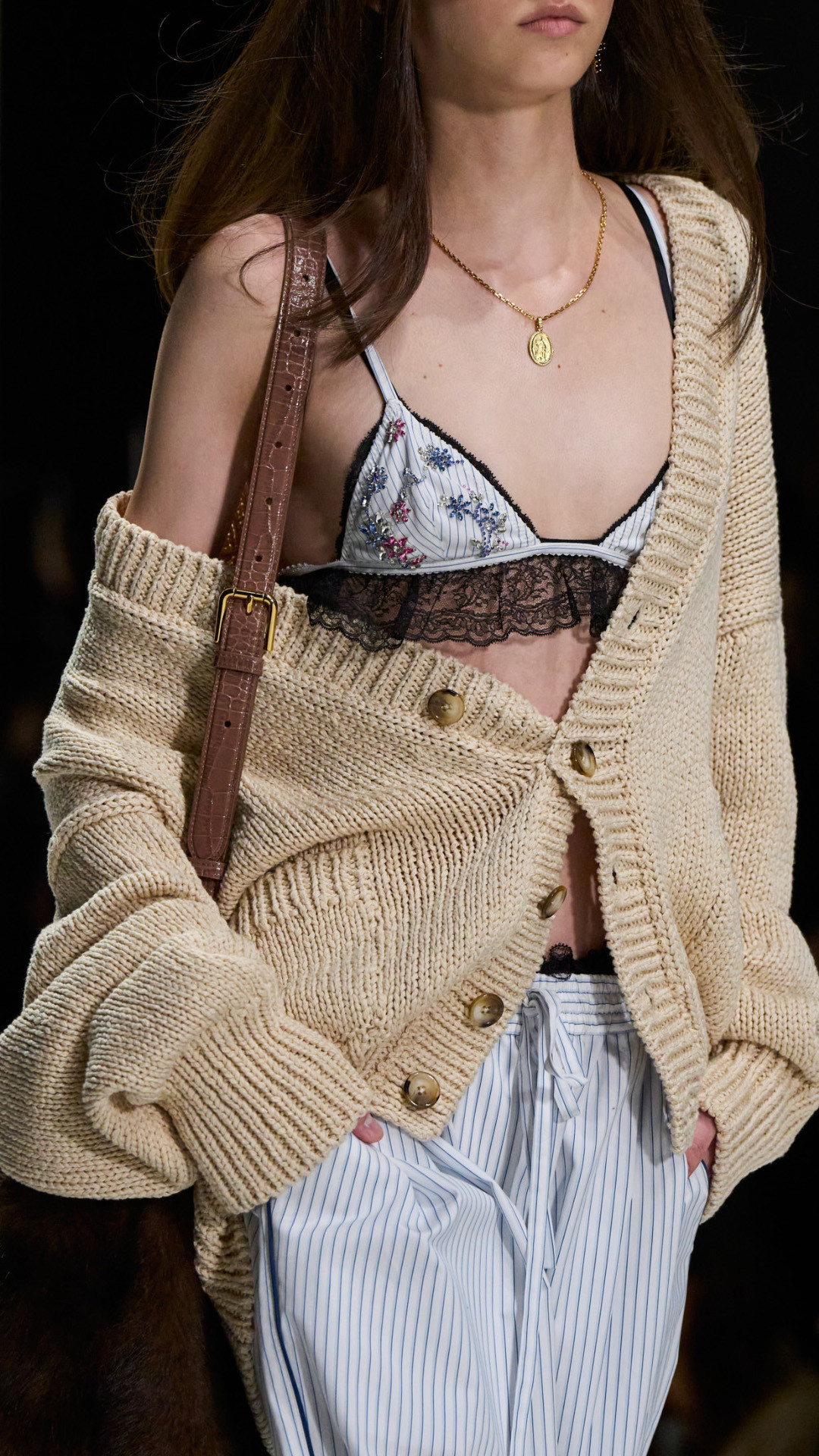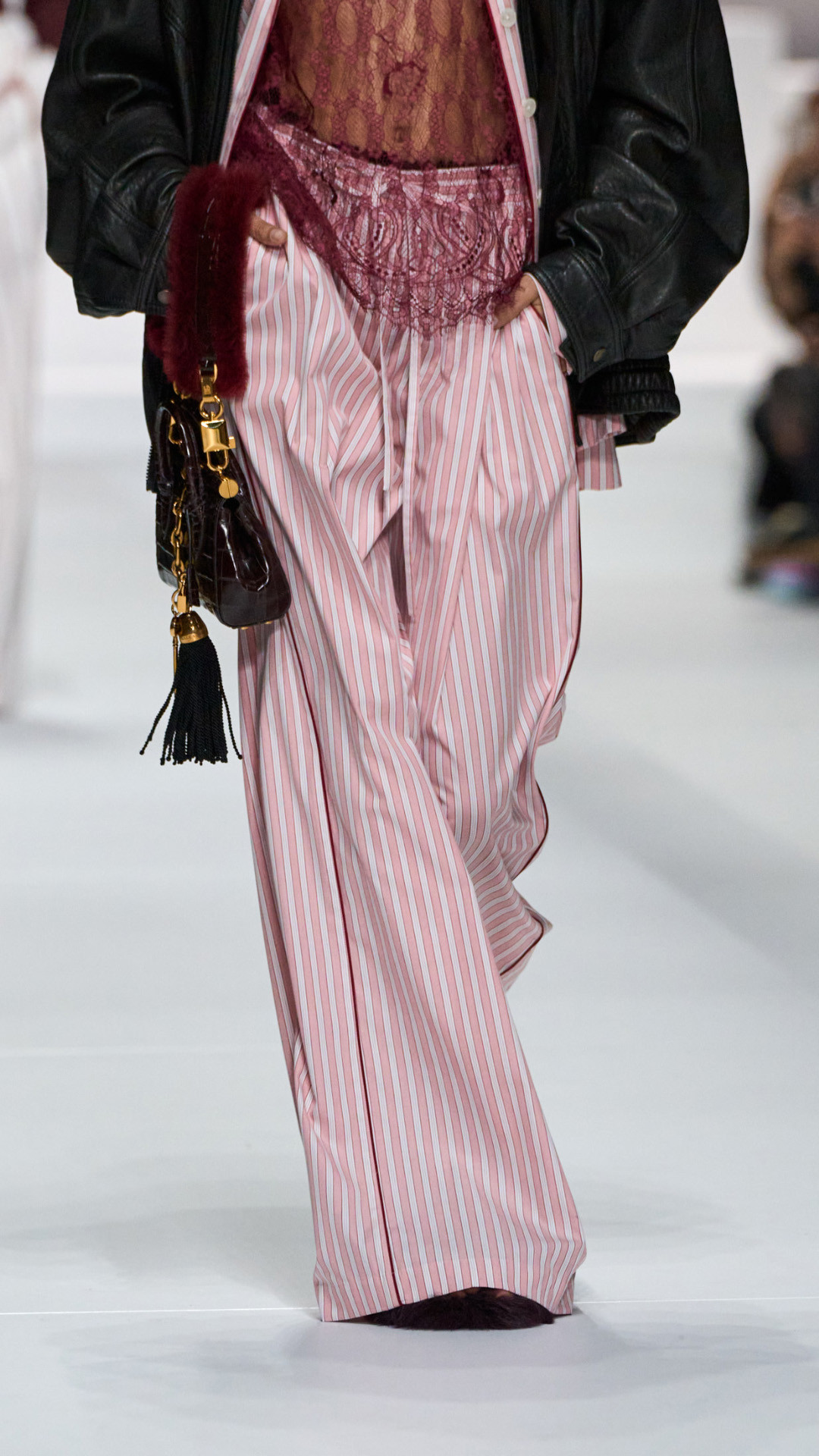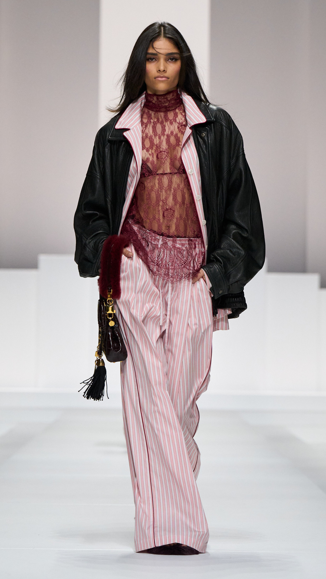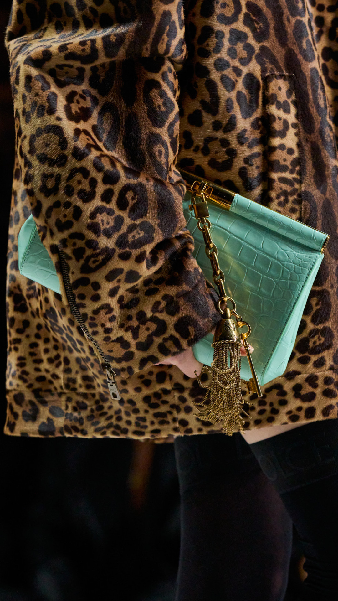 Не обошлось и без одного из главных трендов сезона — искусственного меха. Леопардовое пальто, розовая макси-шуба и целый ряд аксессуаров — почти половина из 66 выходов была построена на «меховом» присутствии, что полностью соответствует политике бренда Fur-Free, принятой в 2022 году.