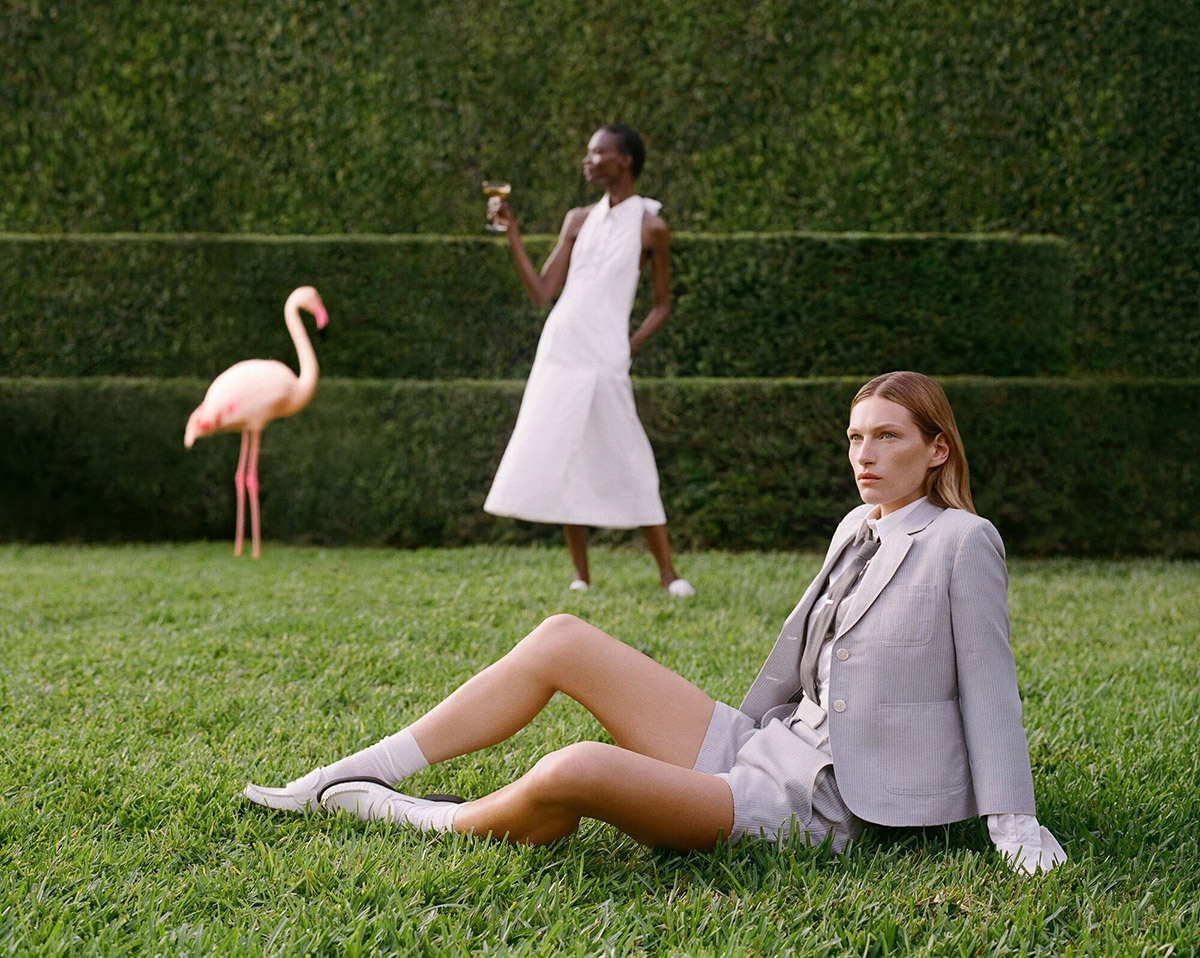 Съемка прошла в Troutbeck — старинном поместье в Амении, где обычно проводят уикенды те, кто хочет хоть ненадолго выдохнуть от городского ритма. Среди гостей? Ребекка Холл, Шон Кауфман, Минни Миллс и Сидни Леммон. Они гуляют по лужайкам, ловят рыбу, играют в крокет и, конечно, делают это в образах из новой коллекции Thom Browne.