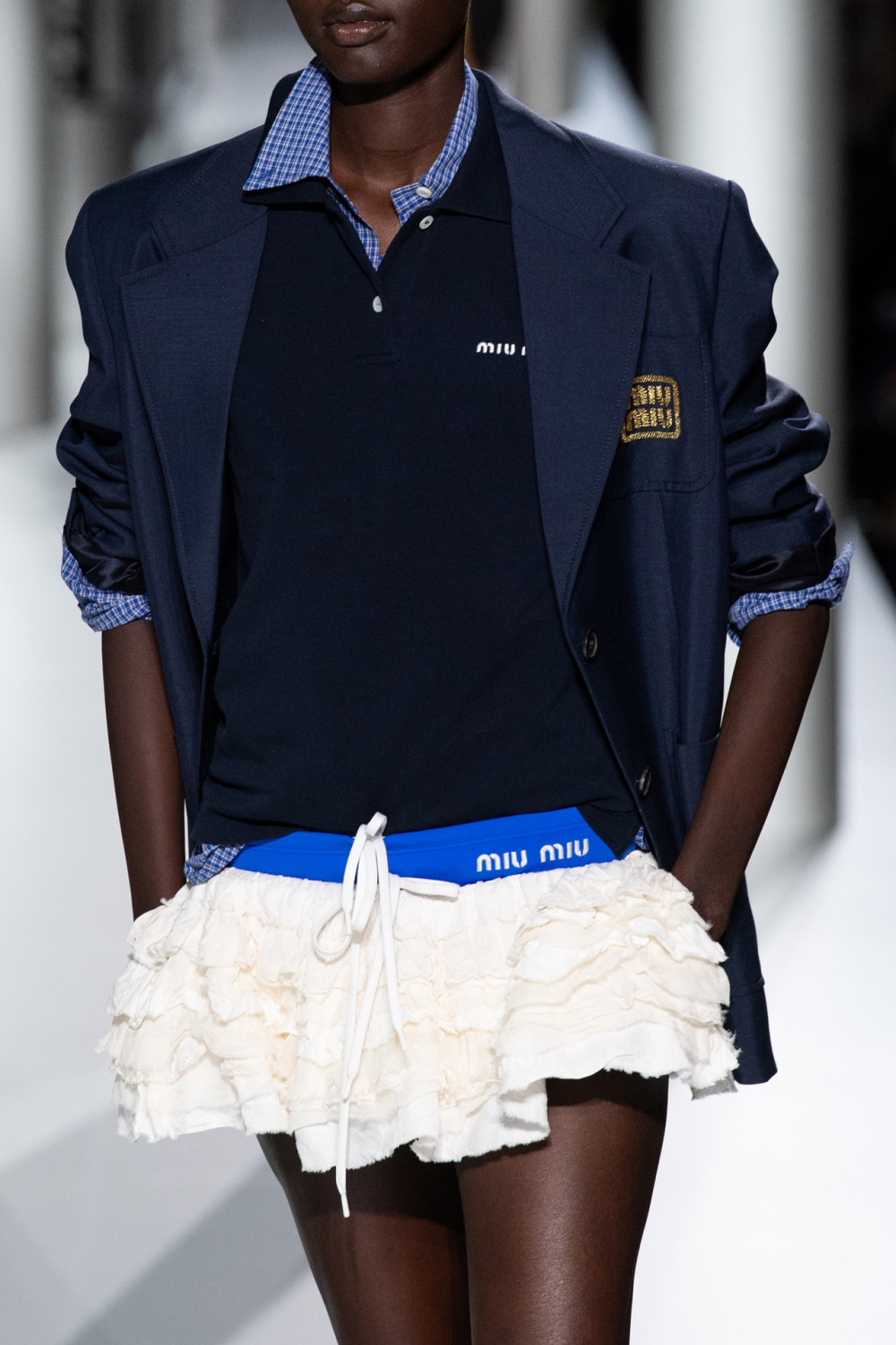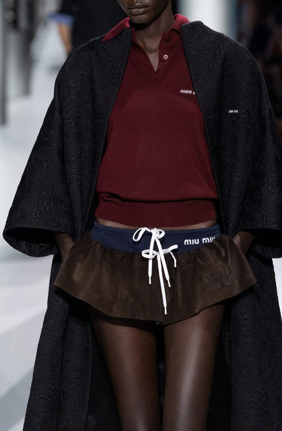 На последнем показе Miu Miu модели выглядят так, словно они отправляются на лекцию после веселой ночи в клубе. Они были одеты в темно-синие, бордовые и белые рубашки-поло. Небрежно и элегантно — так можно описать их образ.