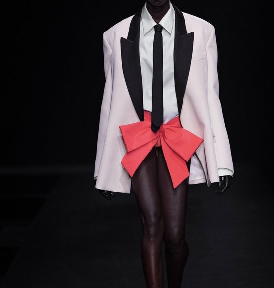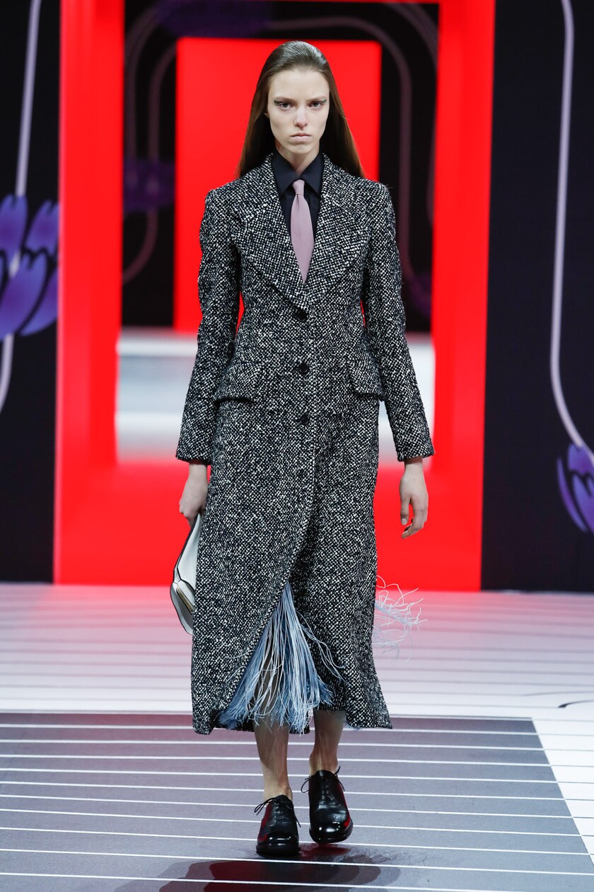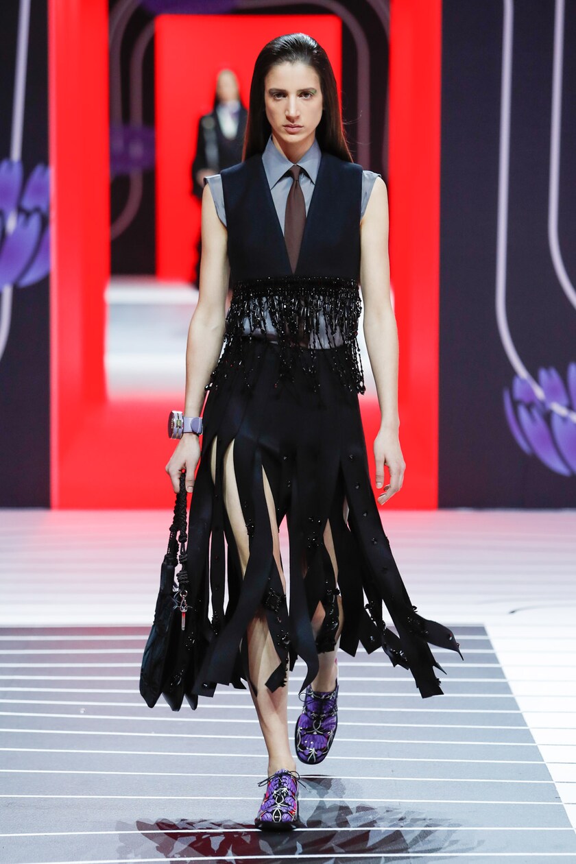 В свою очередь, и Prada продолжил прокладывать путь на модный пьедестал некогда мужскому предмету гардероба. Грань между мужским и женским была стерта, благодаря добавлению одной детали — галстука. Интерпретация бренда не обошлась без игривых ноток — аксессуар был закамуфлирован под цветок.