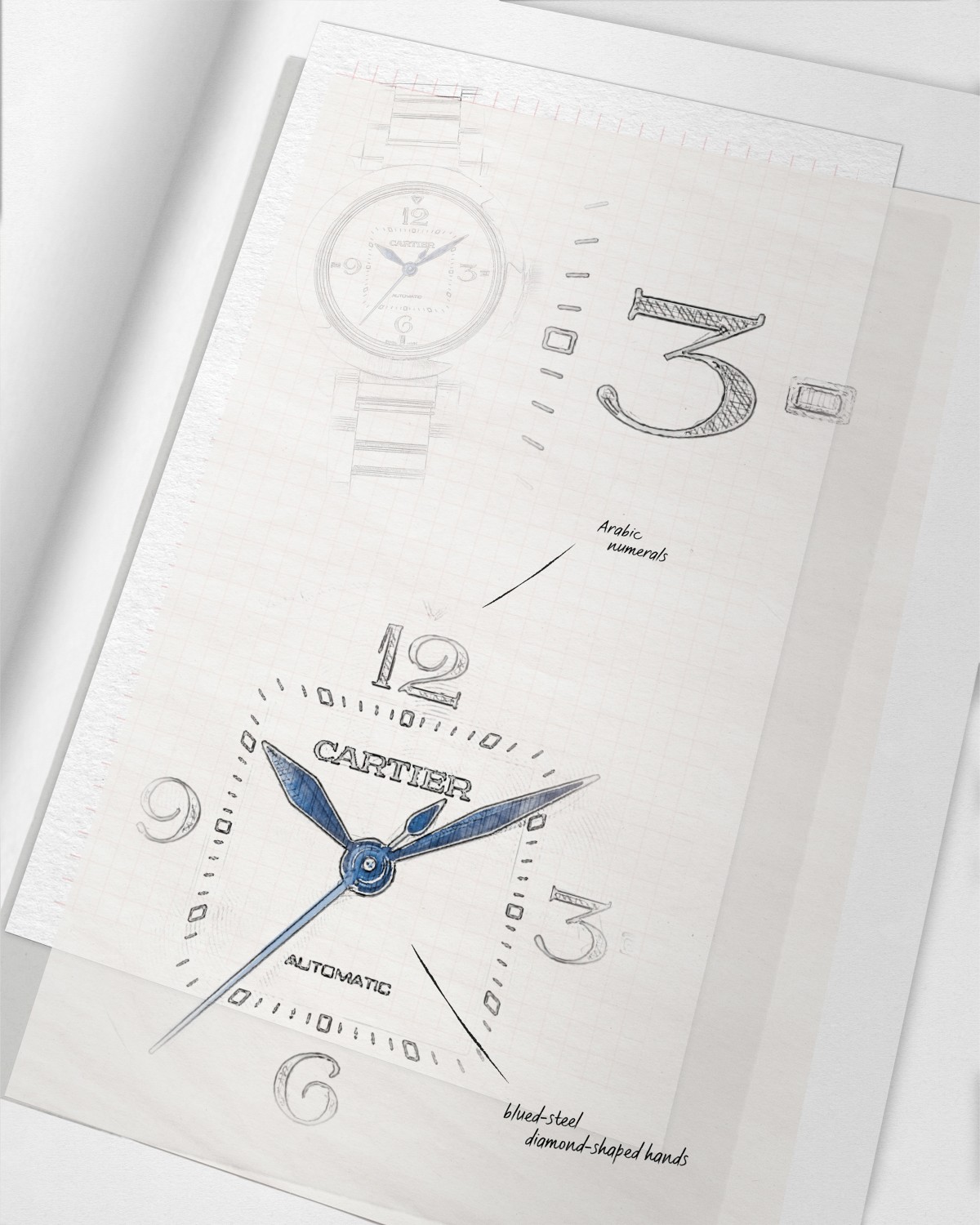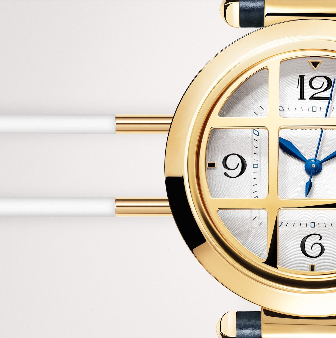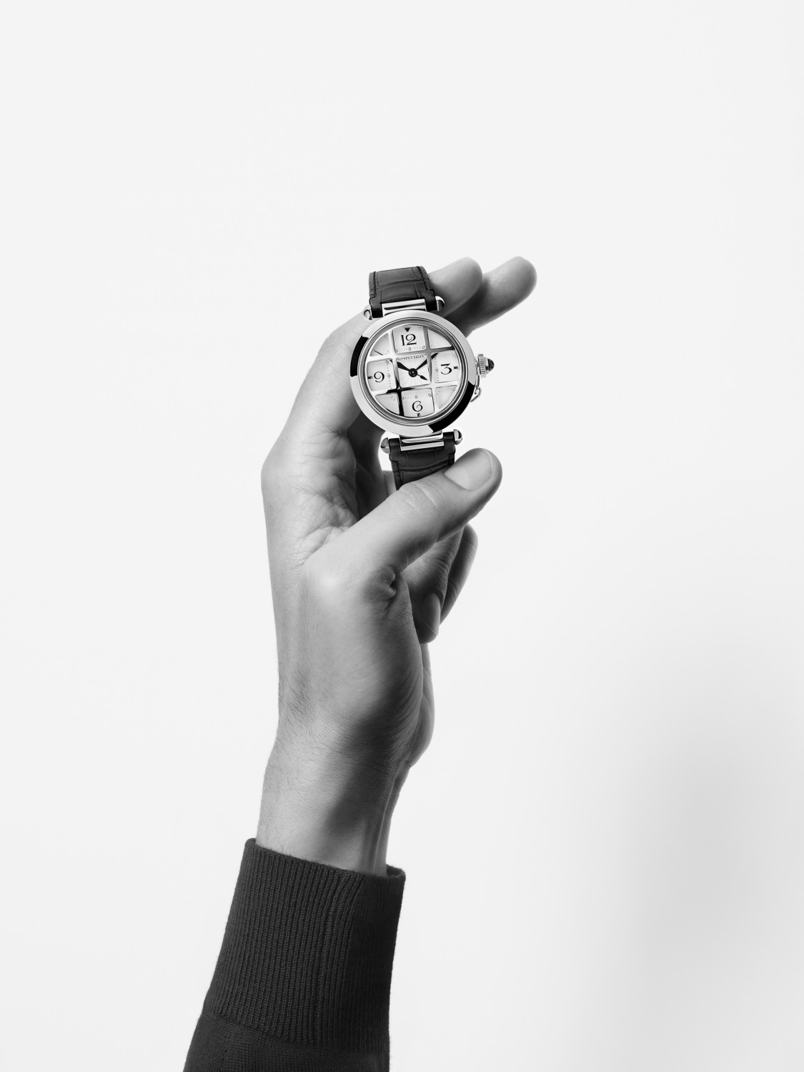 Так, часы Pasha de Cartier 2020-х годов представляют собой современную историю. Дизайн 2022 года возвращает нас к модели 1943 года – водонепроницаемых часов с защитной решеткой, которая покрывает полностью циферблат. И если изначально решетки в часах использовались для защиты стекла, то сегодня – это съемная декоративная деталь, которая по желанию снимается легким движением руки – поворотом. Так, часы можно носить как с решеткой, так и без нее, что позволяет создать абсолютно два разных стиля.