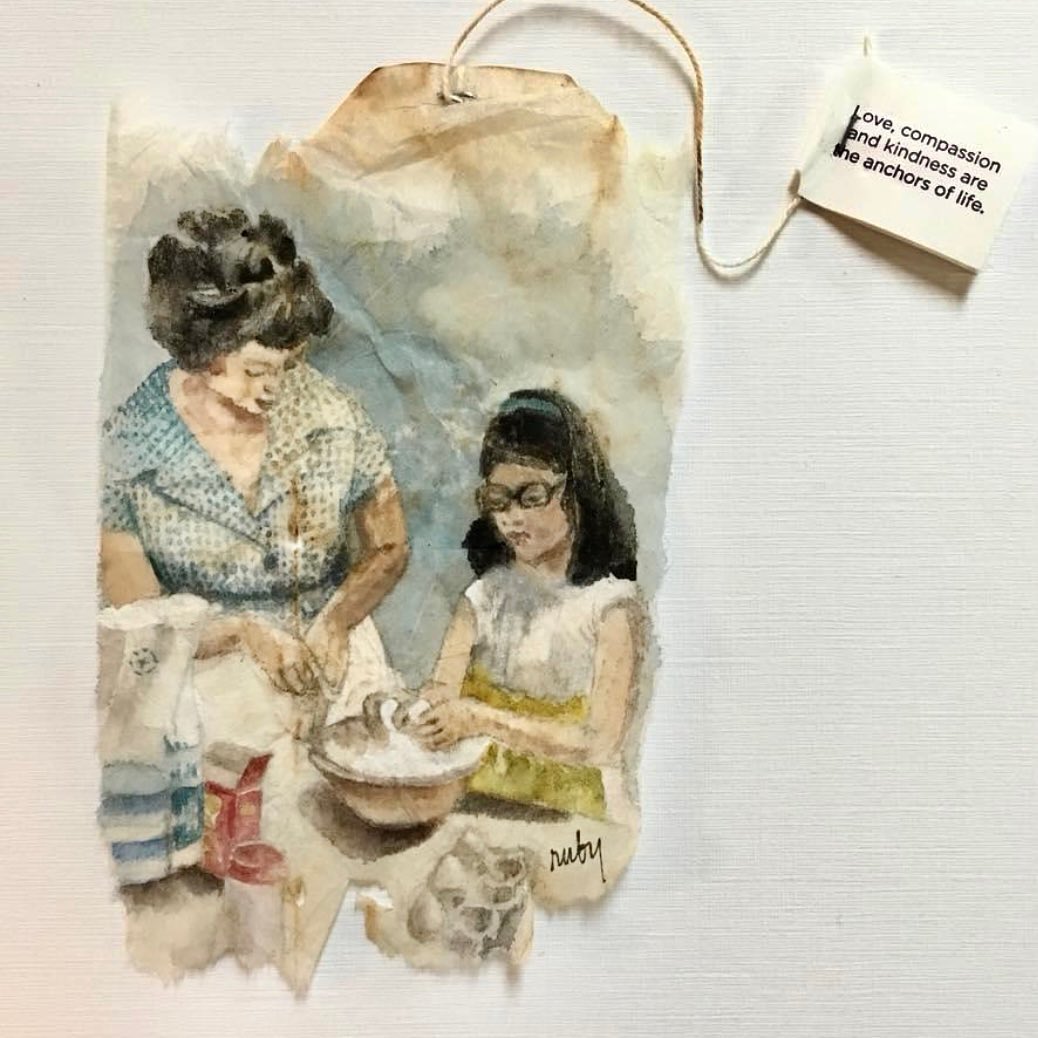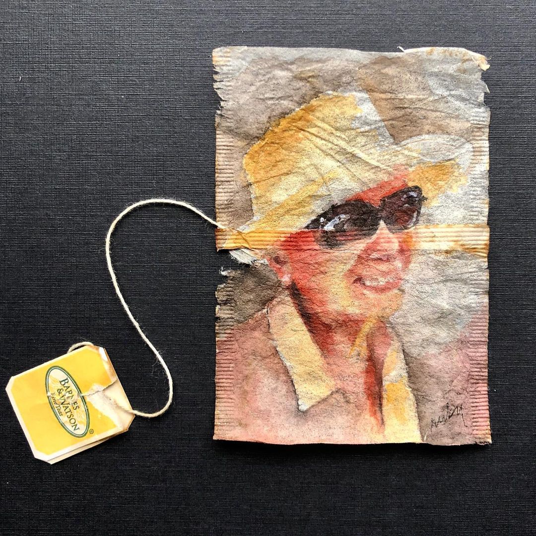 Руби Сильвиус прославилась на весь мир своими необычными работами. Художница пишет картины на чайных пакетиках. И не только. Под кисть Руби попадали яичная скорлупа, обрывки писем и картонных коробок, винные пробки, сухие листья, бумажные пакеты и многое другое.