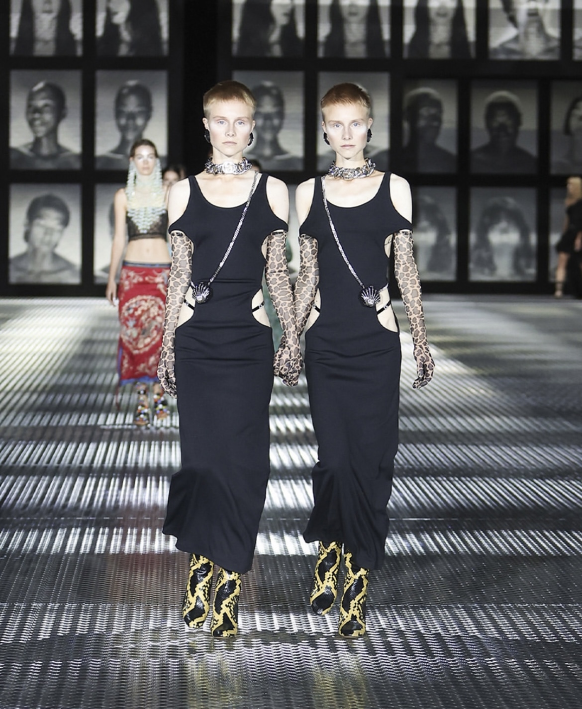 В этом году показ Versace закрыла икона 2000-х Пэрис Хилтон. Она вышла на подиум в розовом ремейке культового платья из весенней коллекции 1998 года, в котором на подиум выходила вооруженная Наоми Кэмпбелл.