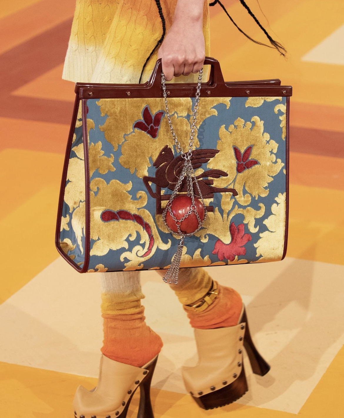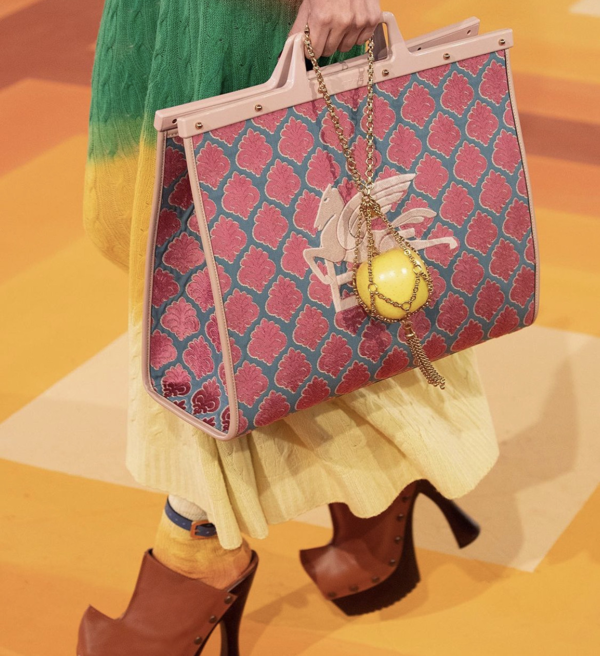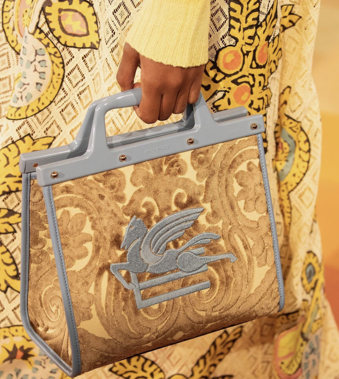 Однако он решил не откидывать ДНК-бренда прочь и уделил особое место логотипу Etro. Крылатый конь был изображен на шерстяных вещах, сумках, шелковых рубашках и даже золотых серьгах.