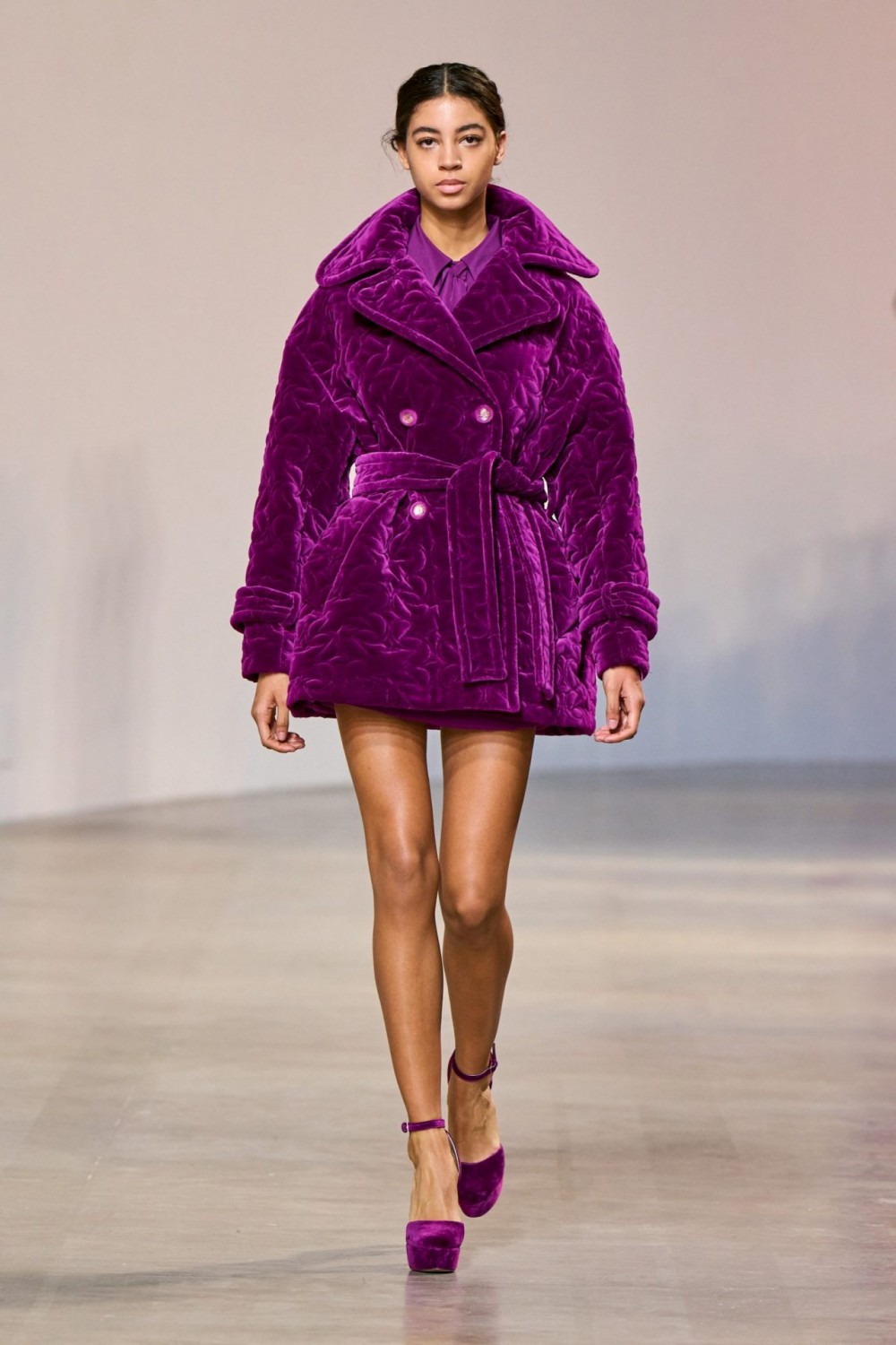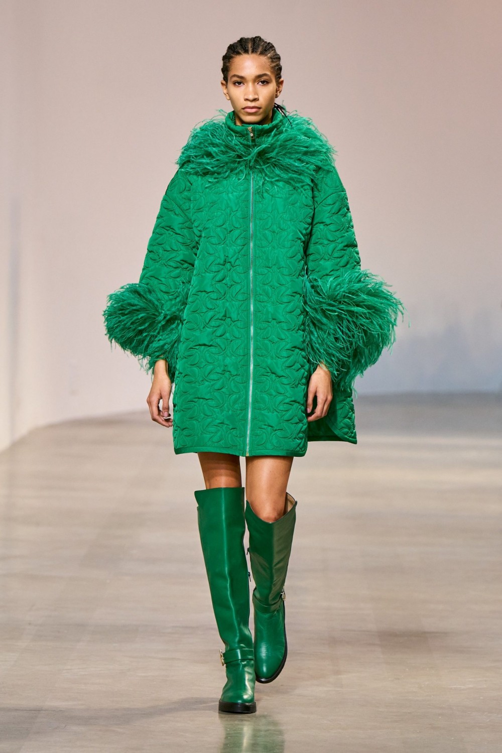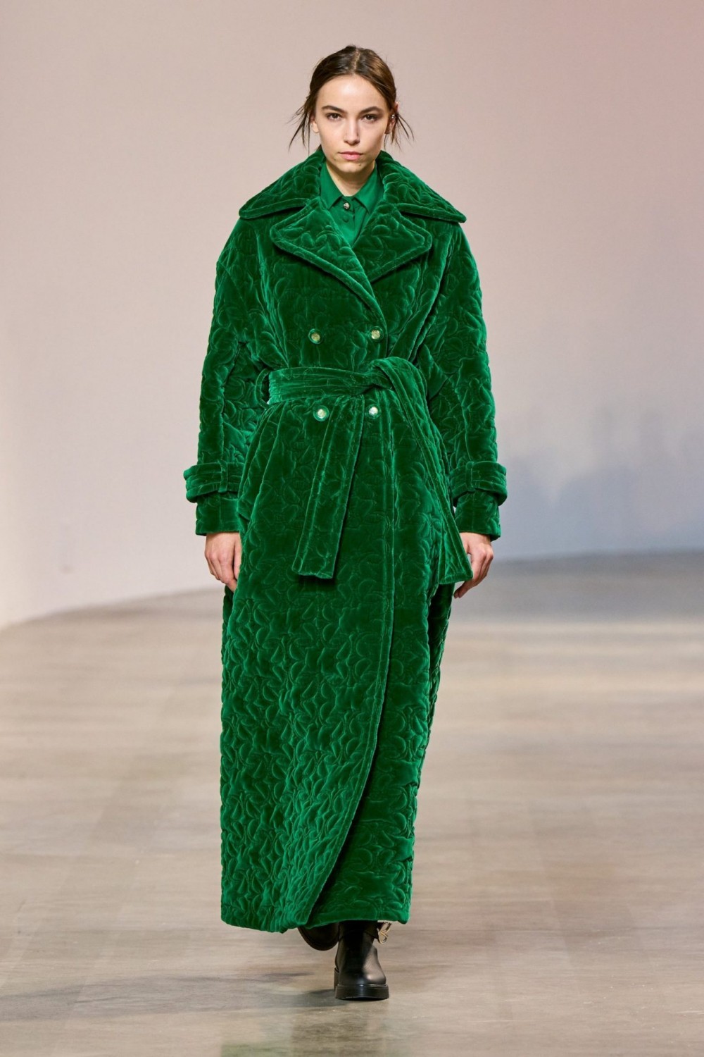 В меру романтичные и женственные, с ноткой рока, образы пребывают в идеальной гармонии с цветом и кроем. Насыщенный зеленый, фуксия, индиго и черный дополнены вышивкой из пайеток. В этом сезоне коллекцию пополнили и изысканные стеганные пальто из вельвета, от которых веет уютом и комфортом.