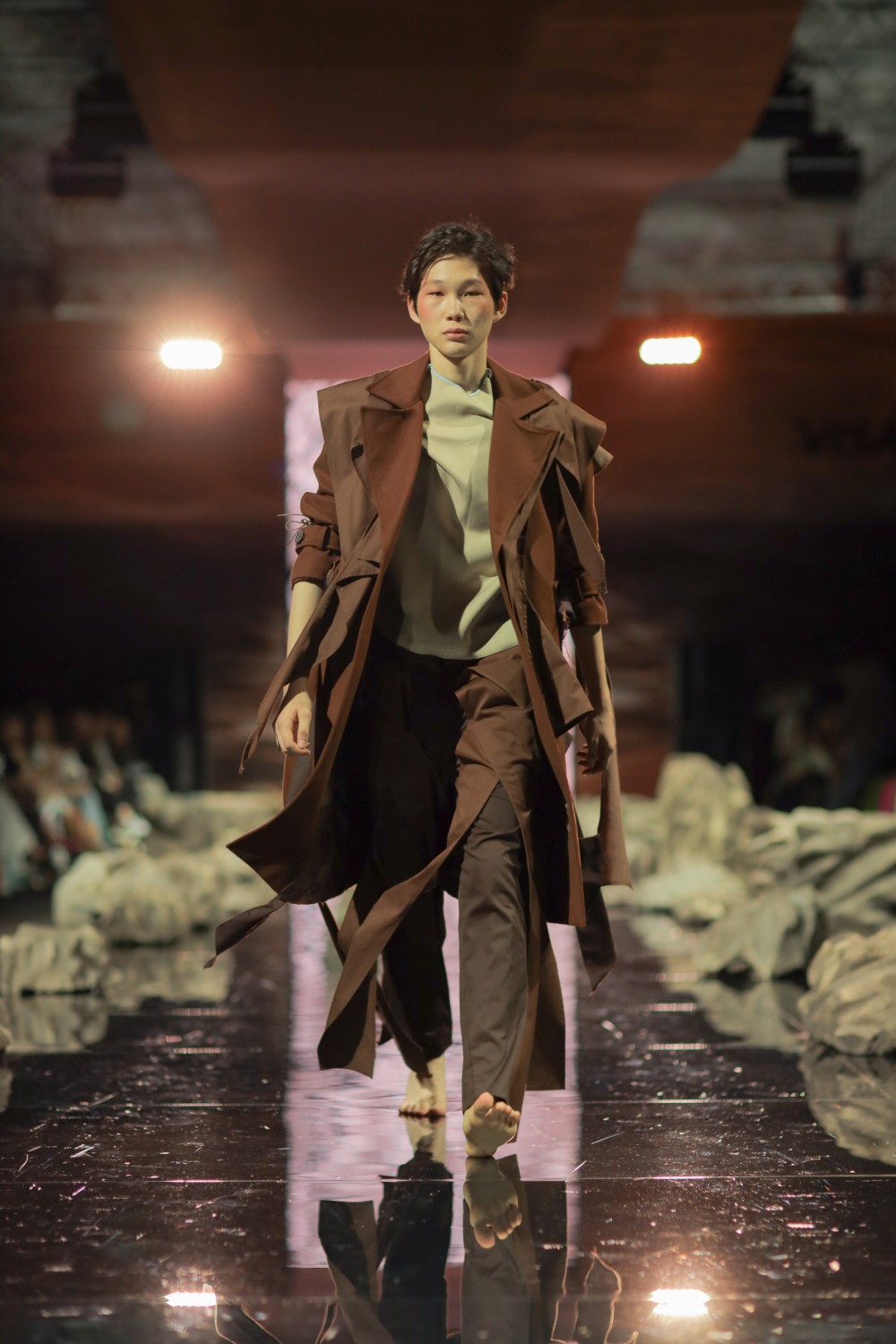 Особое внимание было уделено экспериментальной моде: здесь и надетые задом наперед мужские пиджаки, и рубашки с косым воротом, и баски с лентами, и тренчи с рванными рукавами. Землистые цветовые решения неслучайны — изделия выглядят так, будто в них можно скрыться в степи от противников.