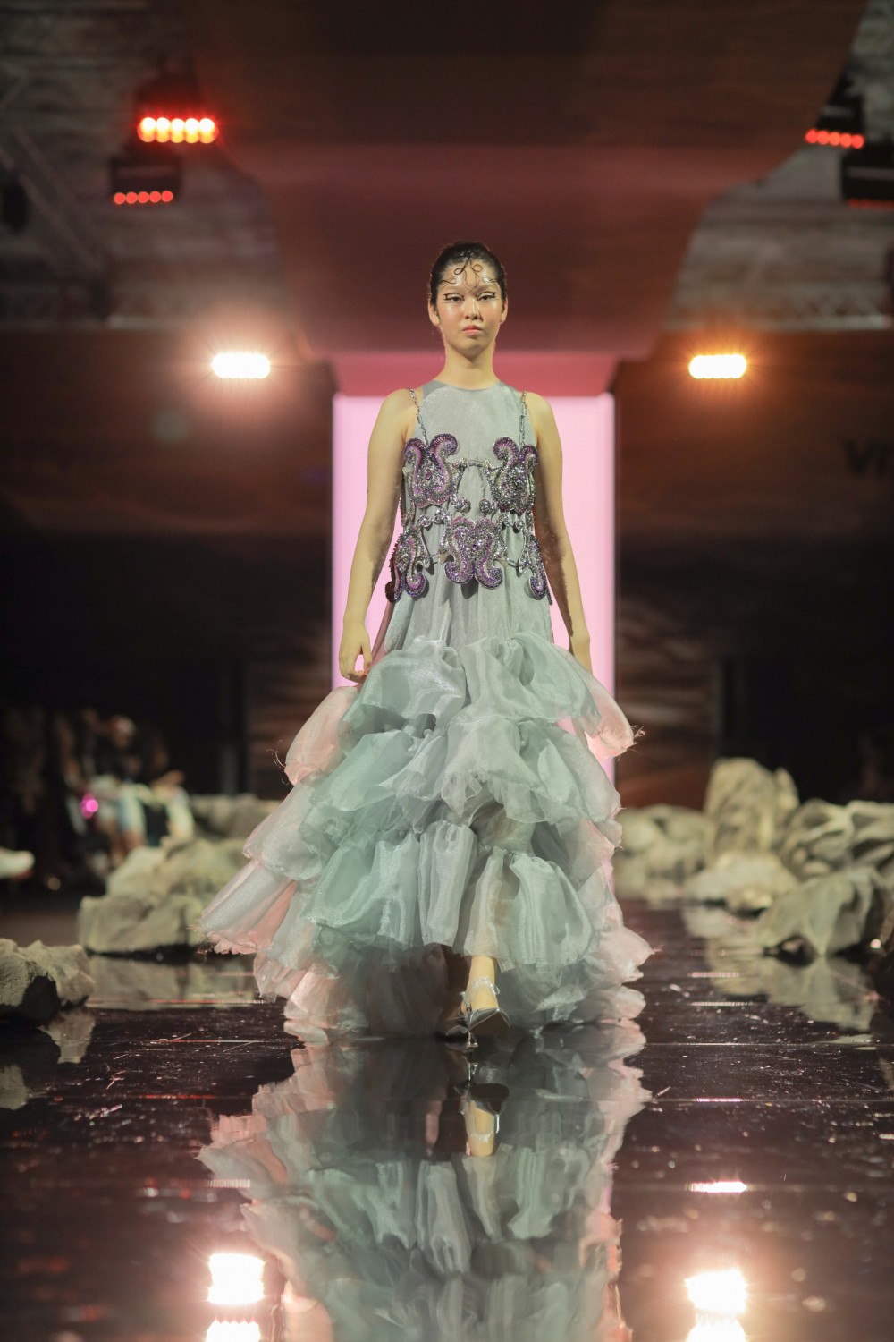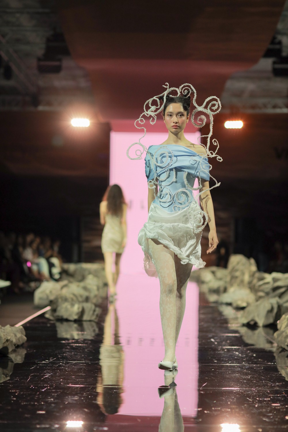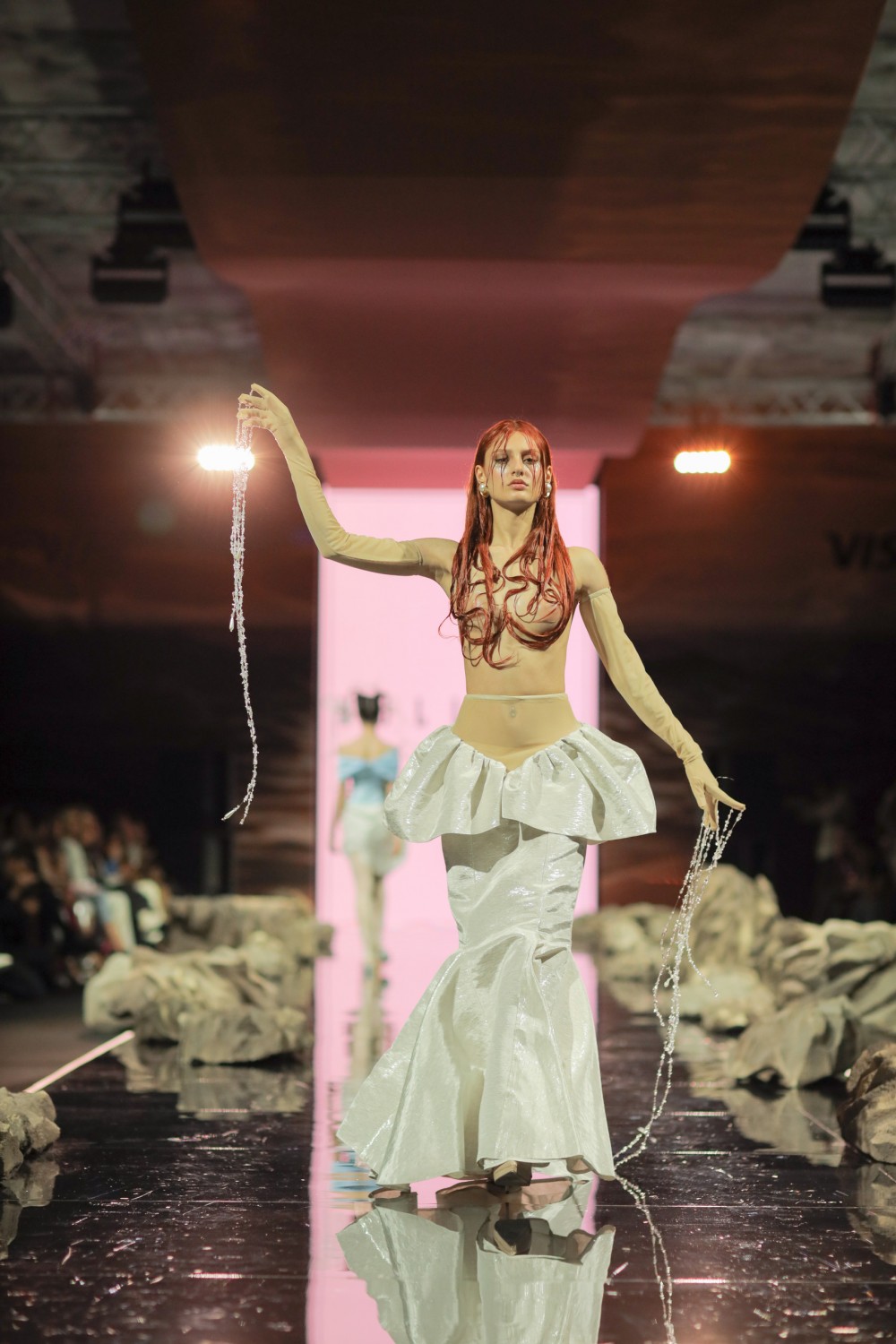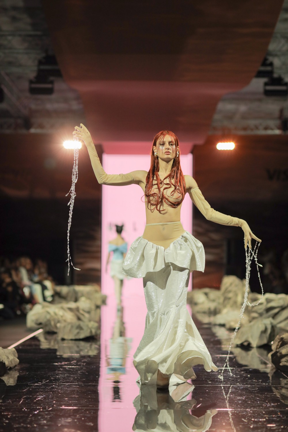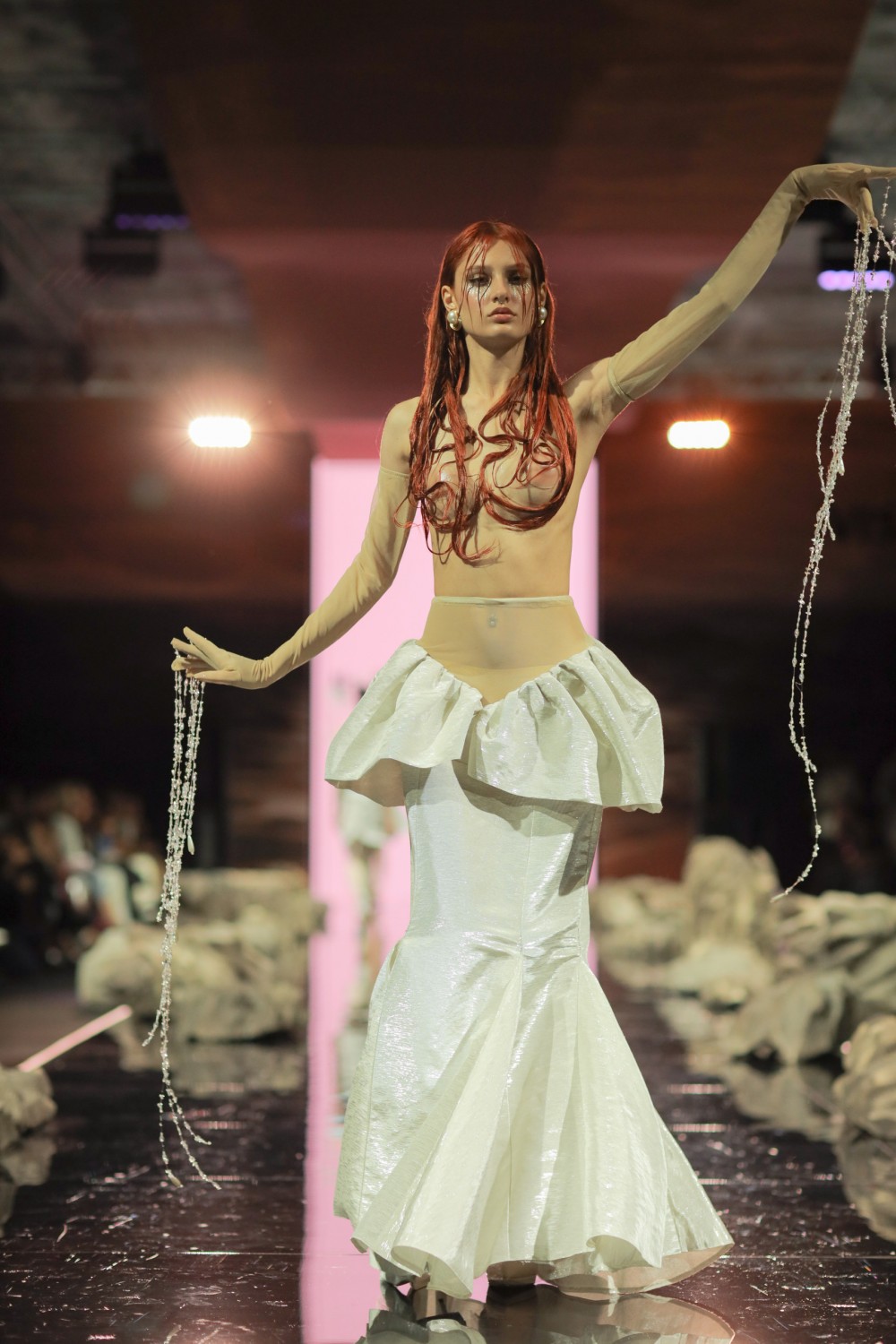 Фаворит редакции — последний образ в духе mermaidcore. Перед нами предстала обнаженная рыжеволосая русалка в белоснежной юбке и в необычных перчатках — каждый ноготь украшала свисающая длинная цепочка. Вновь здесь мы наблюдаем оммаж родному городу дизайнера — в Актау находится бронзовая скульптура русалки с интересной легендой: Посейдон подарил ей браслет, исполняющий желания. И если его потереть, то в скором времени обретешь личное счастье.
