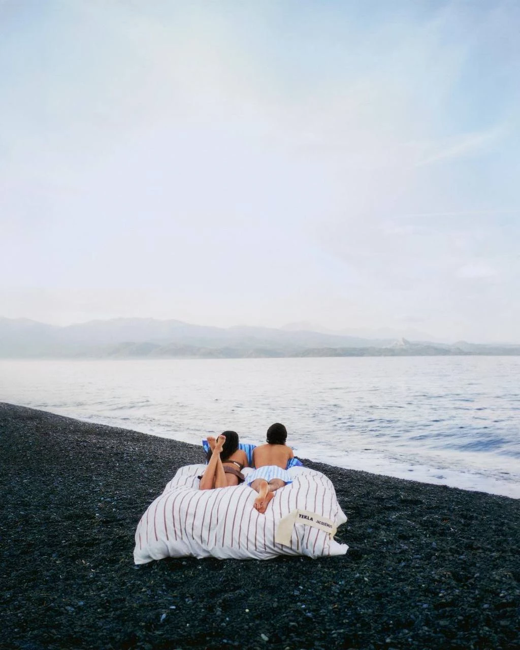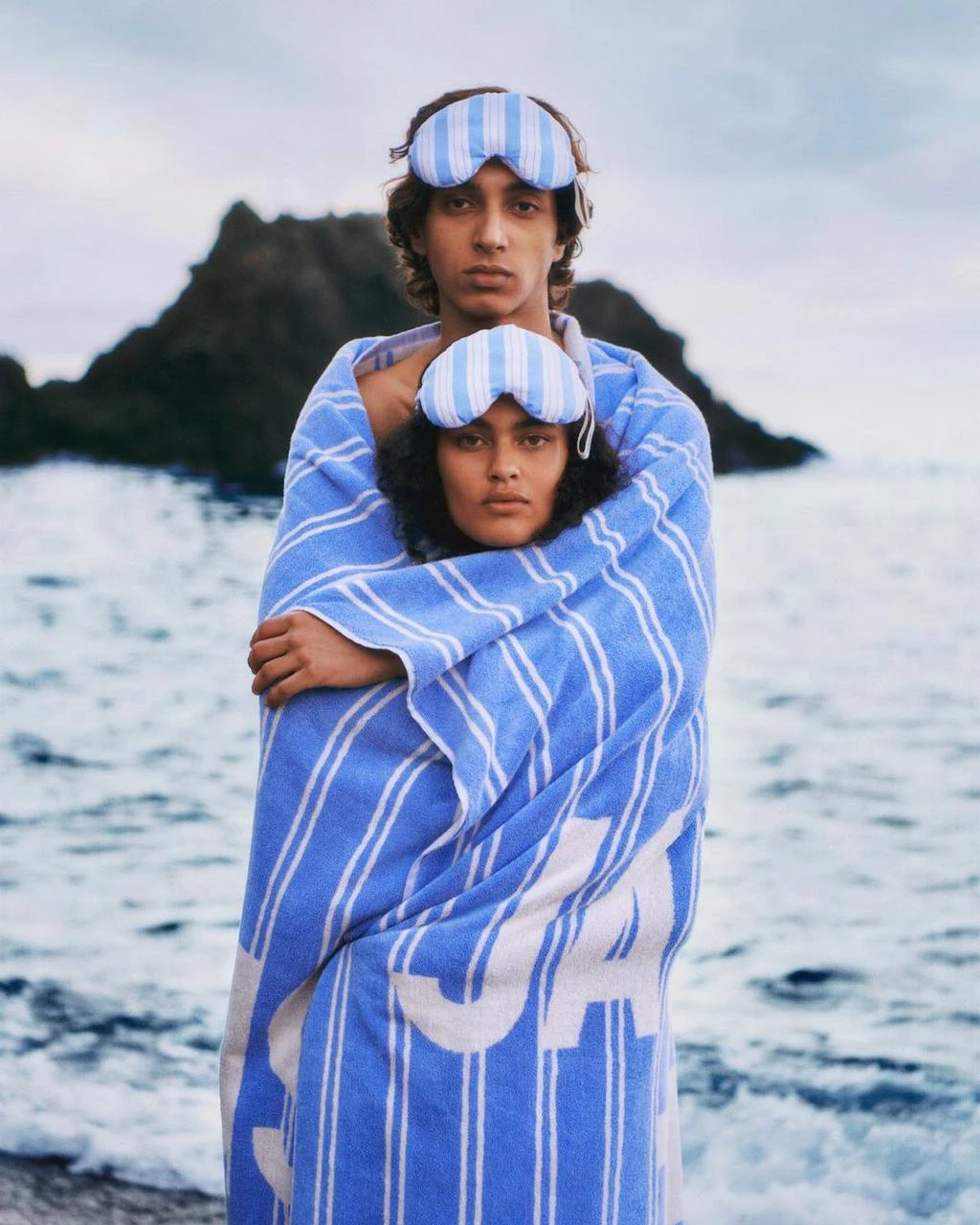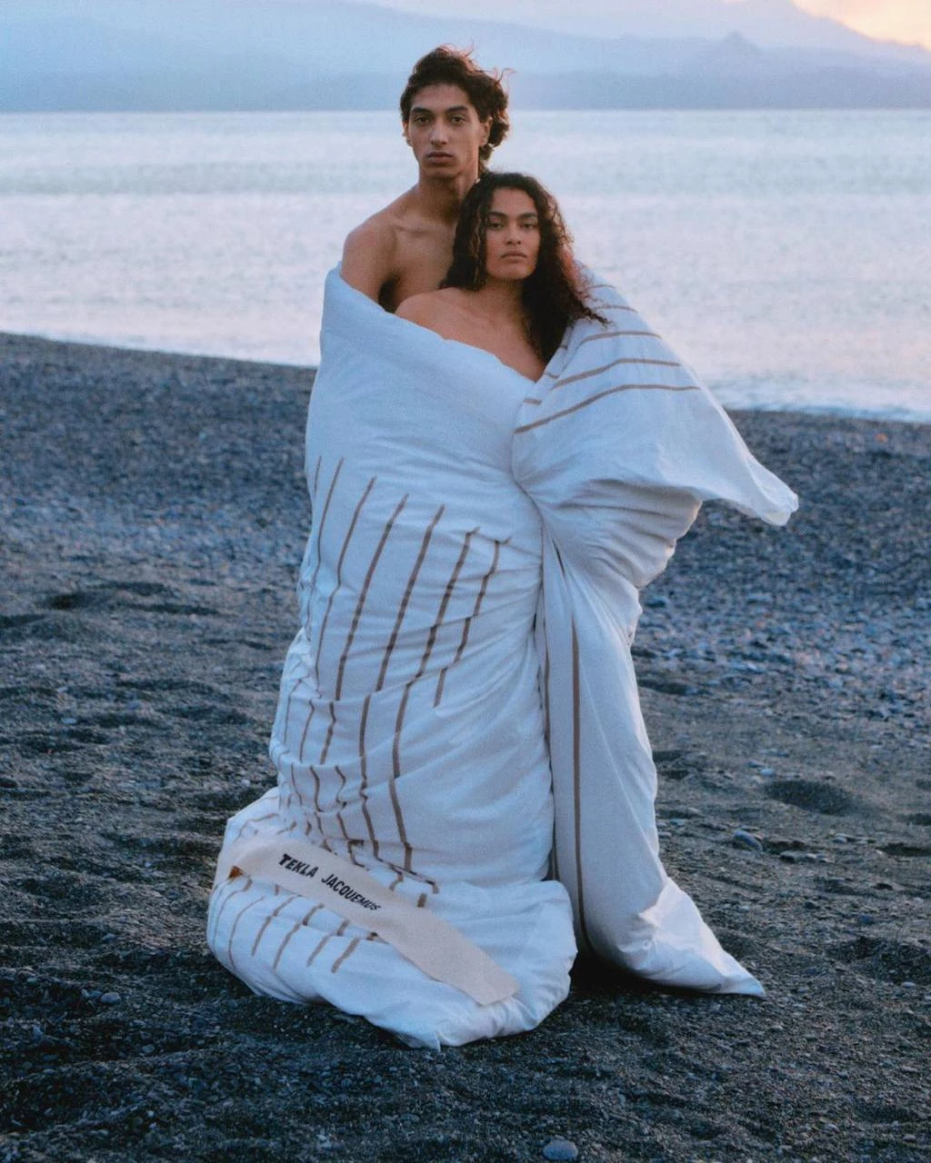 Океан, убаюкивающие звуки прилива и кровать, заправленная невероятным постельным бельем — Jacquemus представил уютную коллаборацию с датским брендом домашнего текстиля Tekla. Коллекция получила название In Bed With и была выполнена в бело-синей палитре. В капсулу вошло все для дома: постельное белье, пледы и полотенца в полоску. Не обошлось и без идеальных составляющих образа для сна — были представлены гендерно-нейтральные халаты, пижамы и маски для сна.