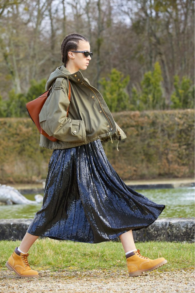 Эди Слиман как бы говорит нам: «Наденьте свое любимое праздничное платье, но только с чем-то повседневным, например, бейсболкой, кожаным бомбером и ботинками челси». Дизайнер намекает на праздник без повода и напрямую требует не откладывать жизнь на потом.