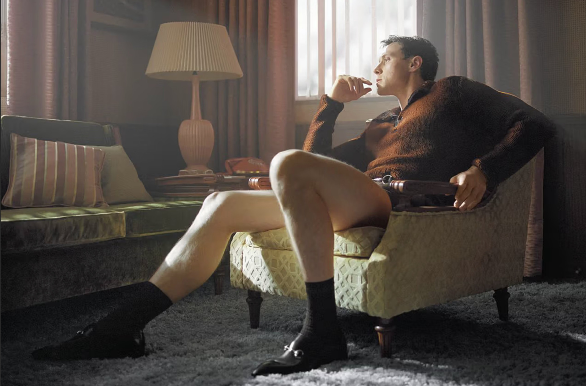 В свою очередь, Джордж Маккей демонстрирует игривое переосмысление мужского стиля. Его образы варьируются: от прозрачного поло до сочетания коричневого свитера с короткими шортами и лоферами. Особенно нашей редакции полюбился коричневый костюм, под которым скрывается фиолетовая сетчатая рубашка.