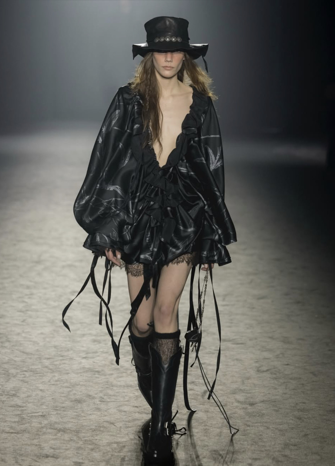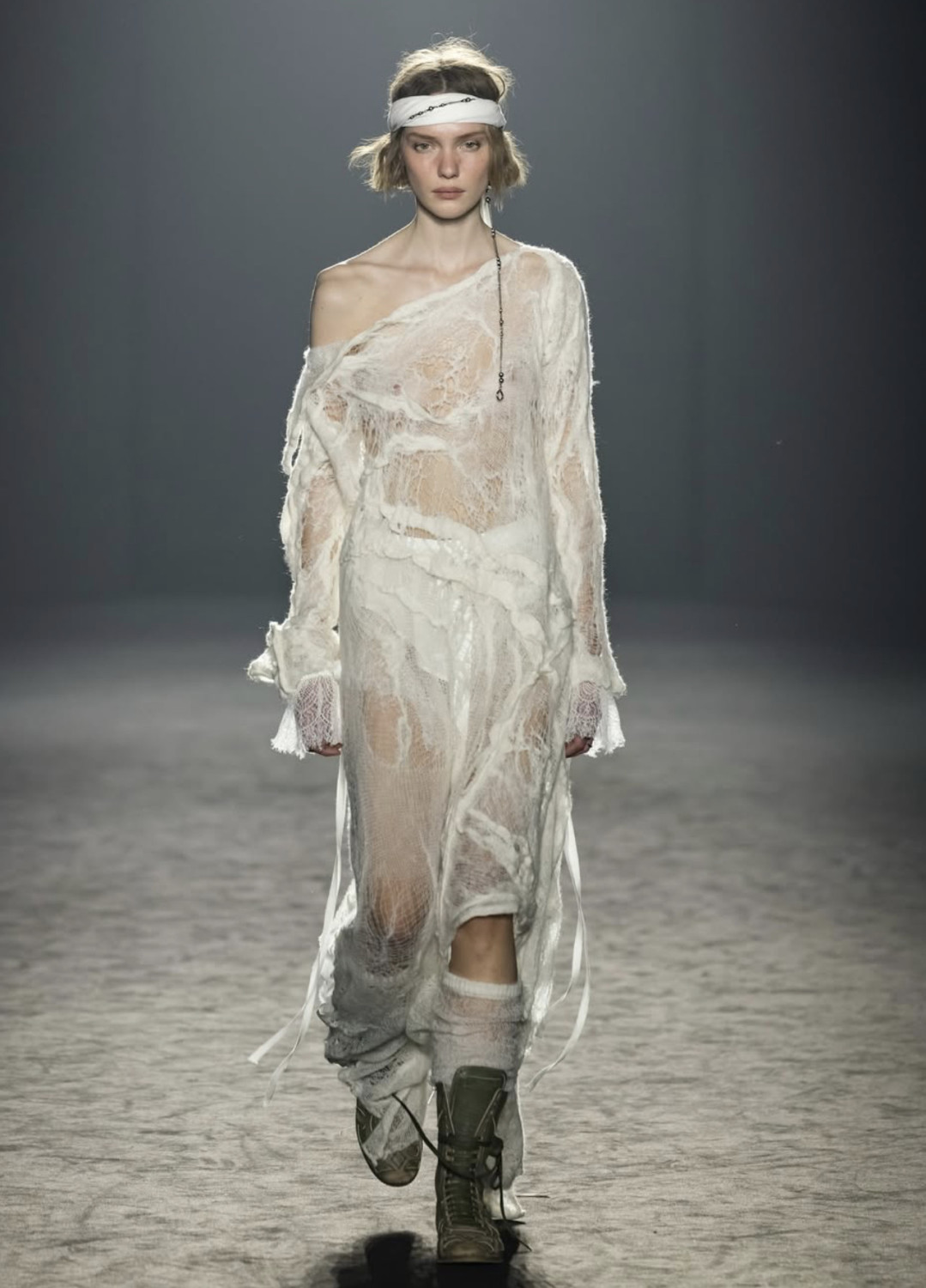 Когда свет прорезал густую пелену, на подиуме появилась первая модель — словно призрак из иной реальности. Черный жакет с необработанным краем, рубашка с воздушными оборками, юбка с тонкой кружевной отделкой и кожаные сапоги с бахромой создавали ансамбль, в котором грубые линии переплетались с хрупкими деталями. В свою очередь, повязка на голове и массивные солнечные очки, созданные в сотрудничестве с Ray-Ban, добавляли нотку таинственности. Этот наряд стал прологом к показу — многослойному, непокорному и поэтичному.