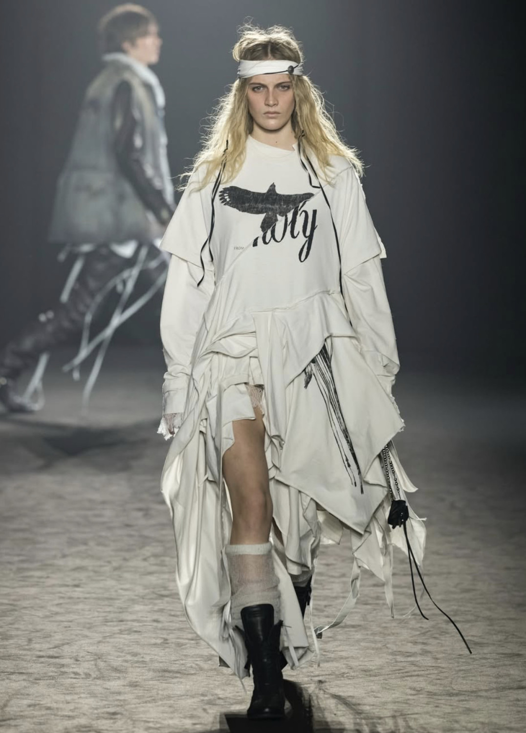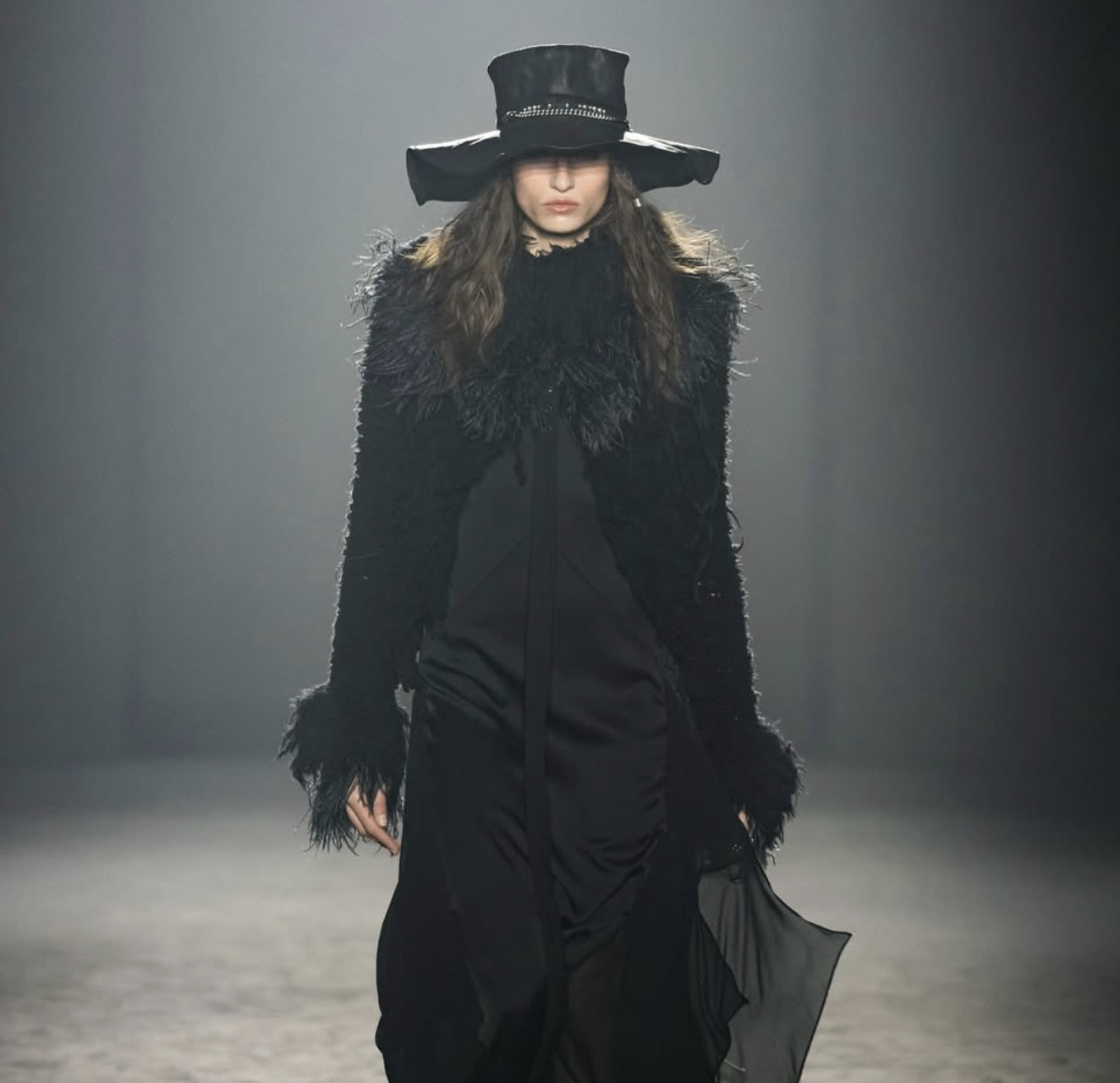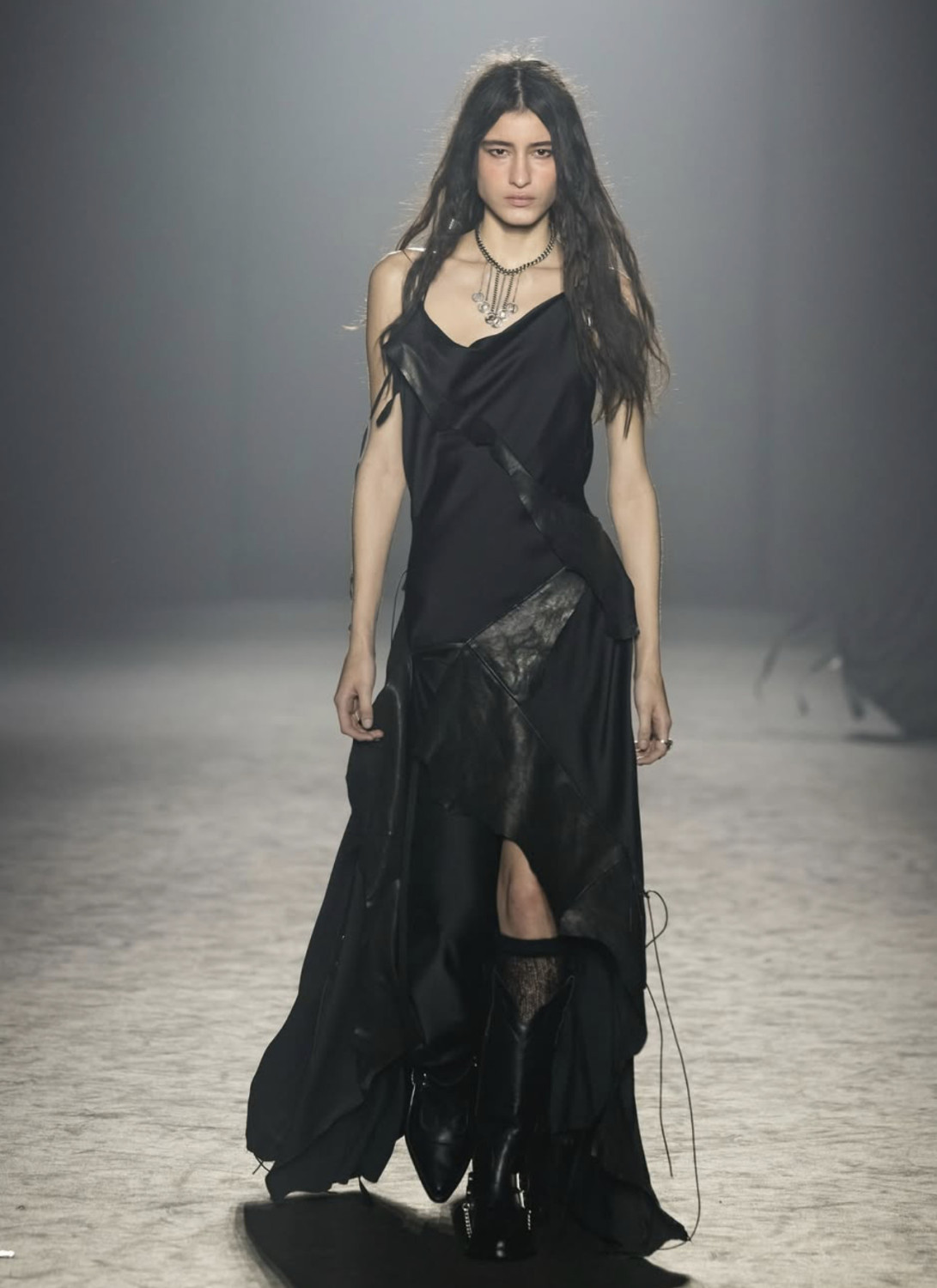 Показ Ann Demeulemeester FW '25, прошедший в пространстве Espace des Blancs Manteaux, начался с таинственного погружения в туман. Густая пелена обволакивала пространство, заставляя гостей осторожно пробираться к своим местам. «Давай заблудимся, найдем дорогу к себе, а потом снова отправимся в неизвестность», — предложил креативный директор бренда Стефано Галличи. Именно эта идея — самопознание через скитания по неизведанному — стала лейтмотивом коллекции.