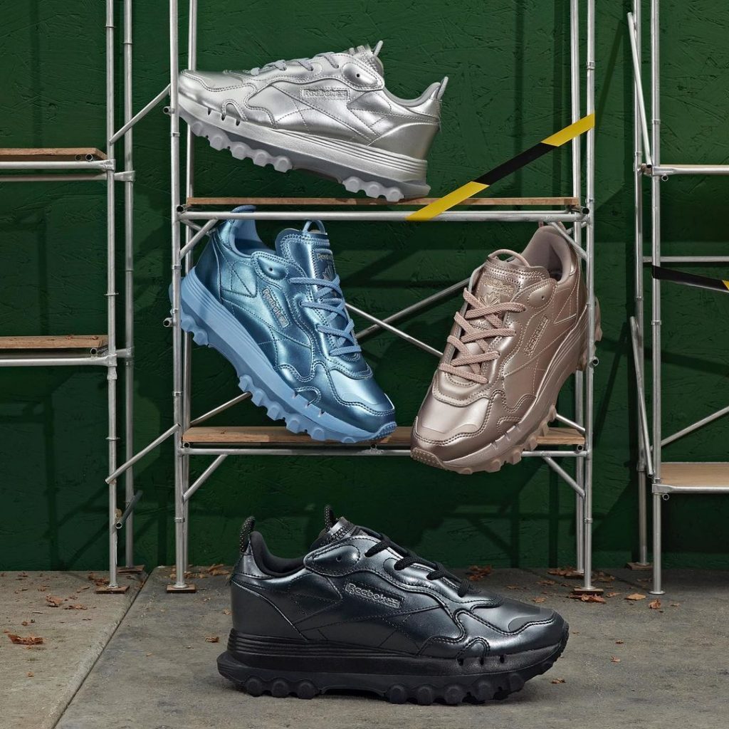 Линейка представлена обновленными версиями кроссовок Classic Leather с металлическим покрытием в синем, серебристом, черном, зеленом, розовом и красном цветах. Также в коллекцию вошли укороченные топы, брюки-карго, халаты, жакеты, лосины и другая одежда.