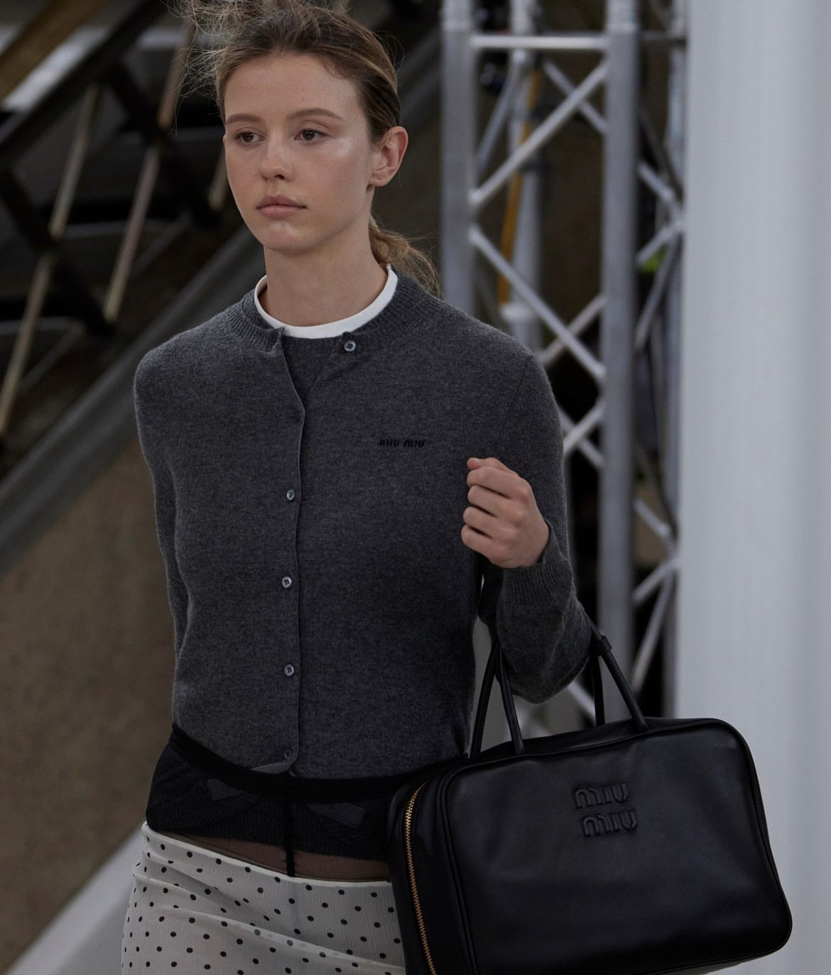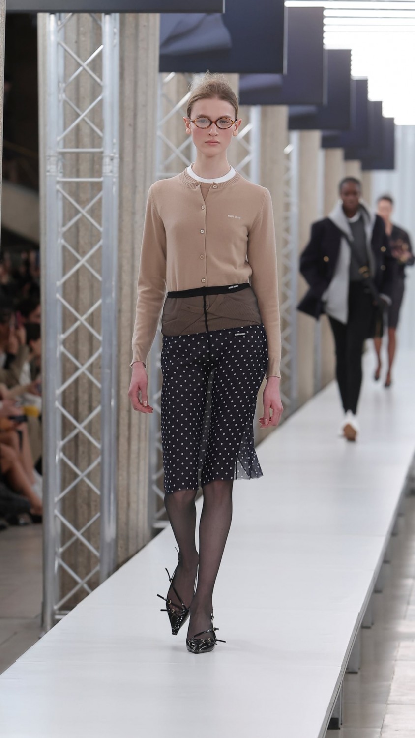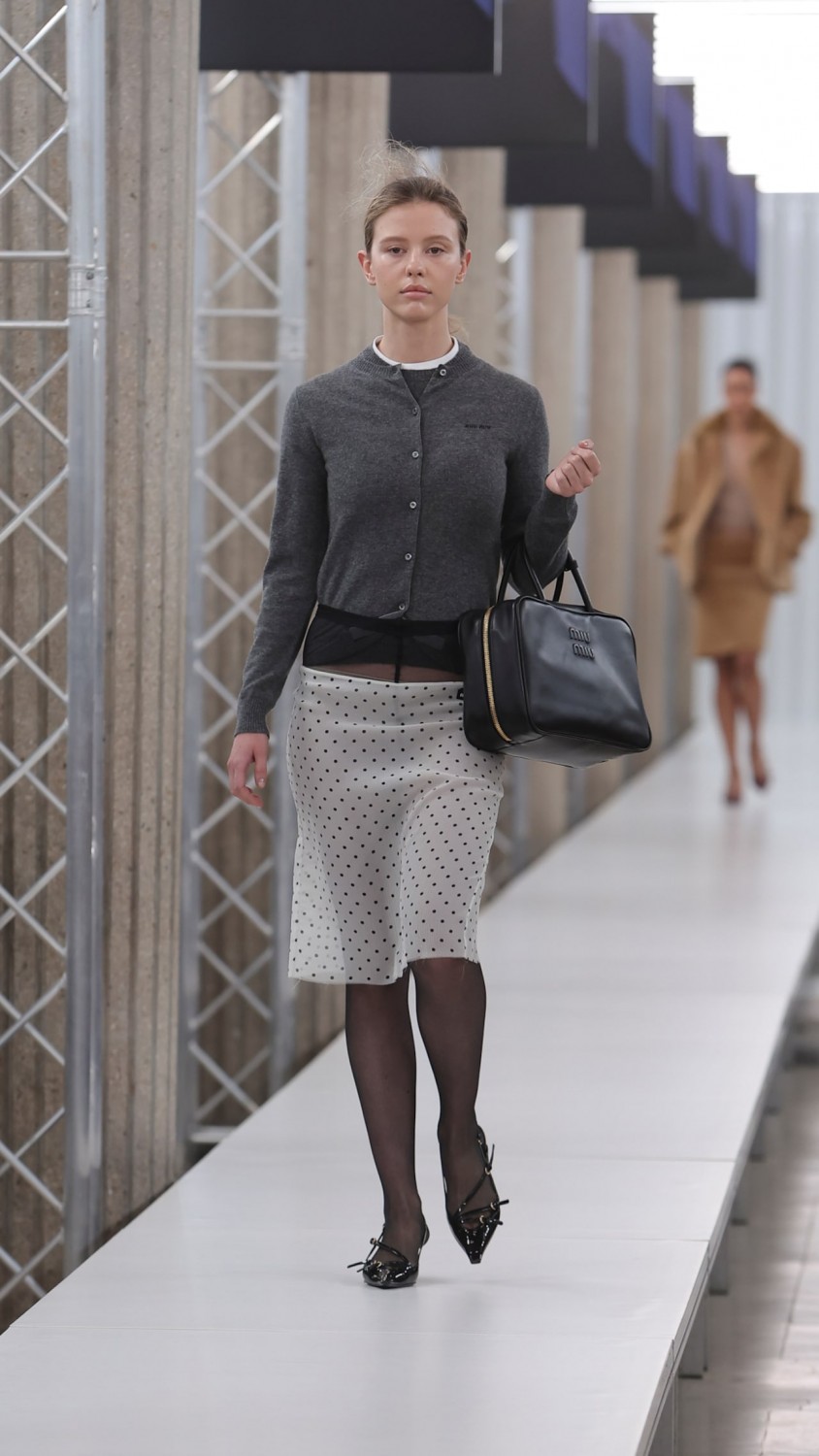 Больше всего по душе представителям fashion-индустрии пришлась интерпретация Миуччи Прада и Рафа Симонса. Героини Miu Miu словно опаздывали на работу — они натянули поверх застегнутого на все пуговицы кардигана одиозные колготки. Если одни нашли время, чтобы надеть юбку, то другие отправились покорять мир или сердца коллег без нее. Интересным дополнением стали позы моделей — сумочки они расположили на локтевом сгибе. Да, именно так, как старшеклассницы в школе передвигались по длинным коридорам. Однако, если Miu Miu сделал акцент на игривости, то в коллекции Prada модели облачились в костюмы-двойки минималистичных тонов, которые были обыграны острыми воротниками ярких оттенков.