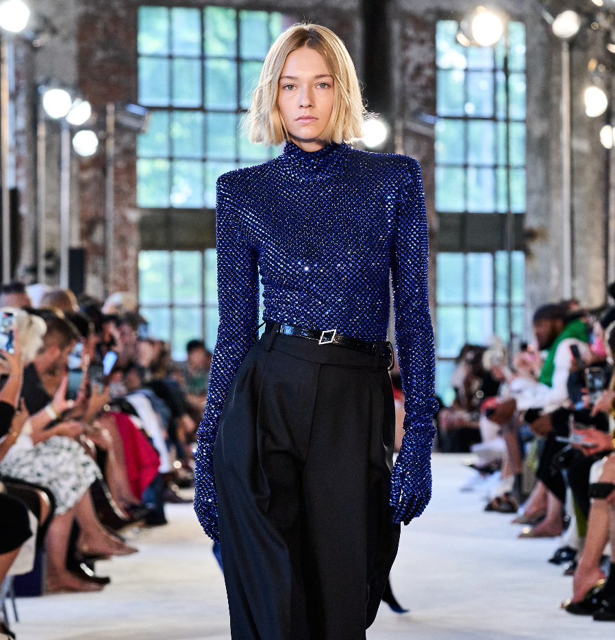 Без сомнений, Вотье мастер кроя и драпировки и осень-зима 2022-23 не исключение. Мерцающие образы на фоне строгих костюмов смотрелись особо эффектно, а основой всей коллекции стали гибриды ботинок и брюк.