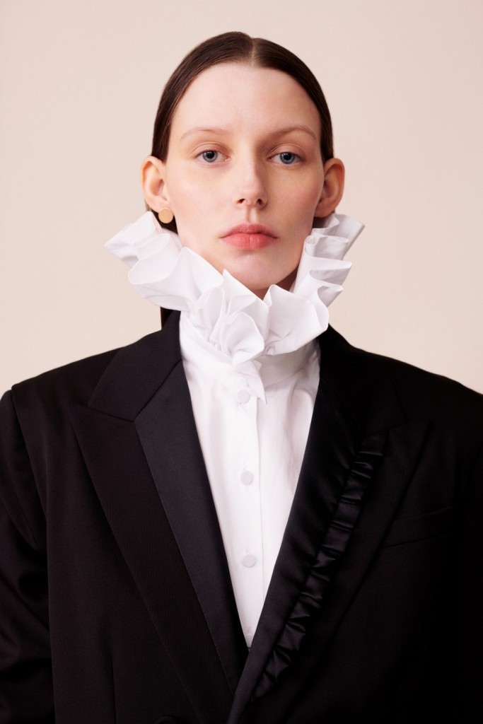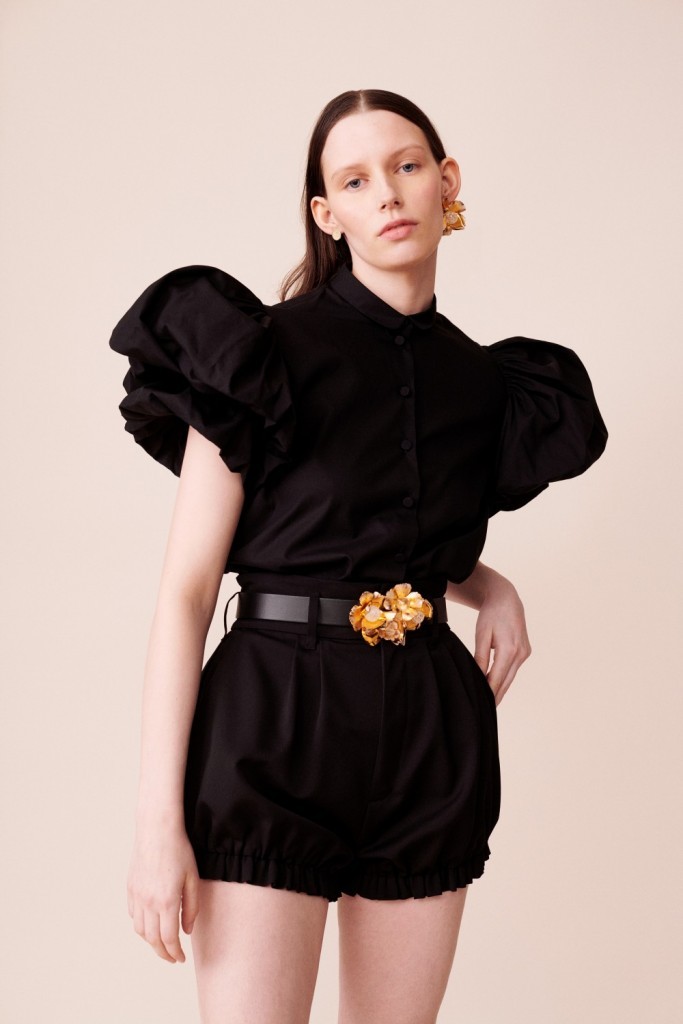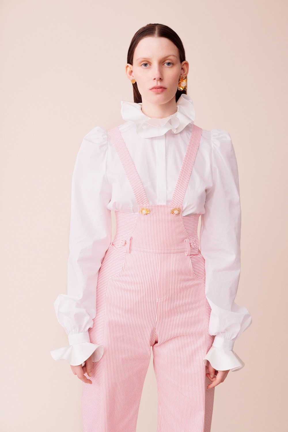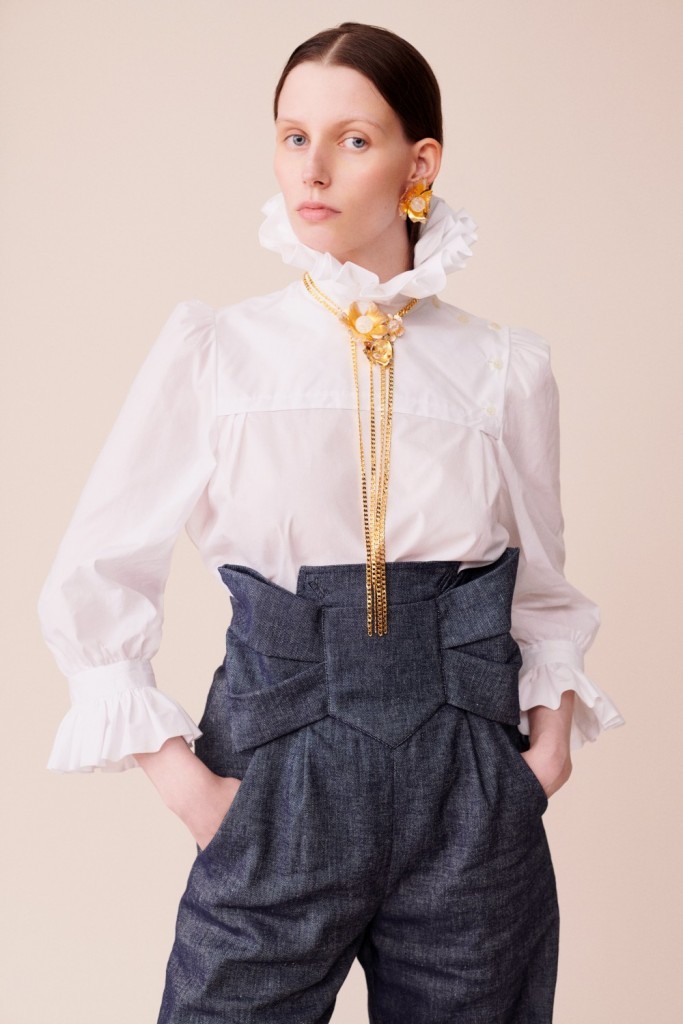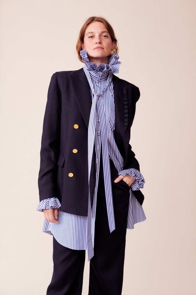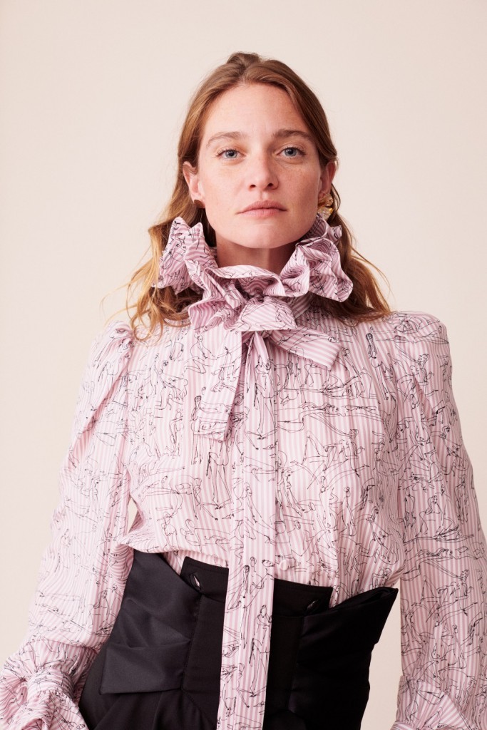 Дебютная коллекция от Prune Goldschmidt прославляет женственность. Для дизайнера женщины всегда многогранны, дерзки и слегка элегантны. Стройные силуэты, благодаря брюкам-клеш, высокая талия, объемные рукава, воротники и манжеты – все это создает достойный и изысканный образ. Игриво присутствуют и озорные принты Камасутры на хлопке и полосатом шелке.