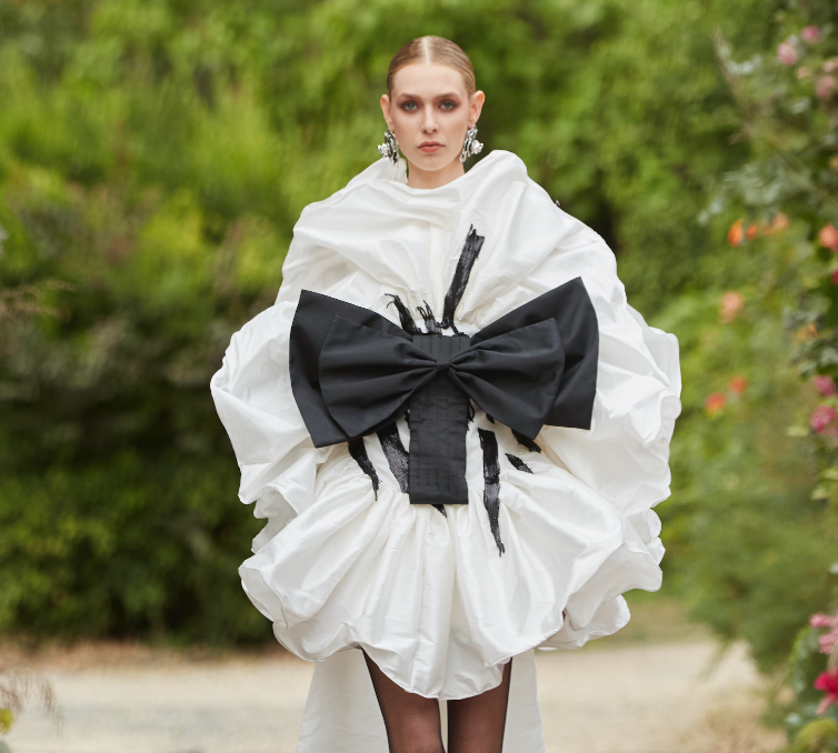 Знаковые и любимые черно-белые тона не стали исключением для этой коллекции, дизайнер также решила добавить несколько штрихов оранжевого. Наряды изготовлены в основном из шерсти, натурального шелка, органзы и тюля, с использованием различных ремесленных разработок в виде вышивки, страз и кристаллов. Кринолины - еще один безошибочный признак Juana Martin.
