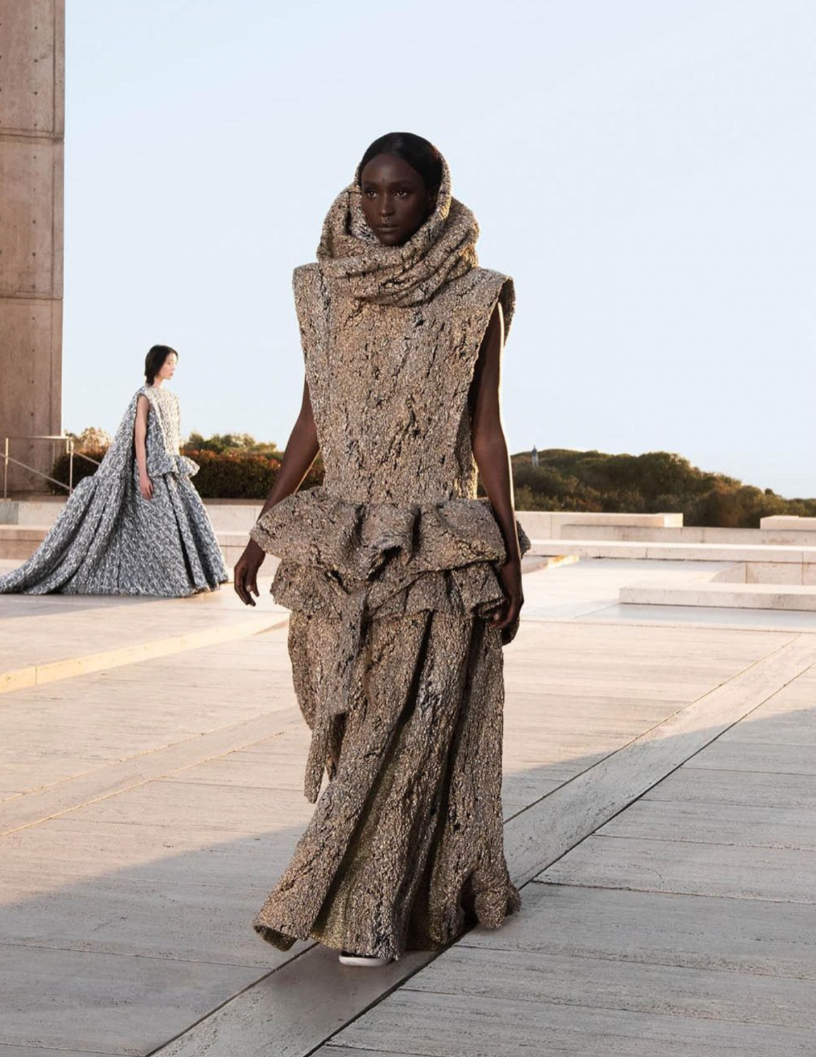 К финалу показа нас ждали футуристические образы: трио из скульптурных болеро, напоминающих воздушных змеев, готовых взлететь над утесом.
