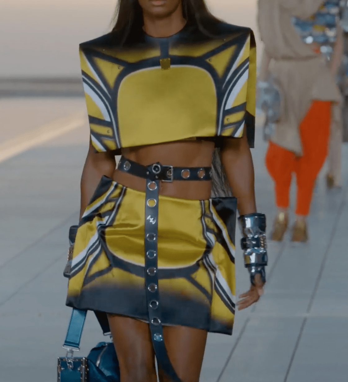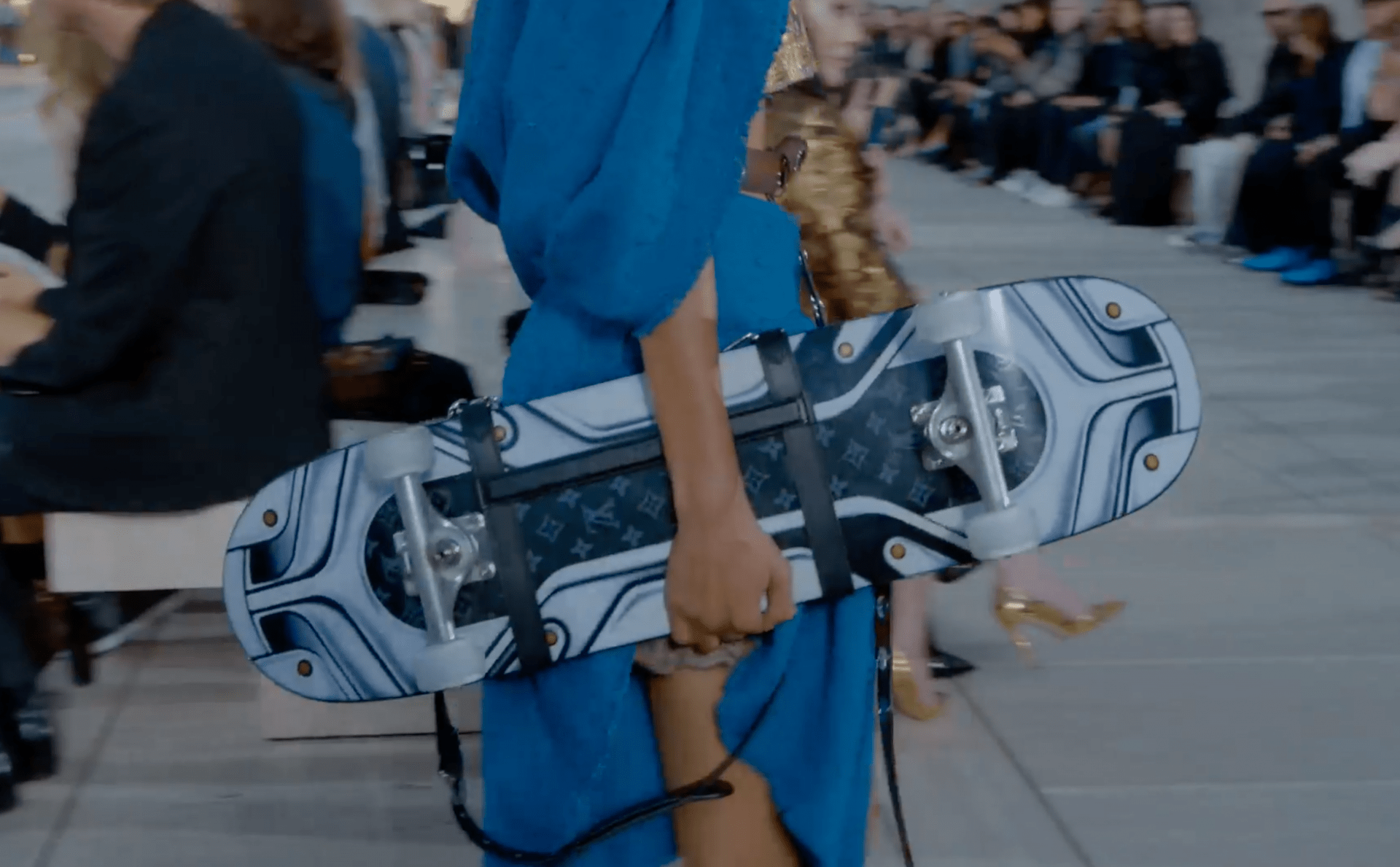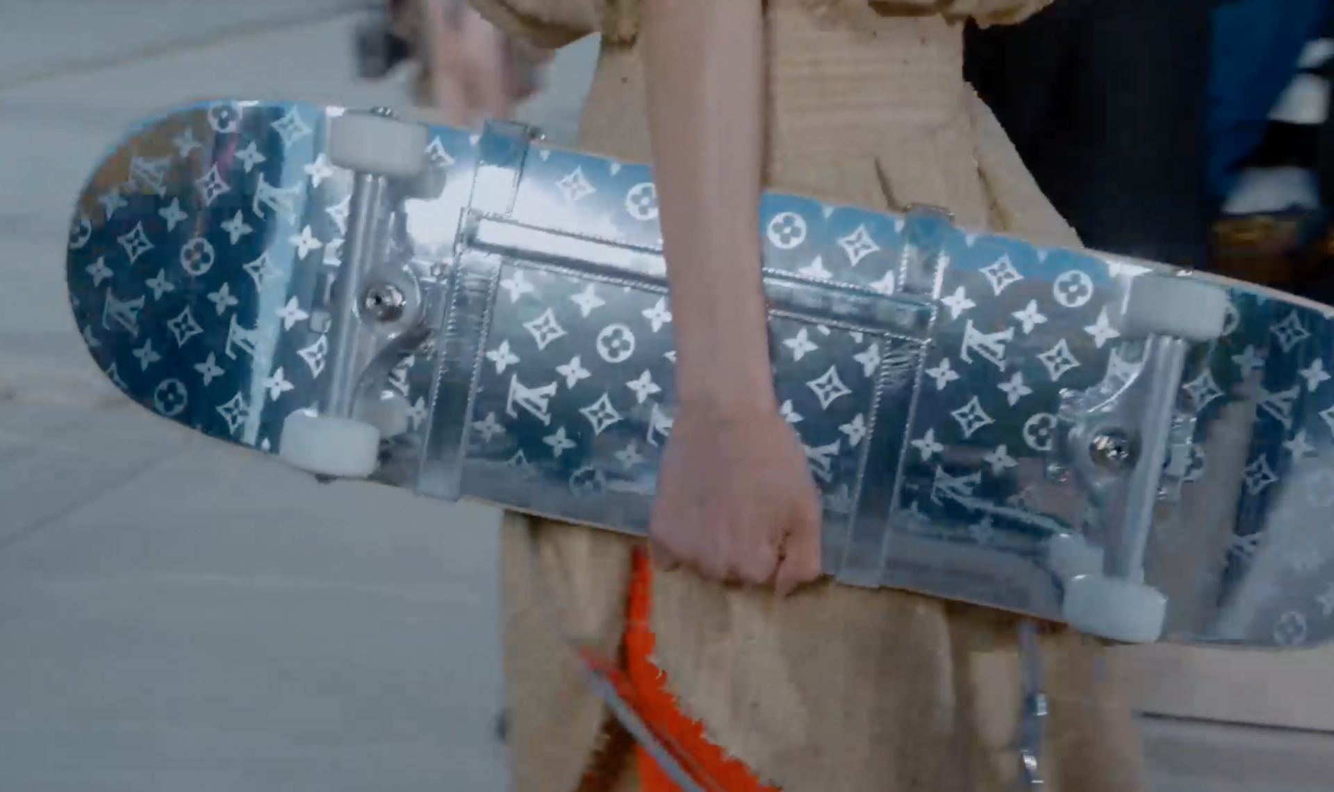Так, в представленной коллекции Гескьер позволил нам переместиться в будущее. Главным аксессуаром вселенной стал скейтборд Vernis с монограммой LV. Действительно, кому нужна сумка, когда есть более экстравагантный вариант?