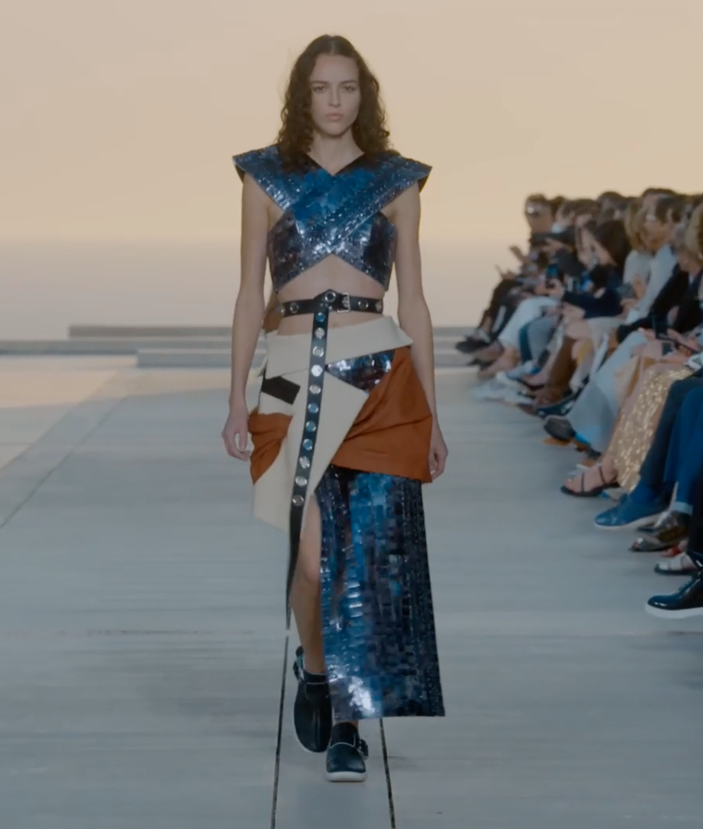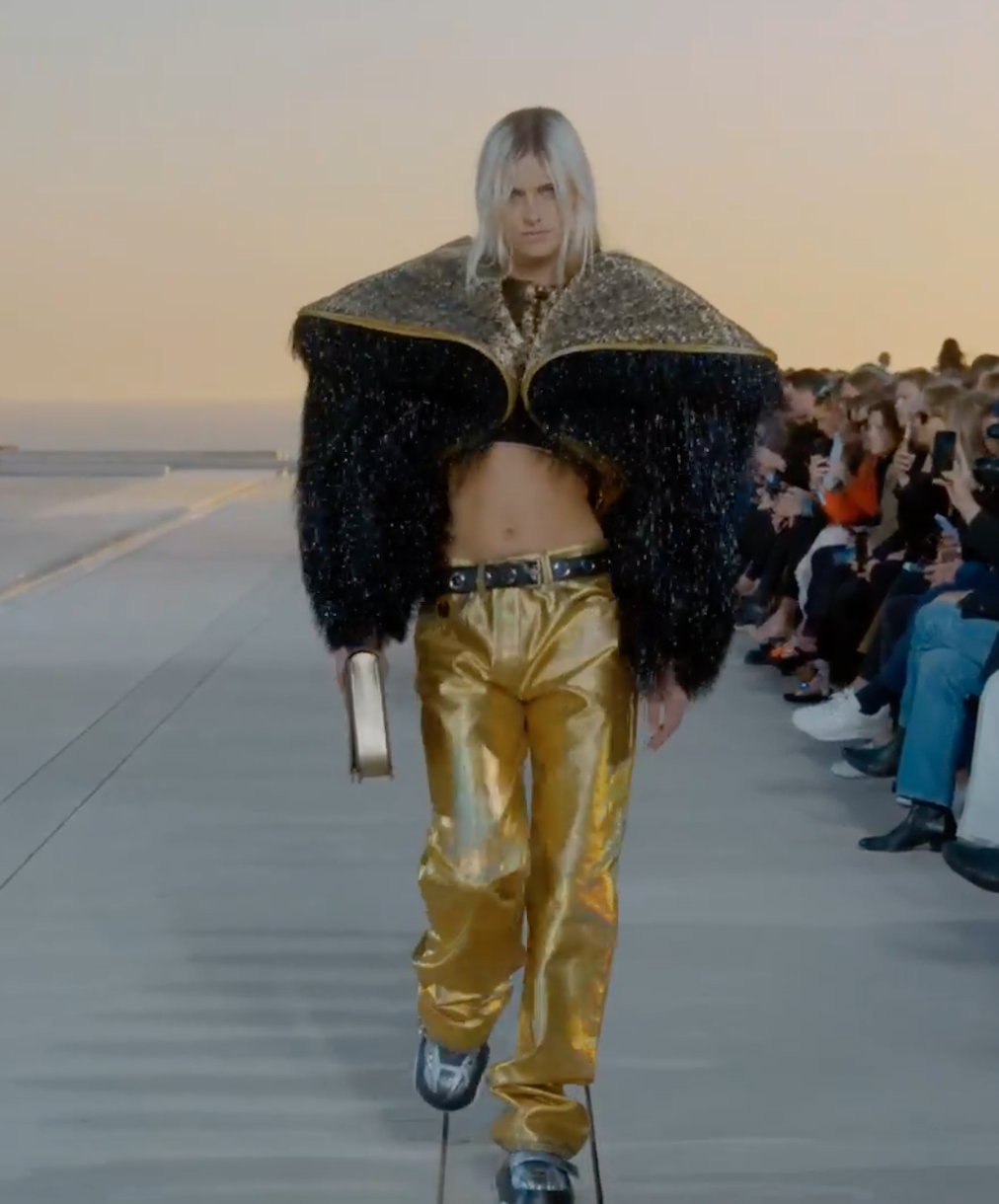 В приглашениях на показ было написано, что в коллекции почетным гостем является солнце. Энергия солнца была отражена в образах, которые были выдержаны в металлической палитре: графические куртки-бомберы, холодные металлические брюки золотого, медного и серебряного цвета и топы с жаккардовыми или светоотражающими блестками в паре с брюками из драпированного льна в кочевом стиле. Когда модели шли по подиуму, одежда гармонично сочеталась с закатом на горизонте Тихого океана.