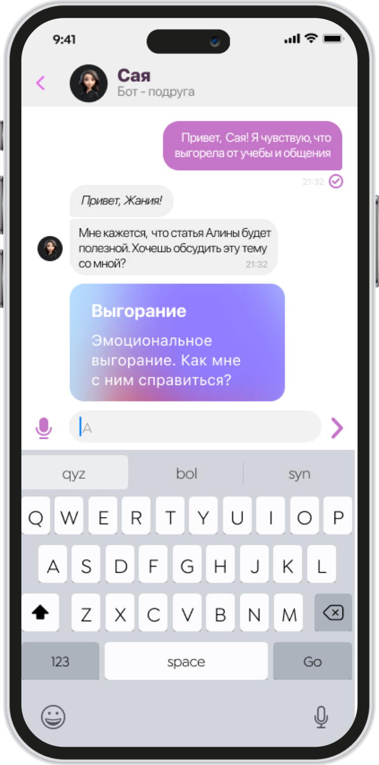 - Бот-подруга Сая: интерактивный AI-бот предлагает советы, делится полезными статьями и поддерживает девушек, отправляя добрые аффирмации вроде «Солнышко, ты со всем справишься!». Интеракции с ботом не будут похожи на ChatGPT, так как будут походить на реальный разговор двух ровесниц.