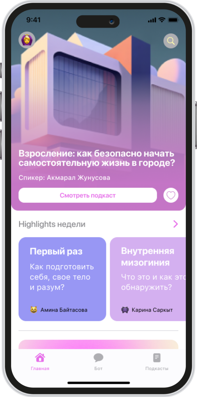 - Информационное поле: статьи и подкасты на темы безопасности, здоровья, отношений и саморазвития. Все, что современная девушка должна знать о себе, своем теле и своей безопасности, теперь в одном месте. Весь контент проходит строгий фактчекинг и доступен на трех языках, включая казахский, что делает платформу удобной для широкой аудитории.