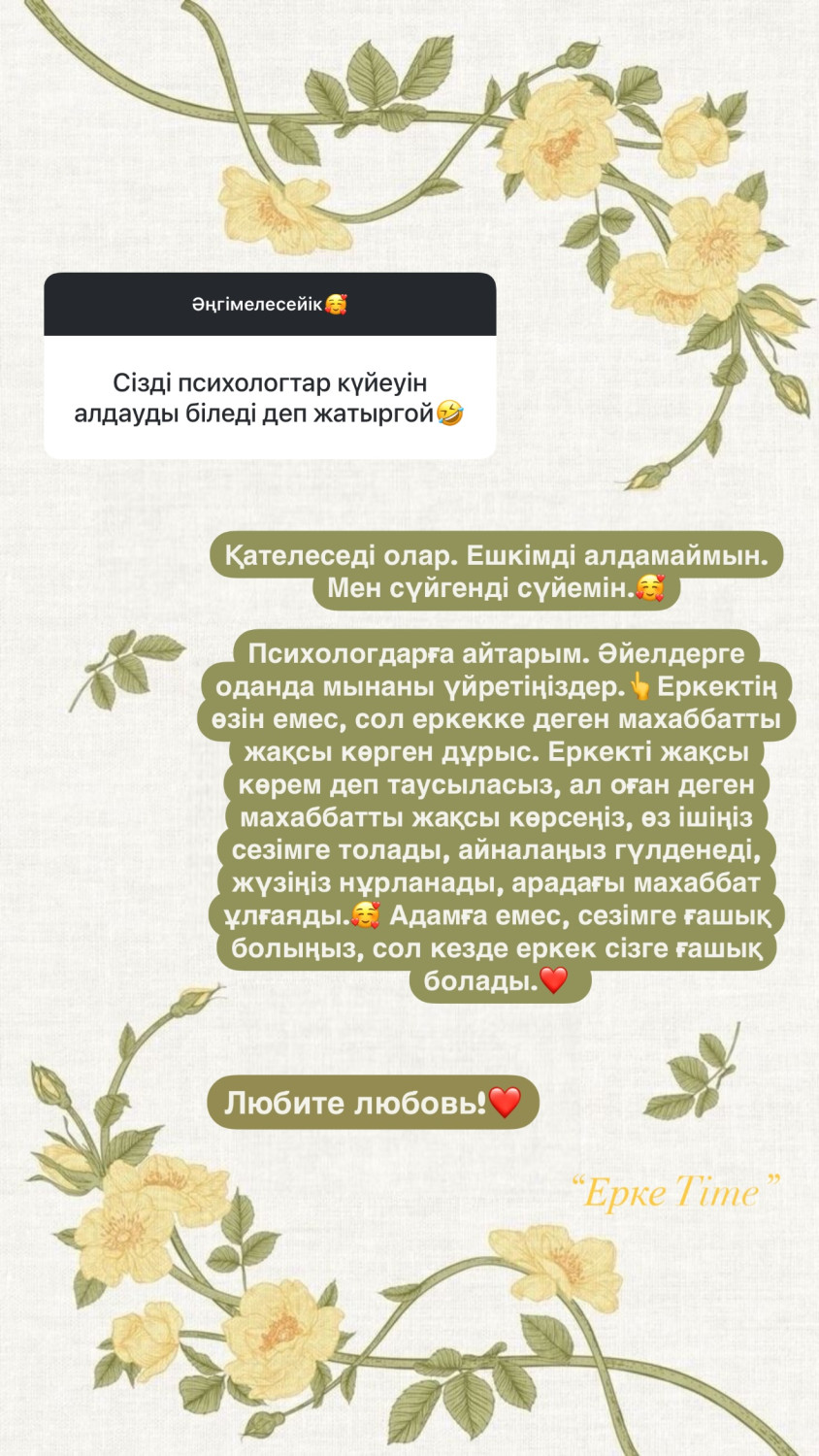 Еркенің оқырмандарының бірі «сізді психологтар күйеуін алдауды біледі деп жатыр ғой» деп жазған. Әнші бұл пікірге қатысты өз ойын айтты.