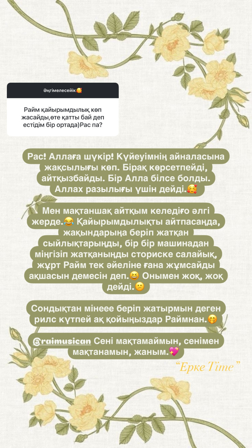 «Рас! Күйеуімнің айналасына жақсылығы көп. Бірақ, көрсетпейді, айтқызбайды. Мен мақтаншақ, айтқым келеді. Қайырымдылықты айтпасаң да, жақындарыңа беріп жатқан сыйлықтарыңды, бір-бір көліктен мінгізіп жатқаныңды сториске салайық, жұрт Райм тек әйеліне ғана жұмсайды ақшасын демесін деп. Онымен «жоқ, жоқ» дейді»,