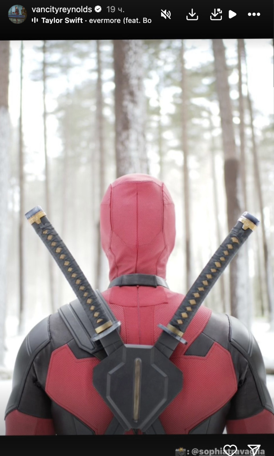В Instagram Story актер опубликовал кадр в образе Дэдпула, который стоит спиной к камере, повторив обложку альбома Evermore Тейлор Свифт, добавив к публикации ее песню. Осталось дождаться премьеры, чтобы проверить, снялась ли певица в фильме или нет.