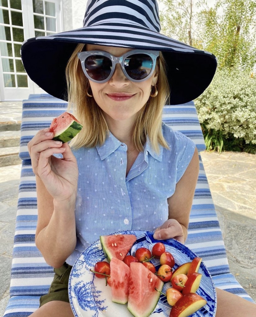 44-летняя актриса и продюсер в своем Instagram поделилась по-настоящему летним фото. На нем Риз позирует в очках и шляпе собственного бренда Draper James с фруктовой тарелкой в руках.
