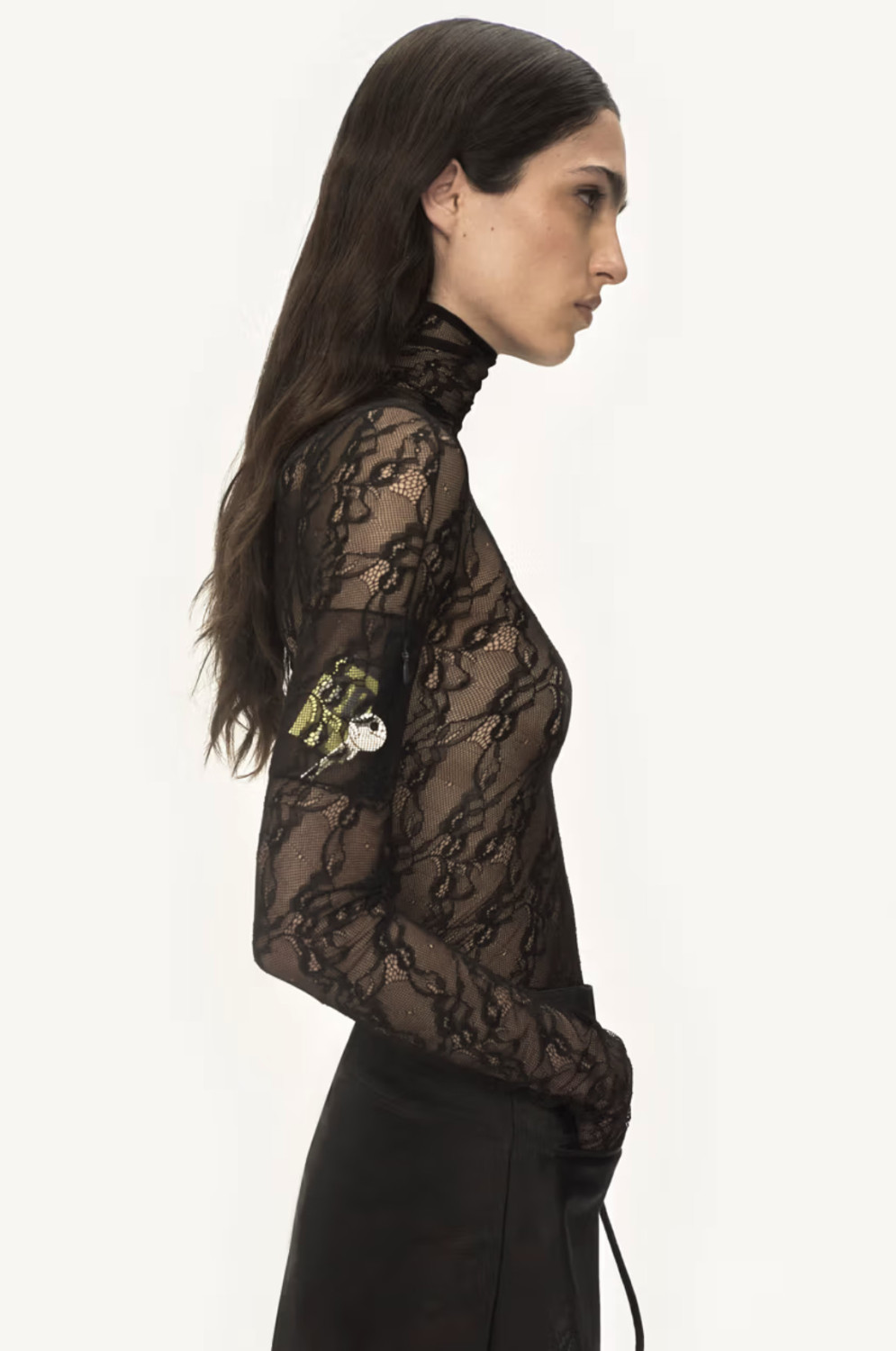 Стоит отметить, что в коллекции представлены образы для самых разных обстоятельств. Платья из прозрачных материалов, таких как металлическая сетка и кружево, станут отличным решением для вечерних выходов, а боди с акцентным замком, классические юбки на низкой посадке и кожаные брюки-клеш — для повседневности.