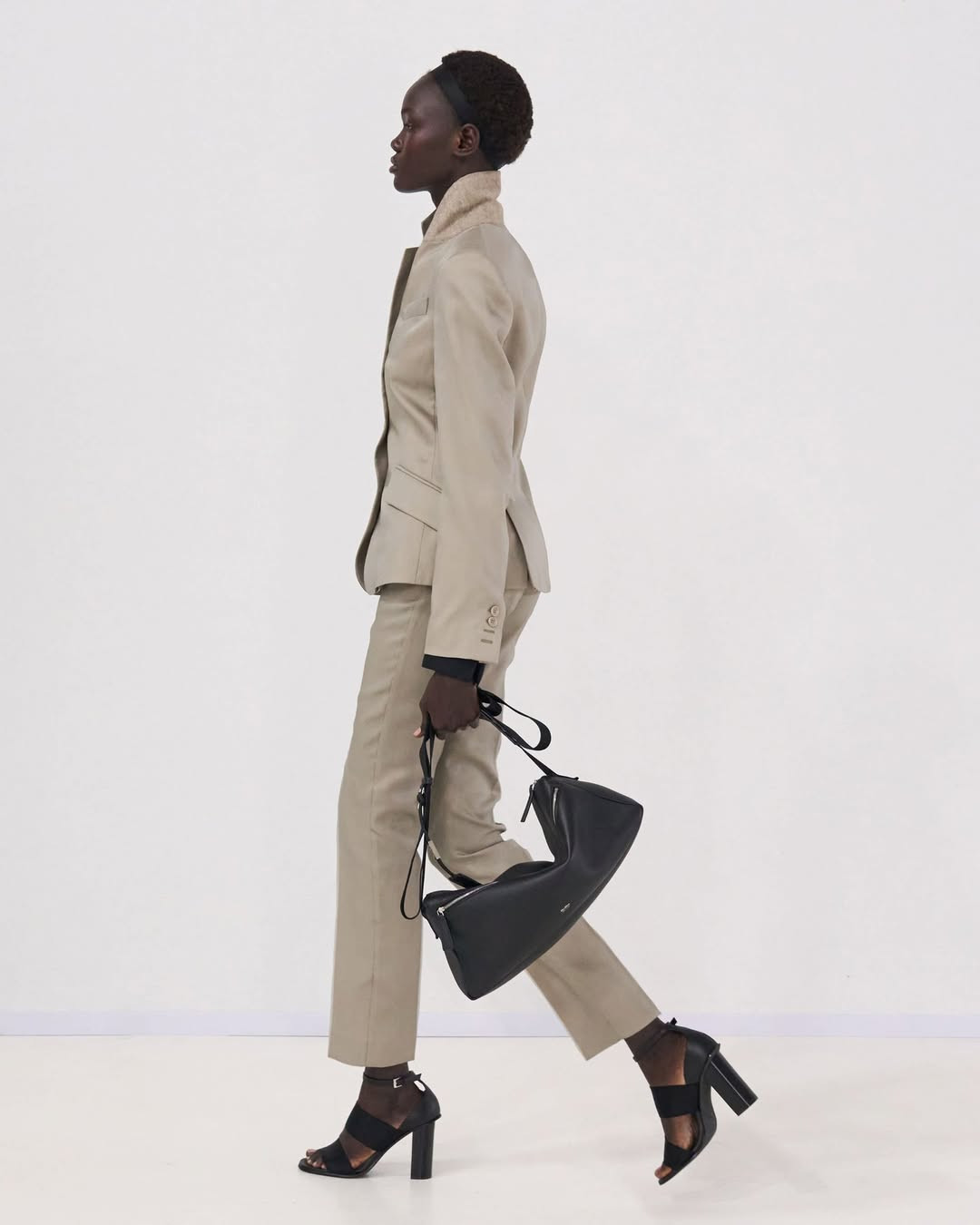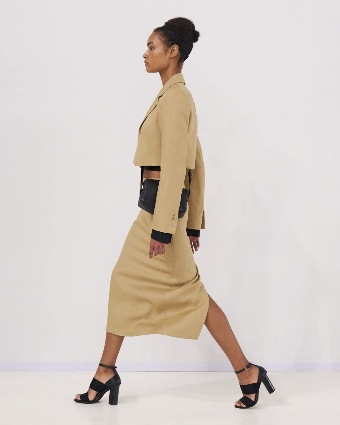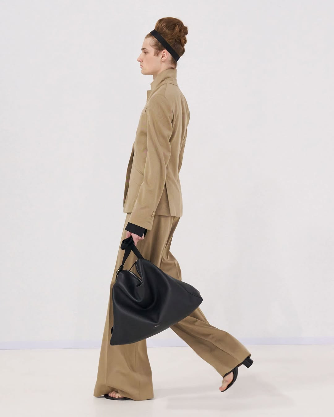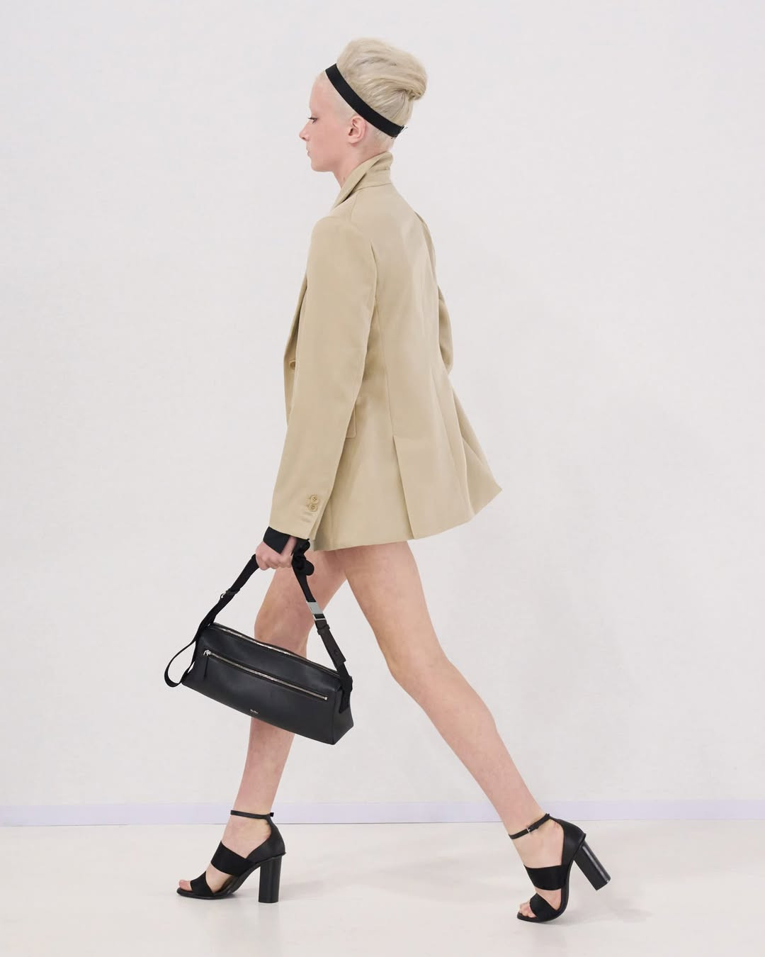 Этот акцент на талии логично перекликается с прическами моделей. Волосы были уложены в аккуратные пучки, а черные резинки, привычные для проверки осанки у танцоров, использовались как аксессуары — на оголенном животе или поверх строгих пиджаков и платьев с открытой спиной.