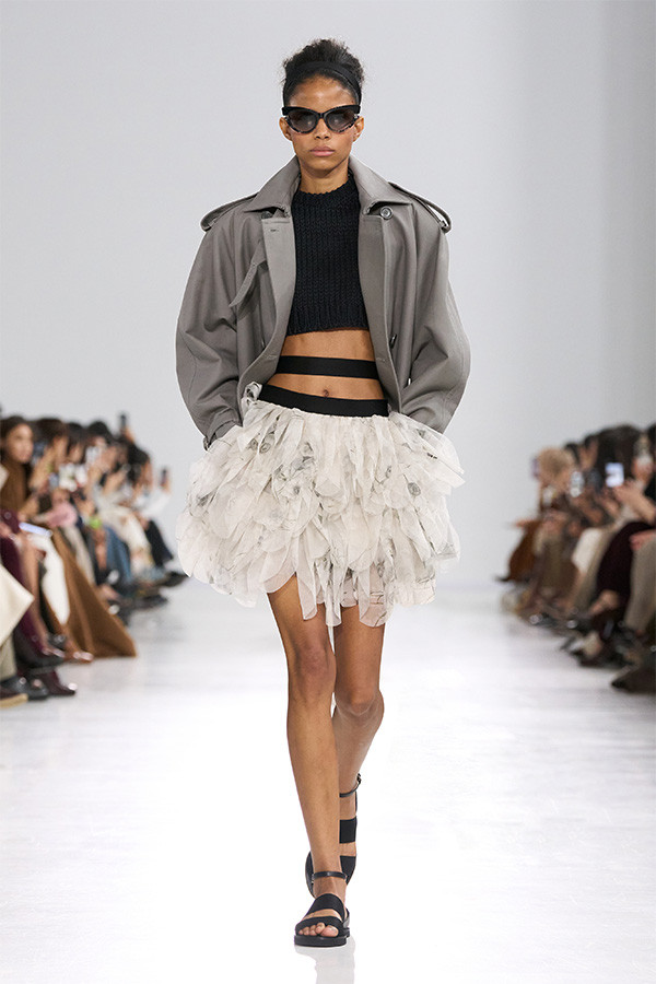 Гриффитс не стал предлагать нам прямую костюмную реконструкцию прошлого. Показ открылся образом, который сразу задавал настроение всей коллекции. Вслед за ним появились строгие костюмы в эстетике 1780‑х и 1980‑х годов, длинные пальто с разрезами, тренчкоты с воротником-стойкой и юбки из сотен сложенных кусочков органзы. Фаворит редакции? Невесомые накидки, словно снятые прямо с репетиций балетной труппы — отсылка к страсти мадам де Помпадур, которая не только заказывала оперные постановки, но иногда сама принимала в них участие.