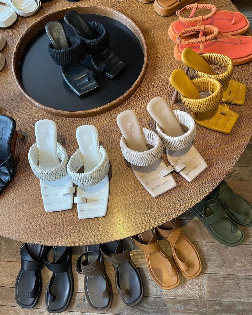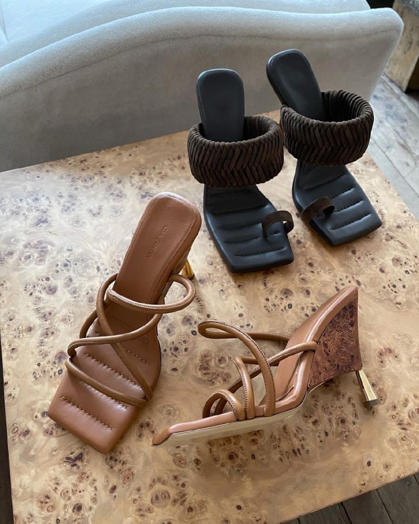 В серию вошли босоножки на каблуках с квадратным носом, мюли, а также сандалии на плоской подошве. Обувь сделана вручную из замши, дерева и плетеной кожи.