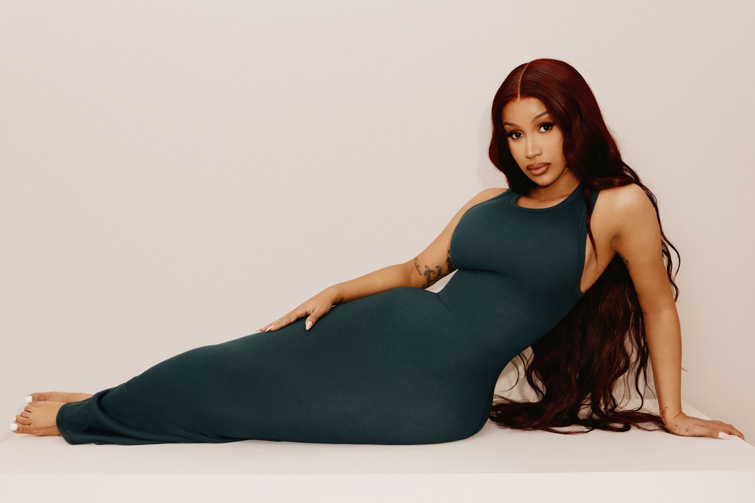 На снимках Карди демонстрирует свои изгибы в платье, облегающем фигуру, леггинсах с топом и нижнем белье. Новый дроп хлопковой линии выполнен в осенней цветовой палитре: сапфировый синий, приглушенный зеленый, пепельно-серый и цвет слоновой кости.