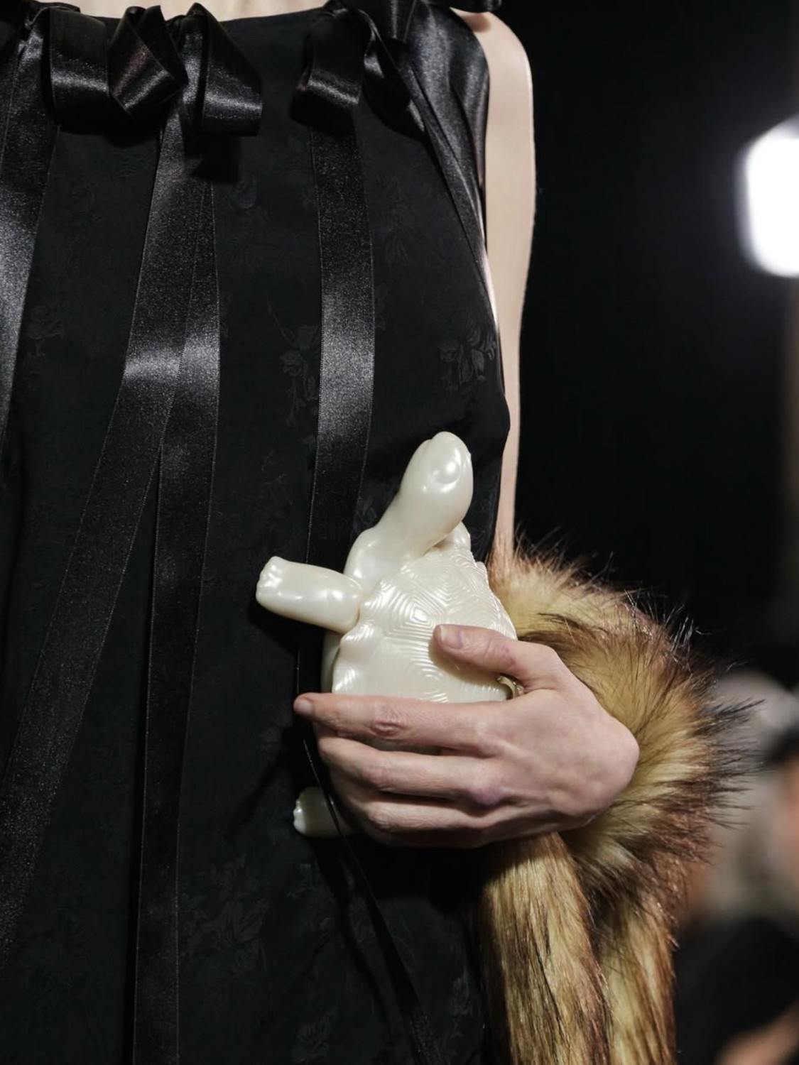 На презентации новой коллекции Simone Rocha подиум заполнили… кролики! Эти пушистые создания, изготовленные из искусственного меха, выглядывали из сумок и даже превращались в милые муфты. Компанию им составили клатчи-черепахи, будто намекая: главное — не скорость, а путь.
