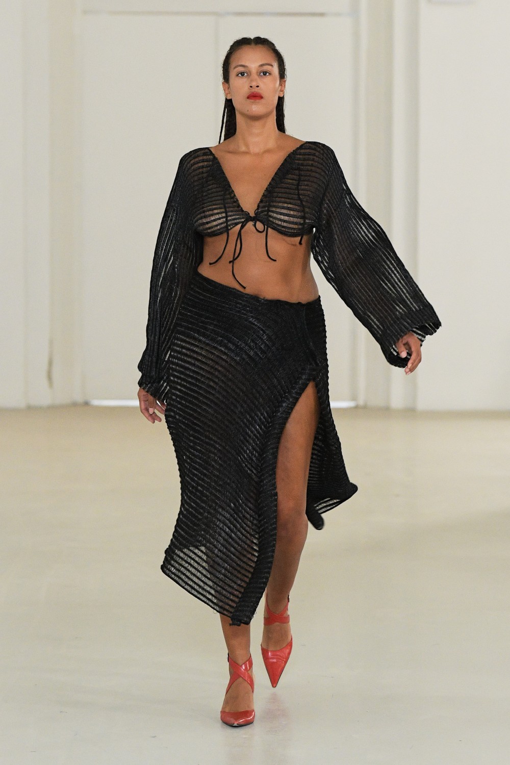Коллекция в черном цвете изобилует глубокими текстурами, необработанными краями и потертостями. В ней смешаны европейская панк-культура со ссылками на одежду рабочих, а готические и религиозные элементы, в свою очередь, становятся прекрасным дополнением к силуэтам. Стоит отметить, что ранее Питер Лундвальд Нильсен работал в Balenciaga, Vetements и Ottolinger.