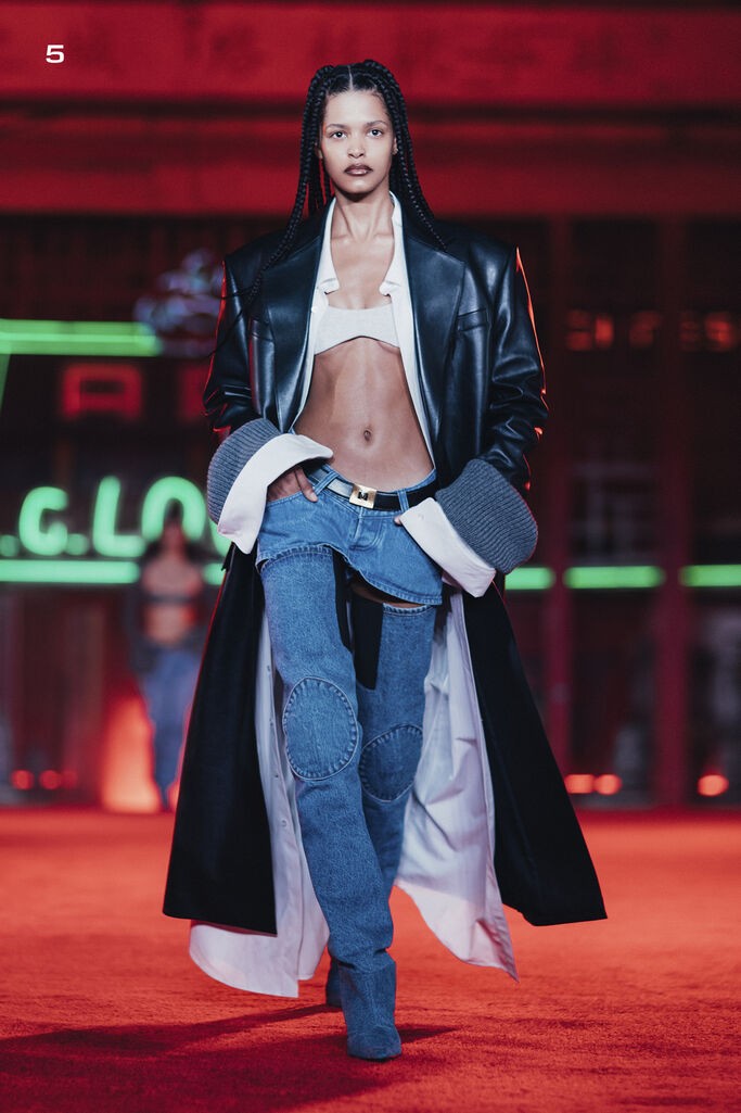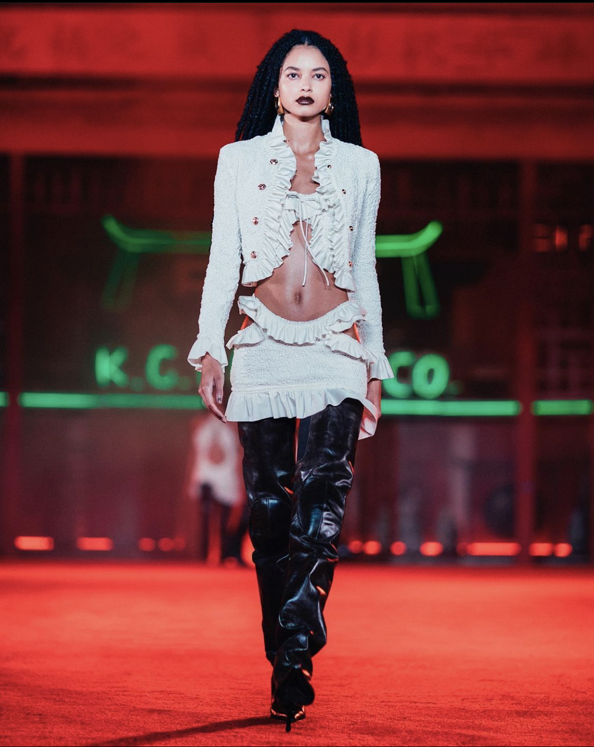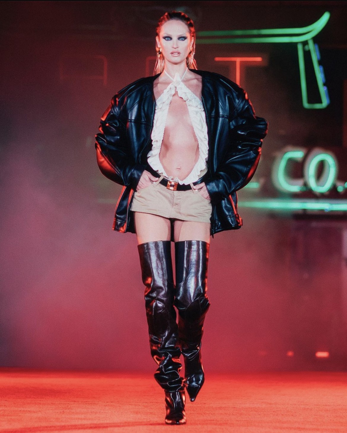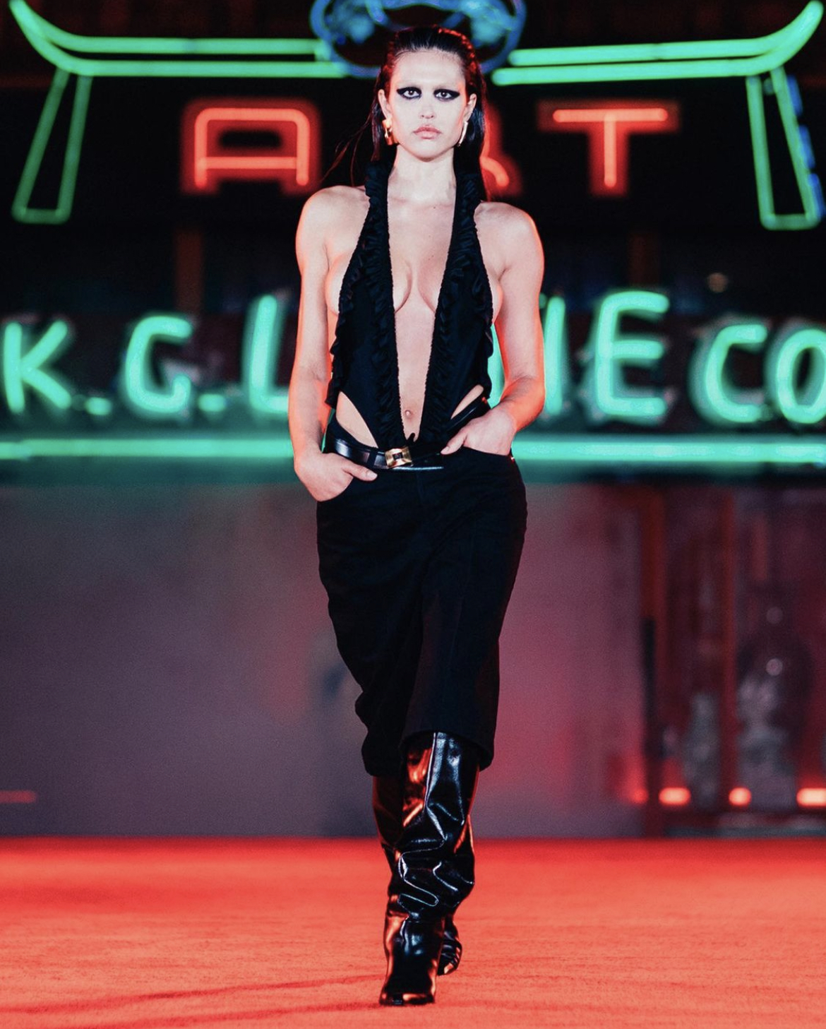 В коллекции были представлены кроп-топы с оборками и рюшами, жакеты оверсайз, а также микро юбки. Конечно же не обошлось без акцентов в виде низкой талии, а дерзости образам добавили экстра высокие ботфорты, которые предлагалось заправлять прямо в штаны.