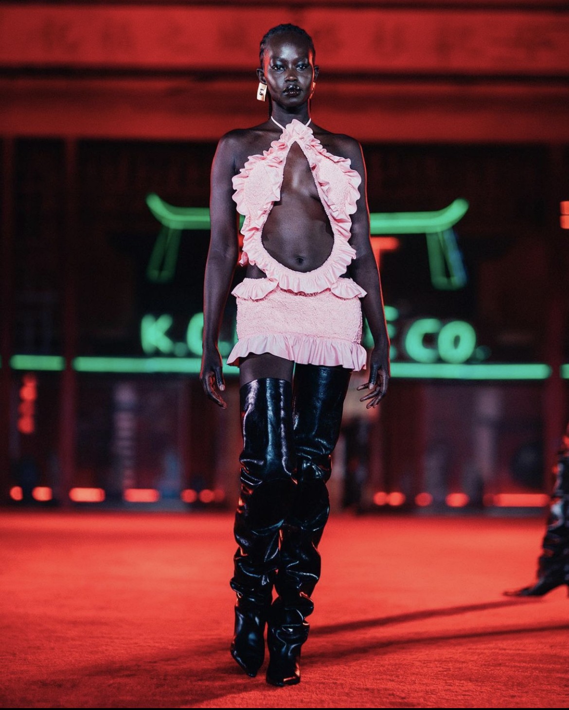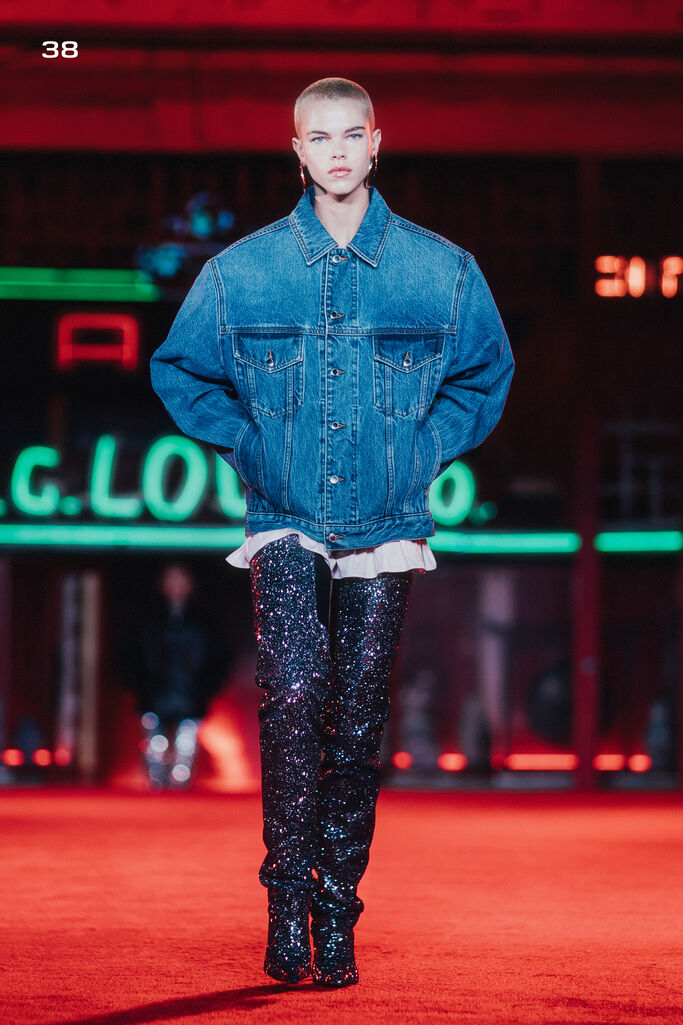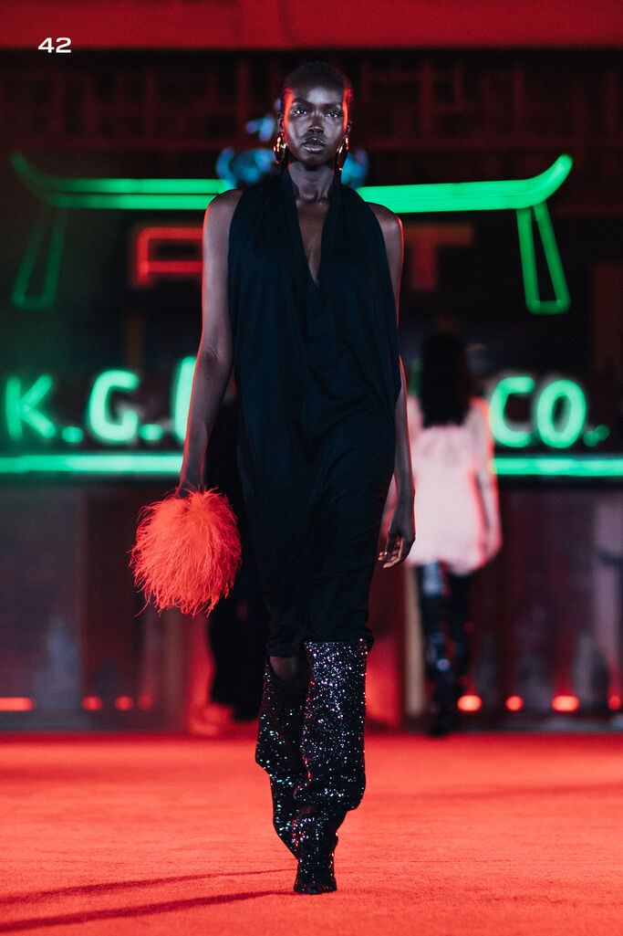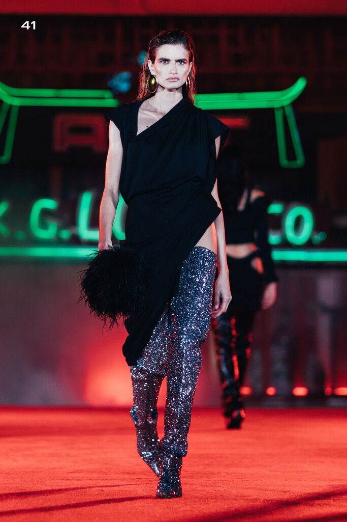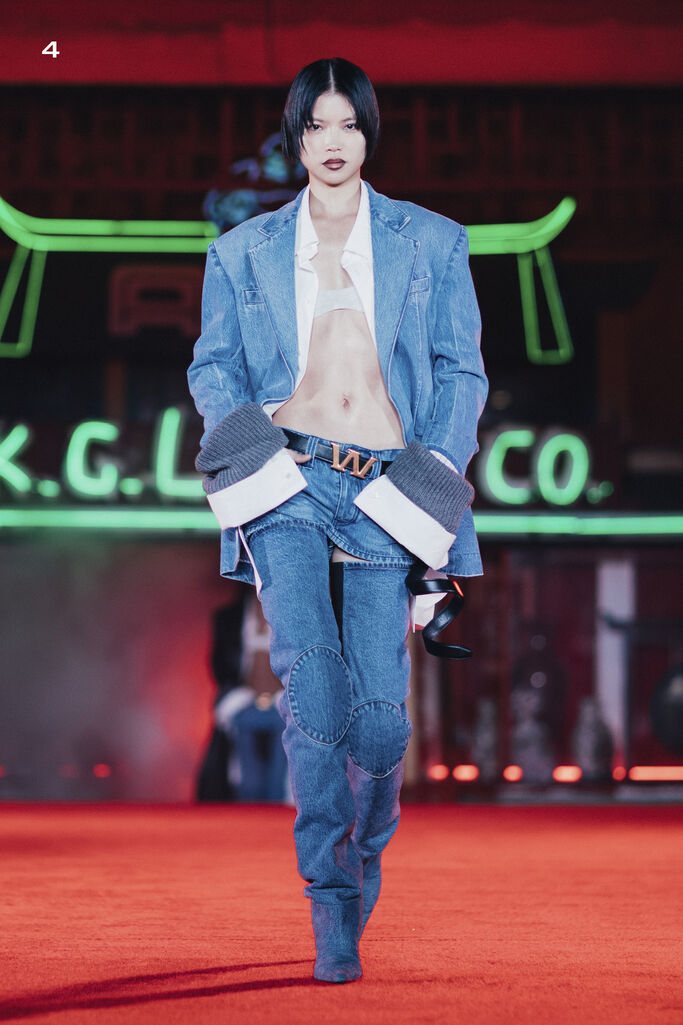 В коллекции были представлены кроп-топы с оборками и рюшами, жакеты оверсайз, а также микро юбки. Конечно же не обошлось без акцентов в виде низкой талии, а дерзости образам добавили экстра высокие ботфорты, которые предлагалось заправлять прямо в штаны.