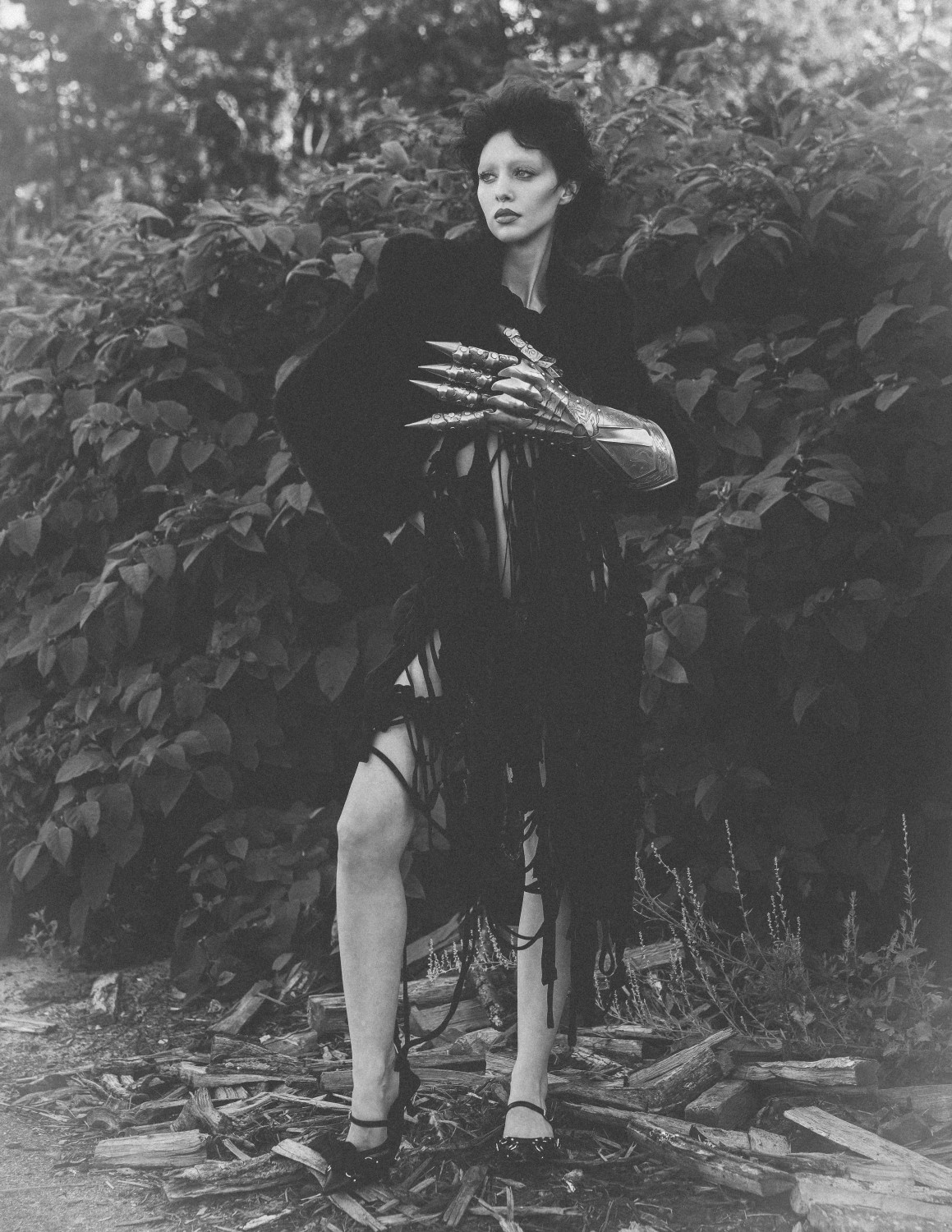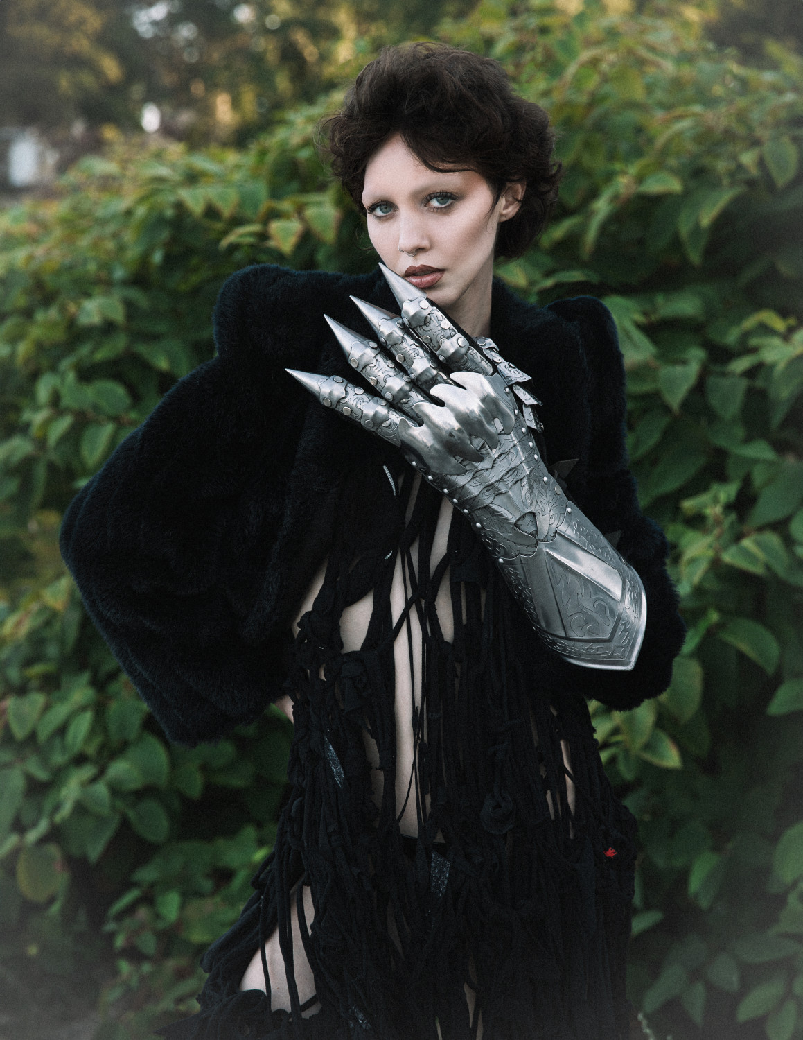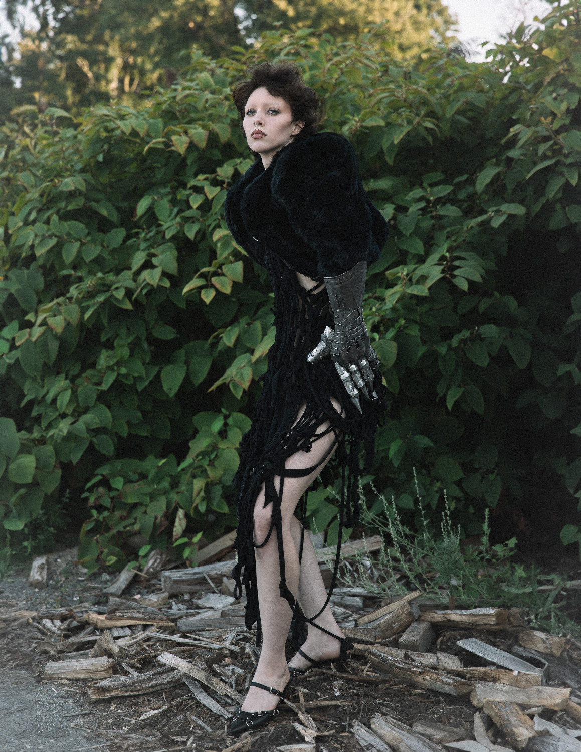 На Шелби. Шуба: Sasson / @thefiercelane; Юбка: Kurriizmatic / @kurriizmatic; Перчатка-броня: Thor Instruments.