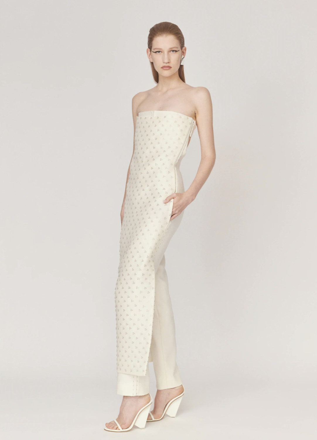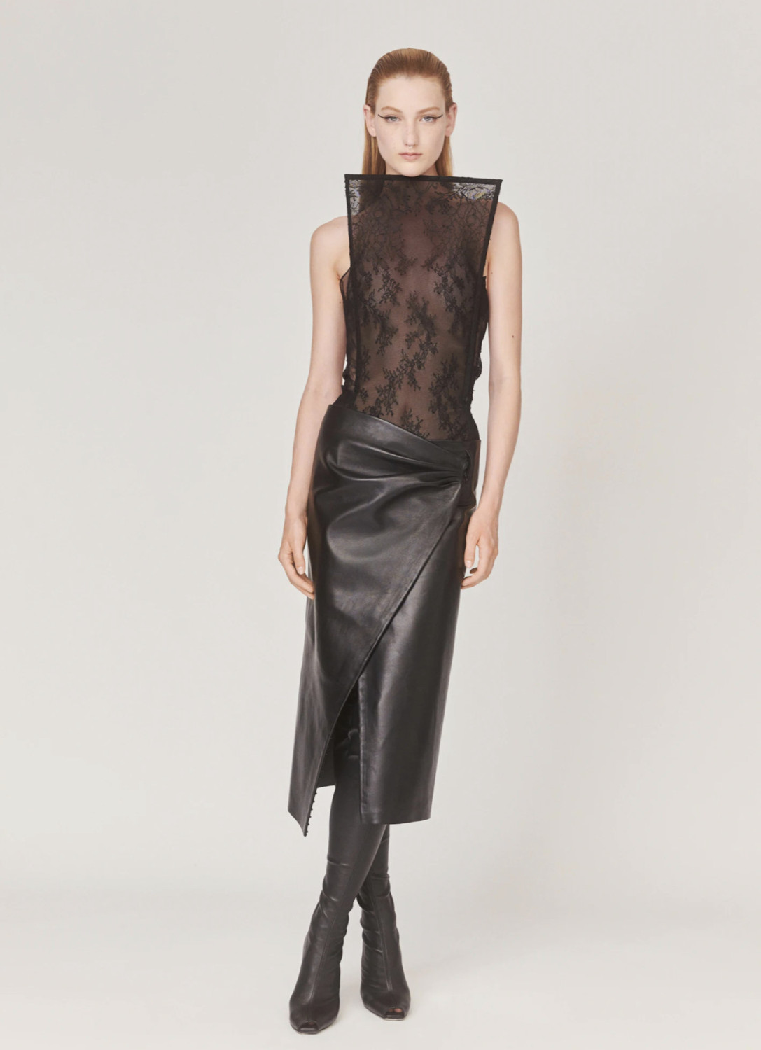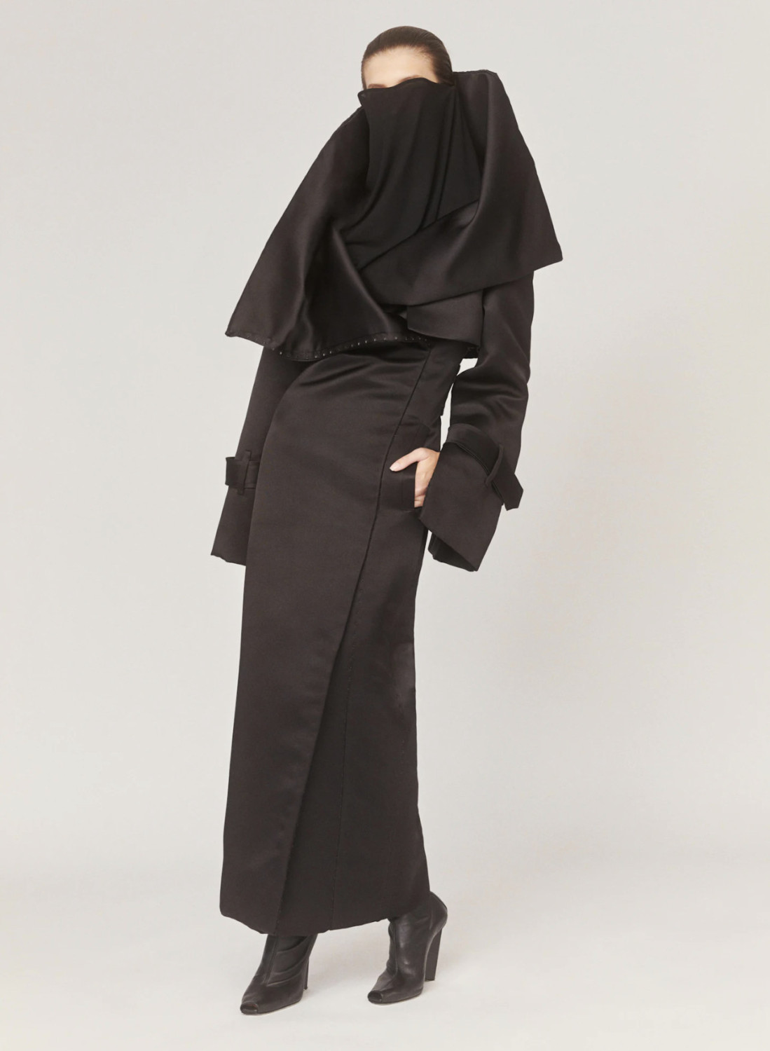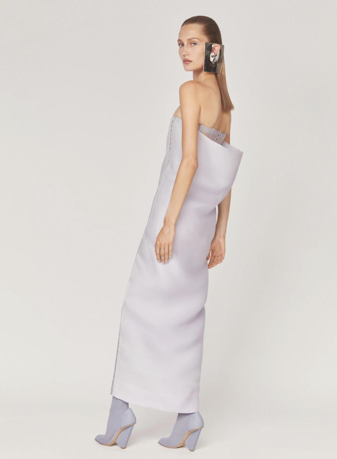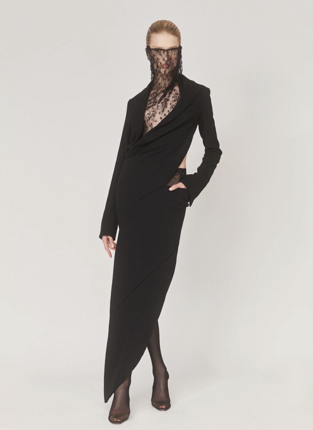 Штаб-квартира JPG на улице Сен-Мартен превратилась в суровый белый зал с невероятно узким подиумом. В его стенах Феличе продемонстрировал, что происходит, когда дизайнер-минималист встречается с архивом максималистского дома. Количество деталей сводится на «нет», палитра становится монохромной, силуэты — обтекаемыми, а образы — еще более скульптурными. Парадоксально, но в результате этого дом направился в более современное русло, сохранив при этом все то, что так любит Готье: корсеты, театральность, исследование женского тела и отсылки к далеким культурам.