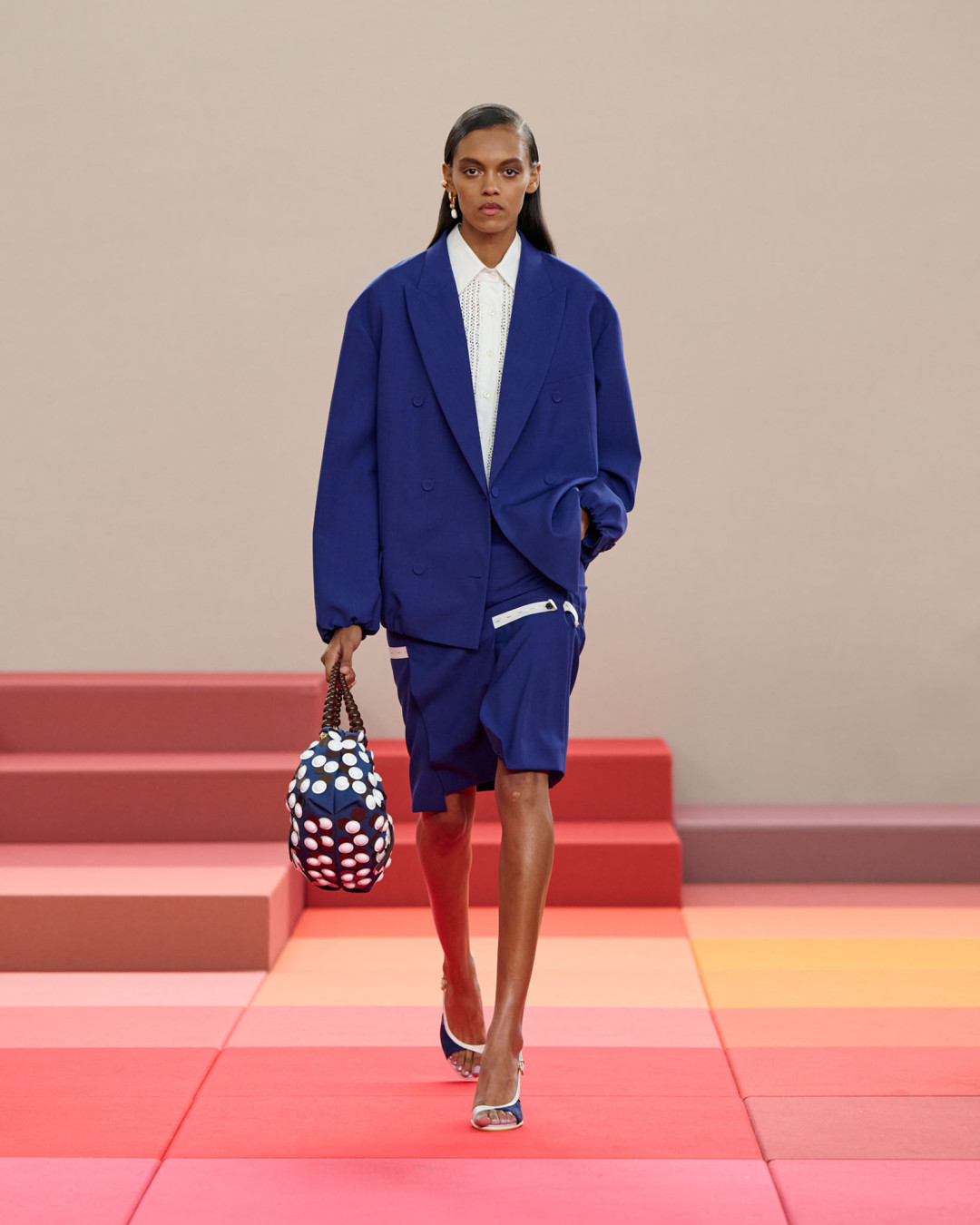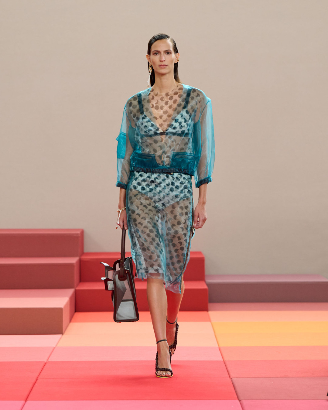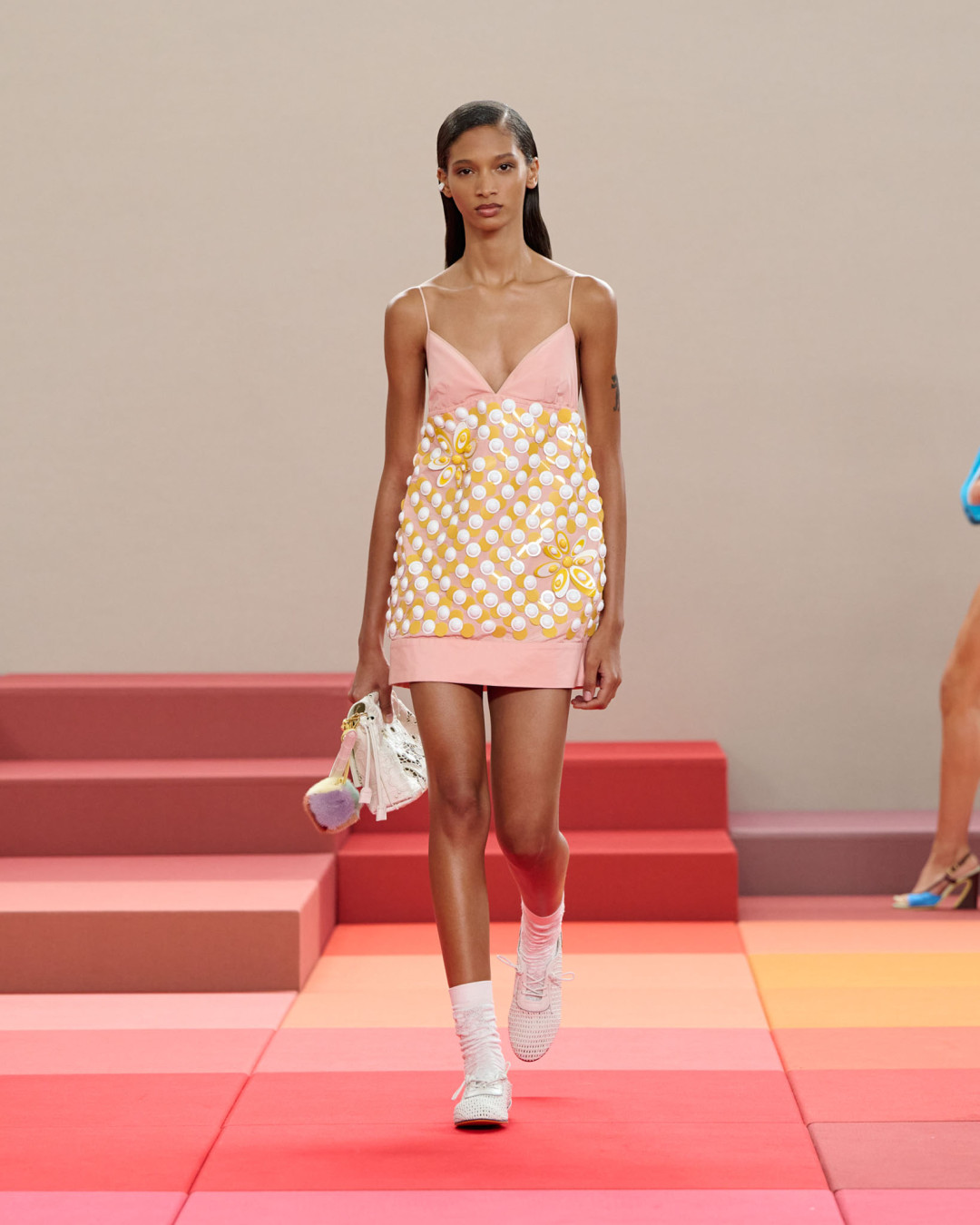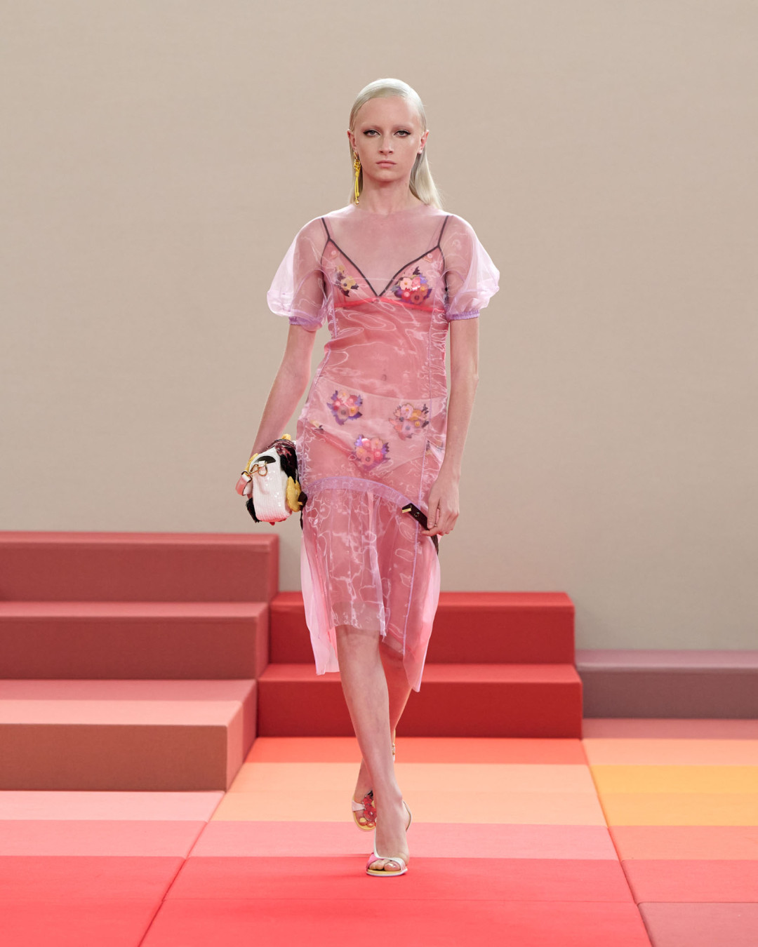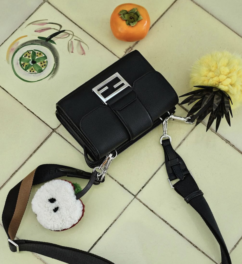 Сумки Peekaboo с пайеточной отделкой, скрытой внутри, Baguette из трикотажа в тон образам, модели с ручками из деревянных бусин — не меньшую роль играли в коллекции аксессуары. И все же главным фаворитом редакции стали брелоки-яичницы, которые модели несли в руках. Ироничный и слегка абсурдный жест, но именно он сделал шоу Fendi столь запоминающимся.