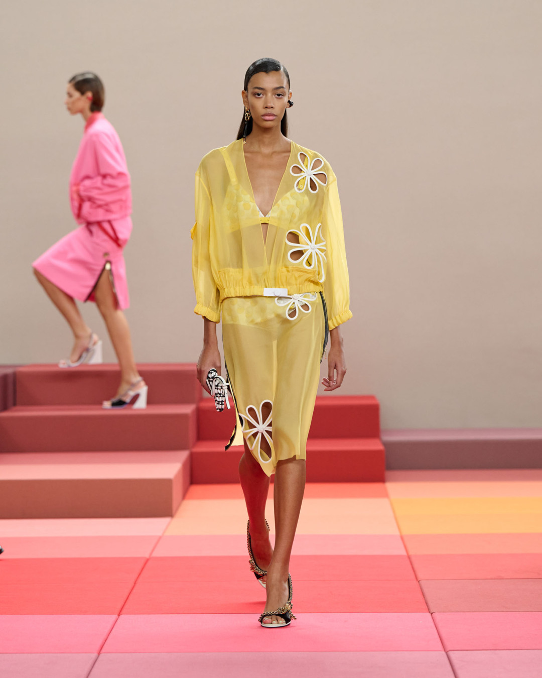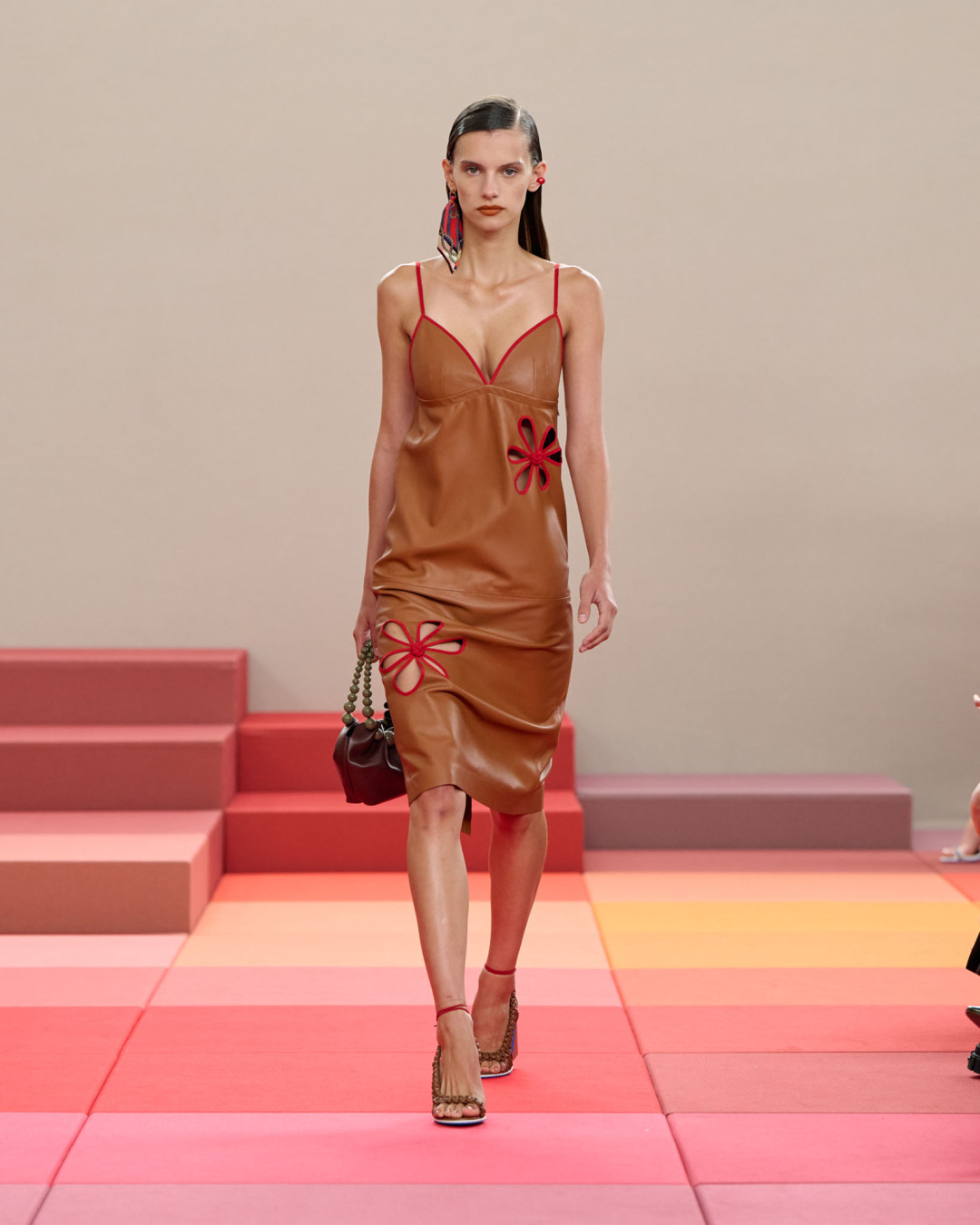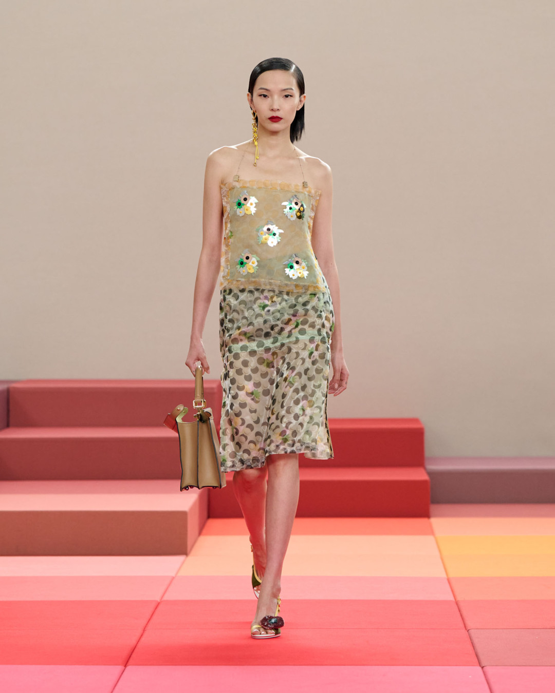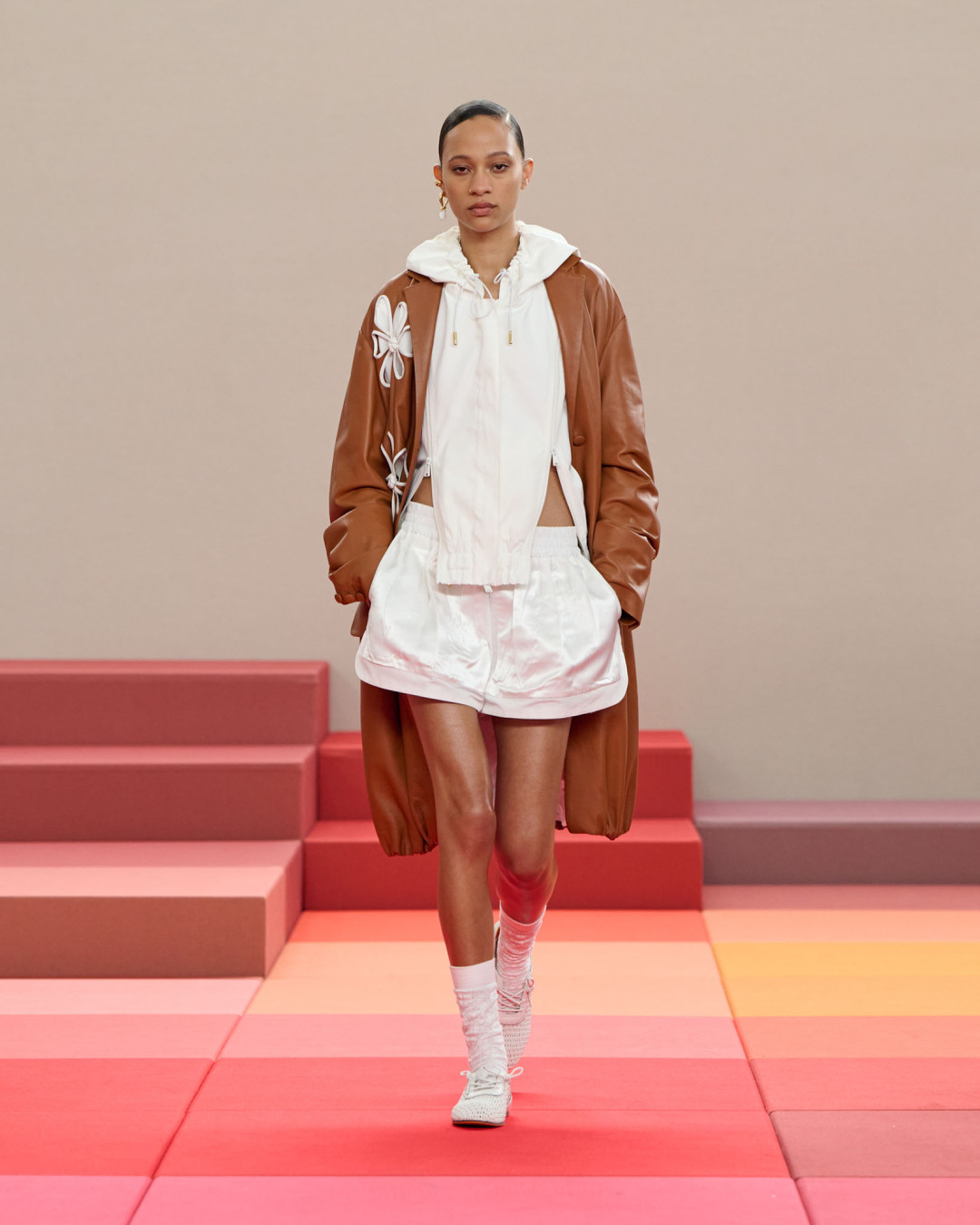 Стоит отметить, что цветы — ромашки и пионы — стали главным мотивом коллекции. Они появлялись на каждом шагу: вырезанные из кожи, словно бумажные силуэты, вышитые на прозрачных платьях, превращенные в объемные 3D-аппликации. В этих цветах было что-то от поп-арта, но с примесью японской психоделики. Как если бы Уорхол встретился с Такаши Мураками и вместе придумали сад мечты.