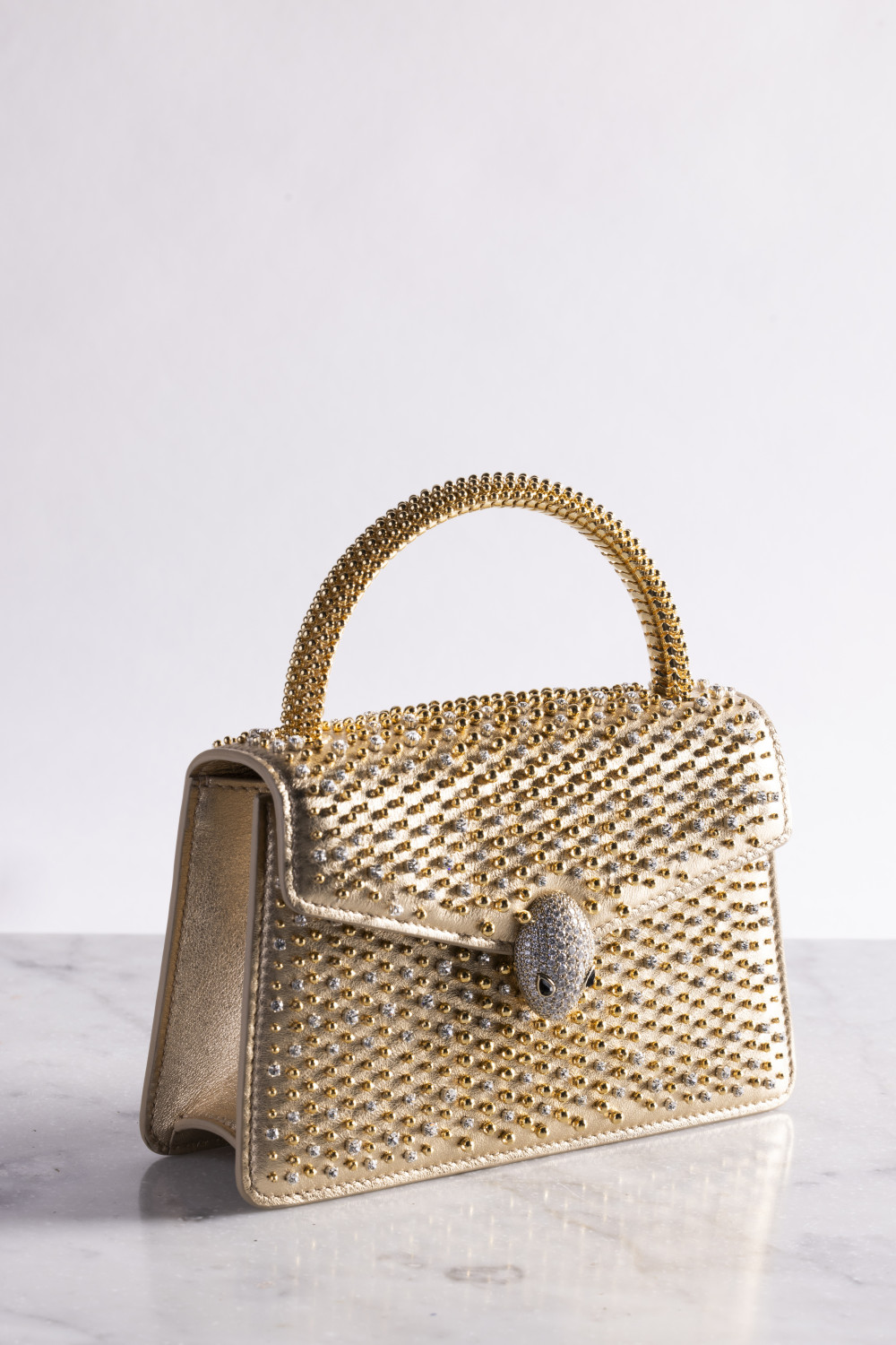 Коллекция Serpenti Forever вновь раскрывает свою многогранную натуру, представляя сумку Serpenti Pallini. Ее металлическая ручка, состоящая из 55 элементов с миниатюрными бусинами, собирается вручную без сварки, придавая аксессуару плавные формы и тактильную привлекательность. А корпус модели выполнен из золотистой телячьей кожи с эффектом жидкого металла и декорирован 1260 позолоченными латунными бусинами и коническими камнями.