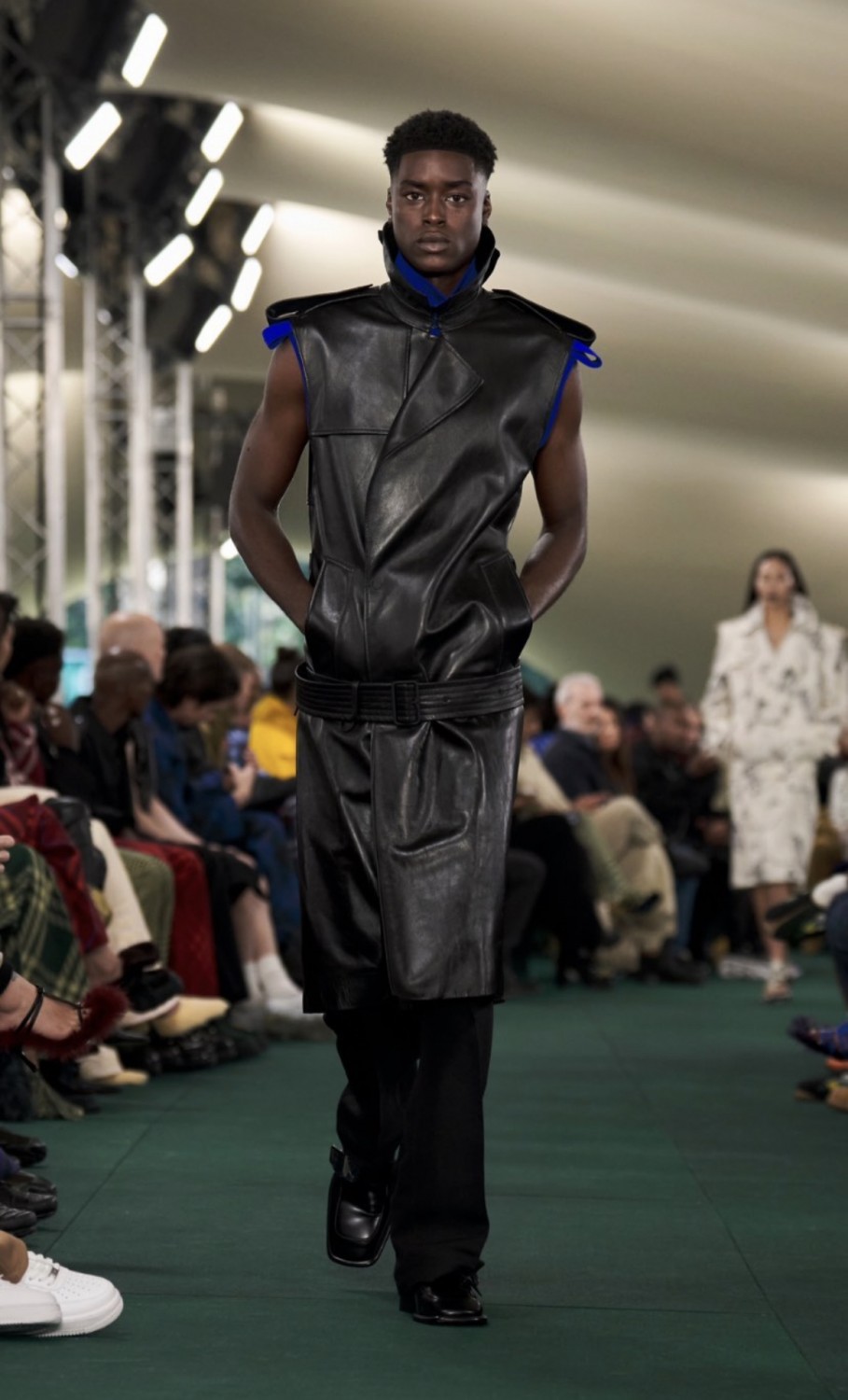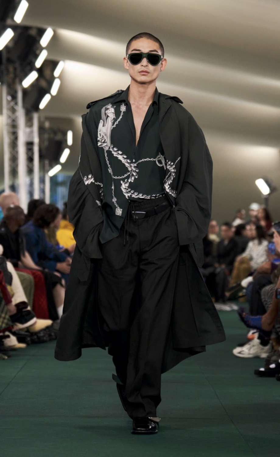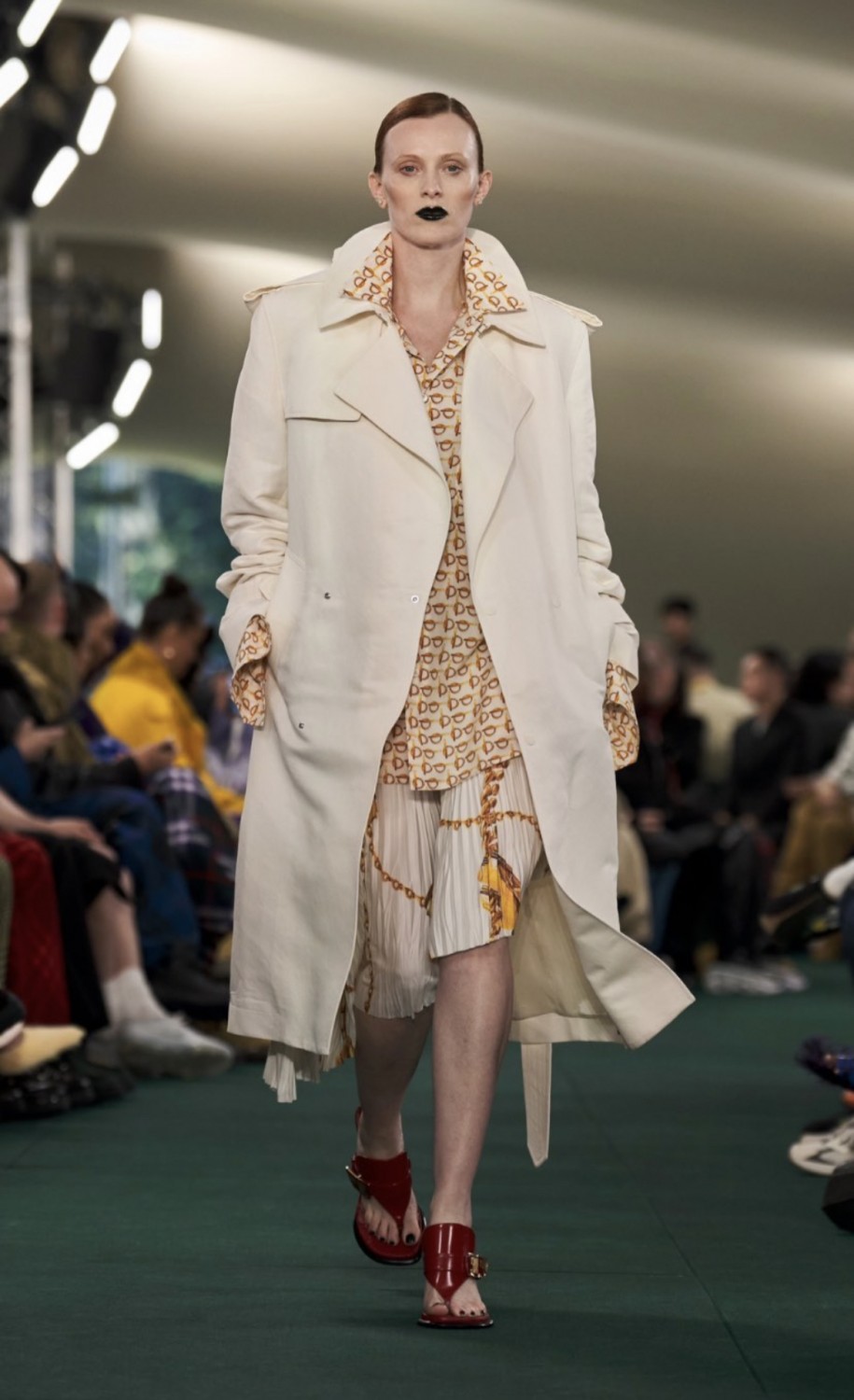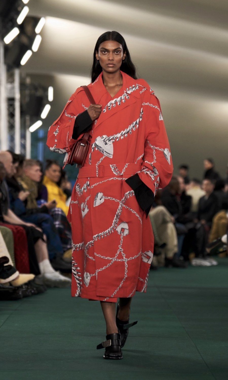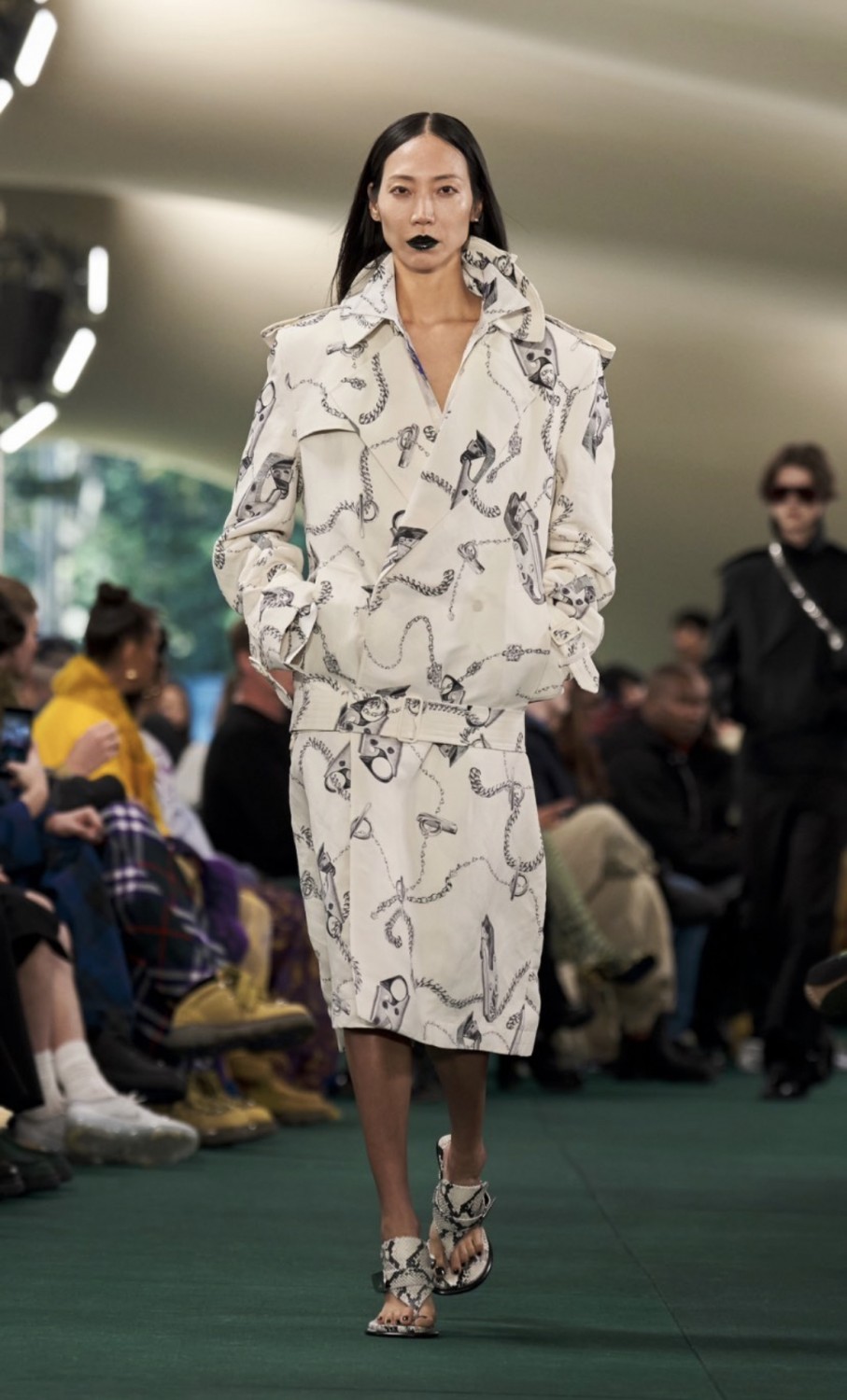 Локацией для показа SS24 послужил тартановый шатер посреди городского леса в Лондоне. Первым на подиуме появился тренчкот, который является неотъемлемой частью ДНК Burberry. Однако в новом сезоне он приобрел новое прочтение. Заниженная талия и объемные плечи, односторонний лацкан и черный цвет — Дэниел придал ему новое дыхание с помощью необычного кроя и деталей. Далее последовали и другие тренчи: из кожи, без рукавов и с графичным принтом, вдохновленным карабинами и цепями.